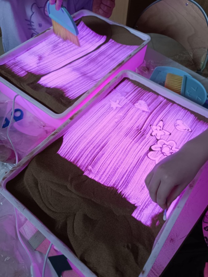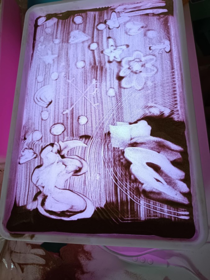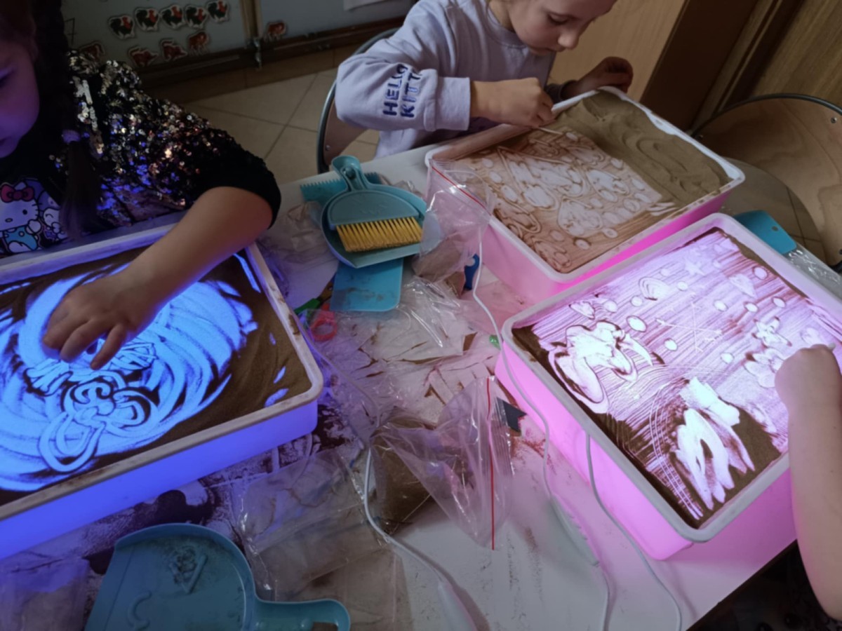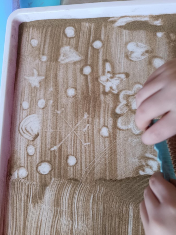 Rozwijanie wyobraźni, ćwiczenie palców, dłoni, koordynacji ruchów rąk, może towarzyszyć również rysowaniu piaskiem. Drobne ziarenka piasku, przemieszczane na powierzchni podświetlanej tablicy, palcami lub rysikami o różnych kształtach, tworzą obrazy z wyobraźni. Mogą im towarzyszyć litery, figury, które pojawiają się naturalnie i pozostawiają ślad poznawczy w pamięci. Zmieniające się kolory nadają szczególny klimat powstającym rysunkom; ocieplają je, schładzają. Tło rysunków może być niebem, letnim słońcem, wypływającą lawą, taflą jeziora, łąką, czy śnieżną powierzchnią. Delikatna muzyka, towarzysząca rysunkom, sprzyja wyciszeniu i koncentracji. Rysowanie na różne sposoby rozwija kreatywność, a powstawanie, wyłanianie się, z nawet niewielkiej ilości piasku, nowych zaskakujących obrazów, rozwija sprawczość i przynosi satysfakcję z pojawiających się własnych, ciekawych pomysłów.