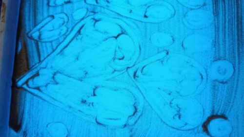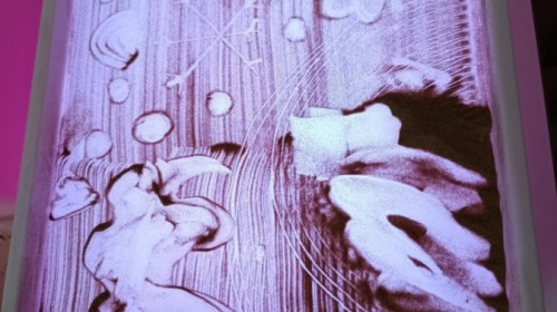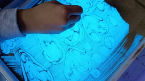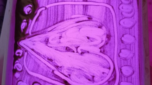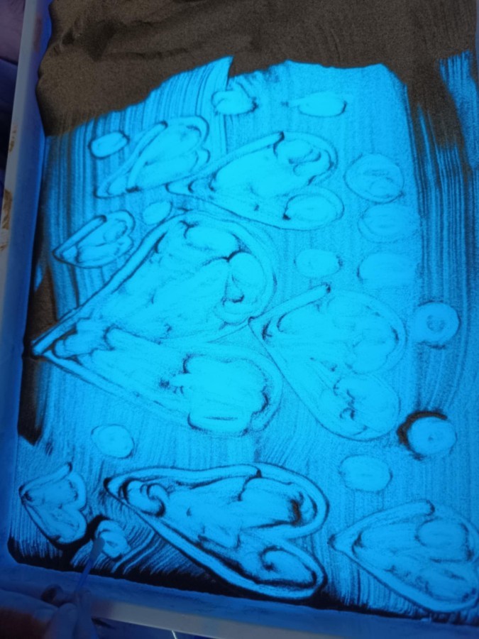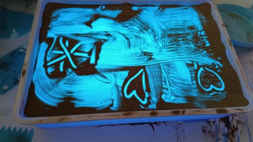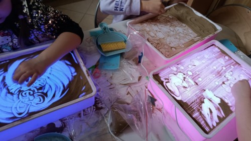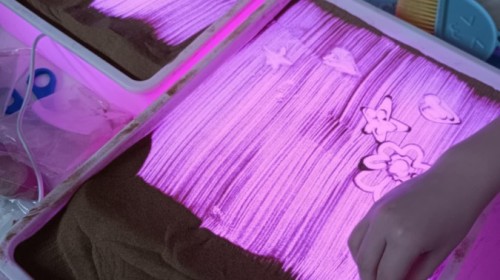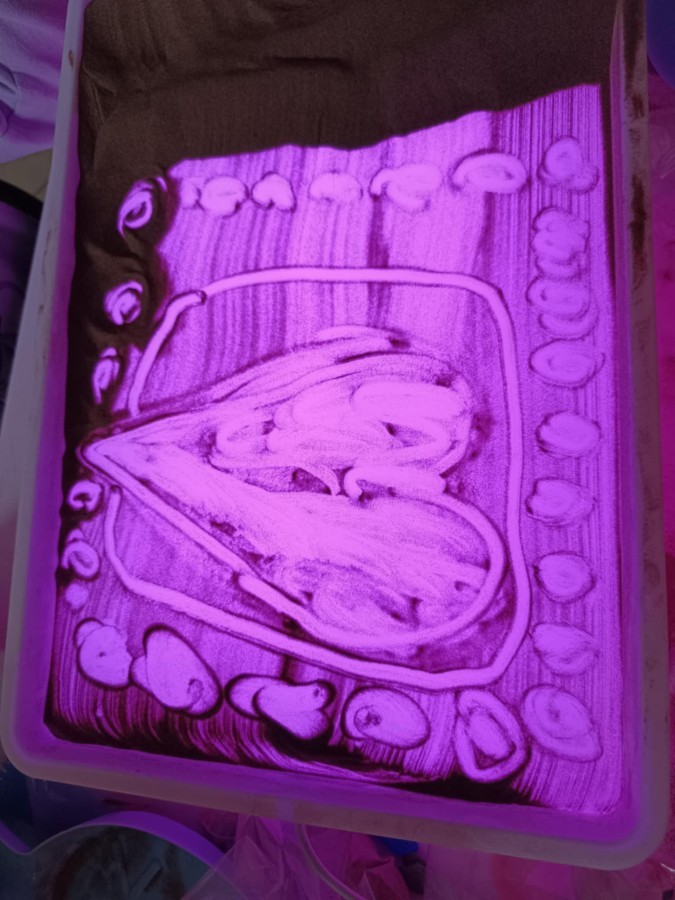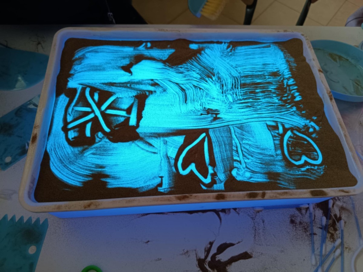 Rozwijanie wyobraźni, ćwiczenie palców, dłoni, koordynacji ruchów rąk, może towarzyszyć również rysowaniu piaskiem. Drobne ziarenka piasku, przemieszczane na powierzchni podświetlanej tablicy, palcami lub rysikami o różnych kształtach, tworzą obrazy z wyobraźni. Mogą im towarzyszyć litery, figury, które pojawiają się naturalnie i pozostawiają ślad poznawczy w pamięci. Zmieniające się kolory nadają szczególny klimat powstającym rysunkom; ocieplają je, schładzają. Tło rysunków może być niebem, letnim słońcem, wypływającą lawą, taflą jeziora, łąką, czy śnieżną powierzchnią. Delikatna muzyka, towarzysząca rysunkom, sprzyja wyciszeniu i koncentracji. Rysowanie na różne sposoby rozwija kreatywność, a powstawanie, wyłanianie się, z nawet niewielkiej ilości piasku, nowych zaskakujących obrazów, rozwija sprawczość i przynosi satysfakcję z pojawiających się własnych, ciekawych pomysłów.