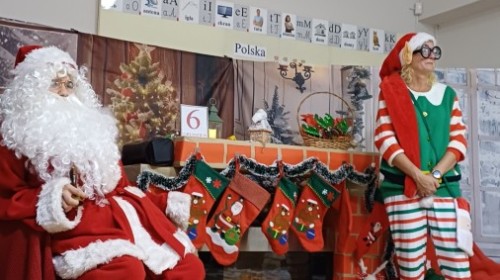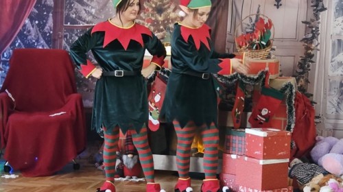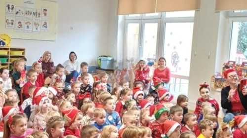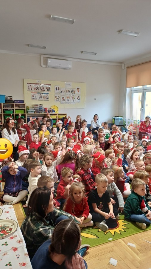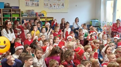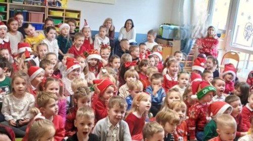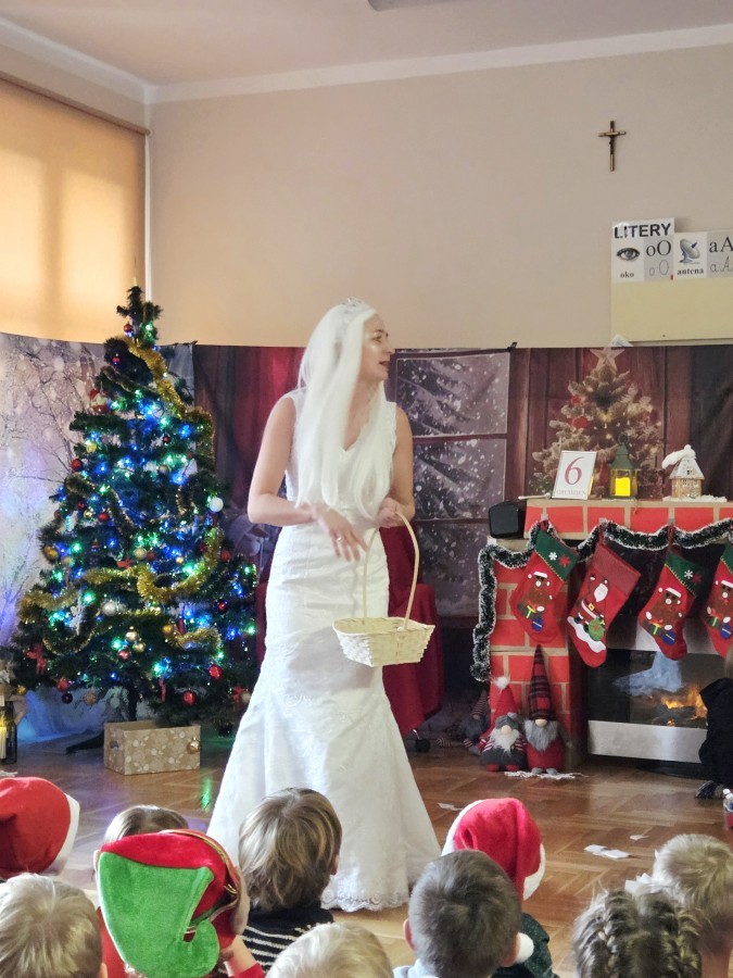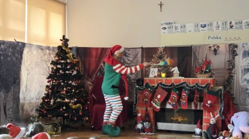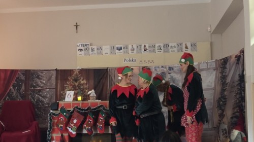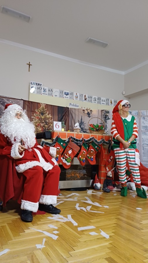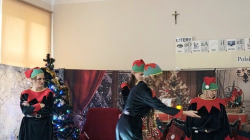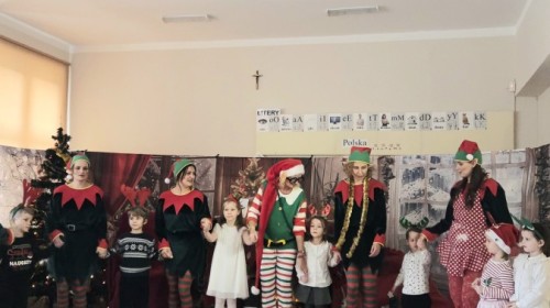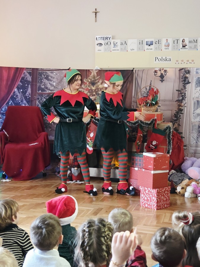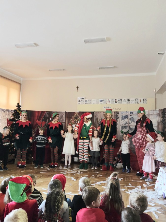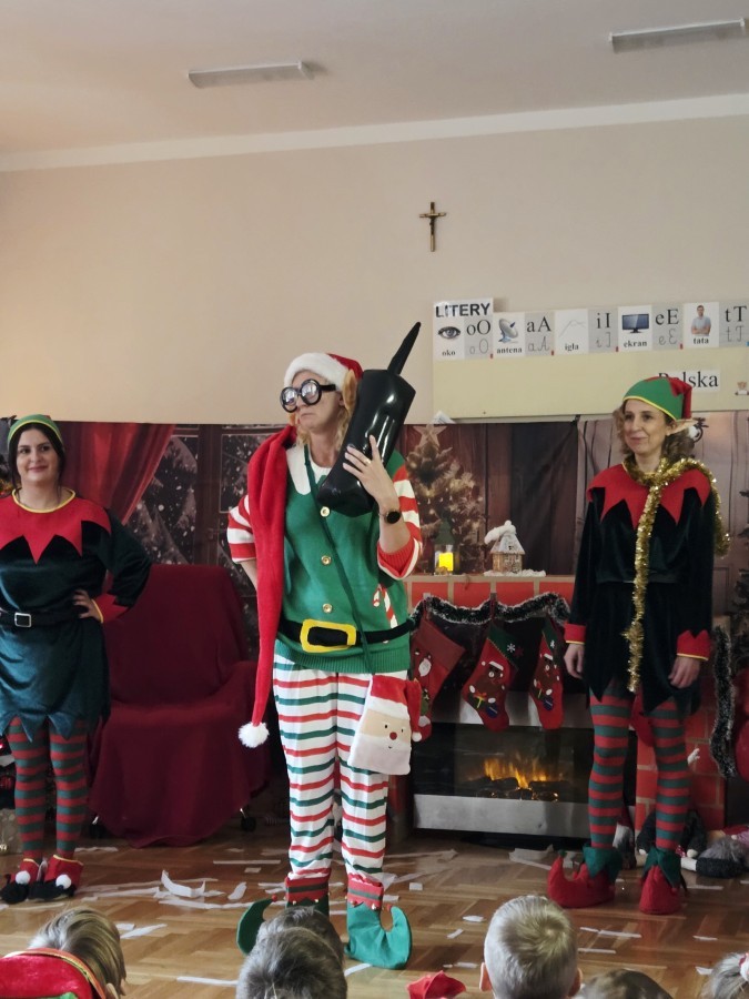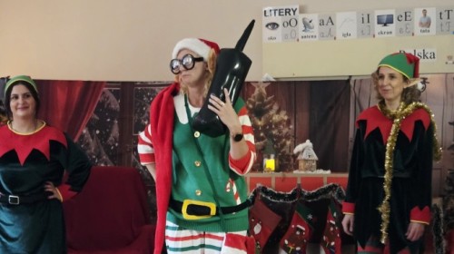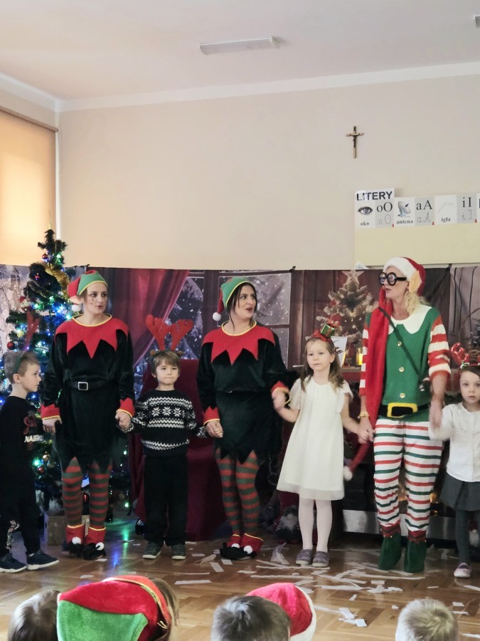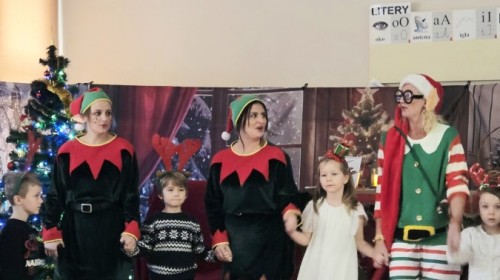 Były prezenty, były pierniczki pieczone przez elfa Maurycego czyli przez panią Anię z grupy Pszczółek (Oczywiście tak naprawdę pierniczki upiekły nam Panie z kuchni - bardzo dziękujemy). Elf Eustachy czyli pani Magda logopeda ubierał choinkę, dwa psotne elfy Pankracy - pani Ania pedagog specjalny i elf Bazyli - pani Natalia z grupy Biedronek ciągle się przekomarzały. Elf Ksawery czyli pani Mirka z grupy Myszek zajmował się reniferami. Była jeszcze roztańczona i rozśpiewana pani Zima czyli pani Klaudia z sekretariatu.