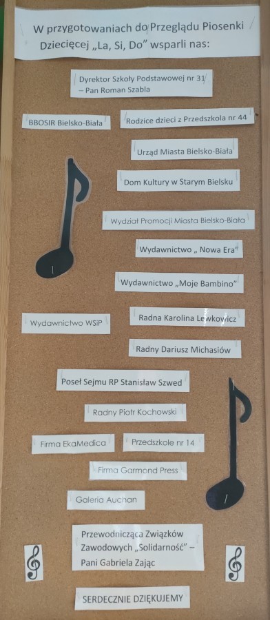 Szczególne podziękowania składamy panu Romanowi Szabli, Dyrektorowi Szkoły Podstawowej nr 31. W Przedszkolu nie byłoby możliwości ugościć tylu osób a pan Dyrektor przyjął nas u siebie w Szkole i udostępnił nam Salę Gimnastyczną. Dziękujemy.