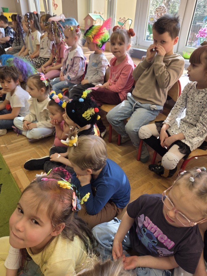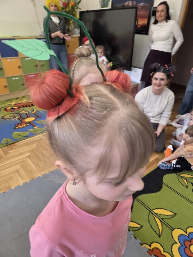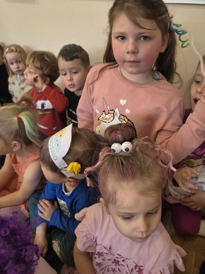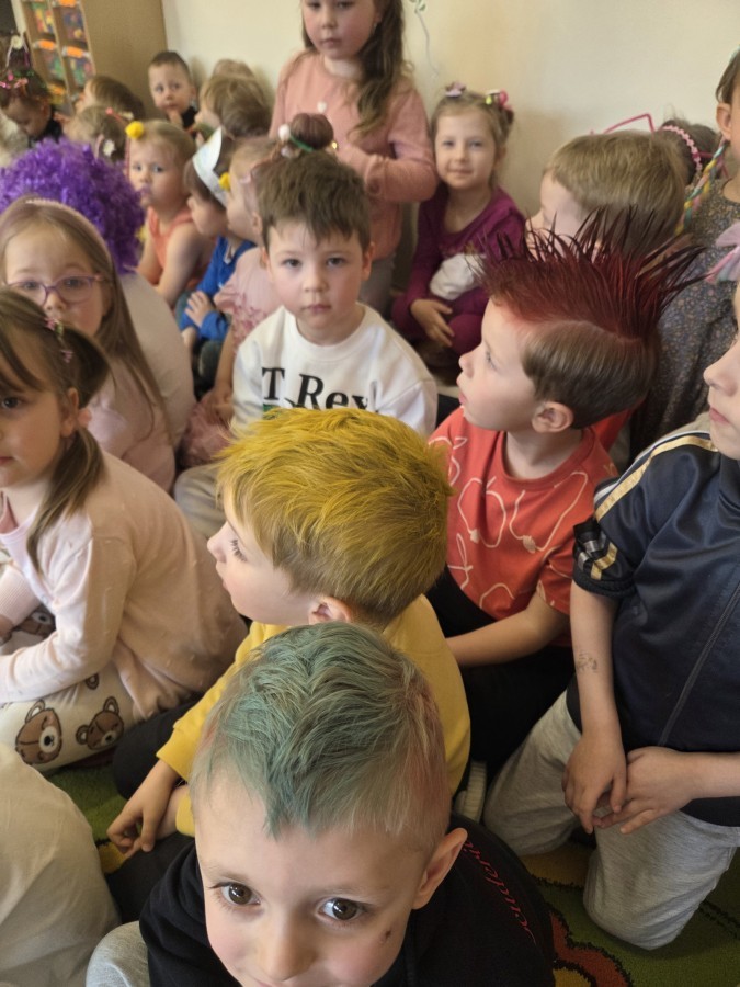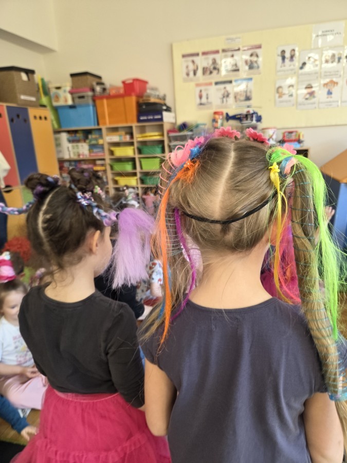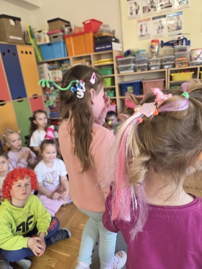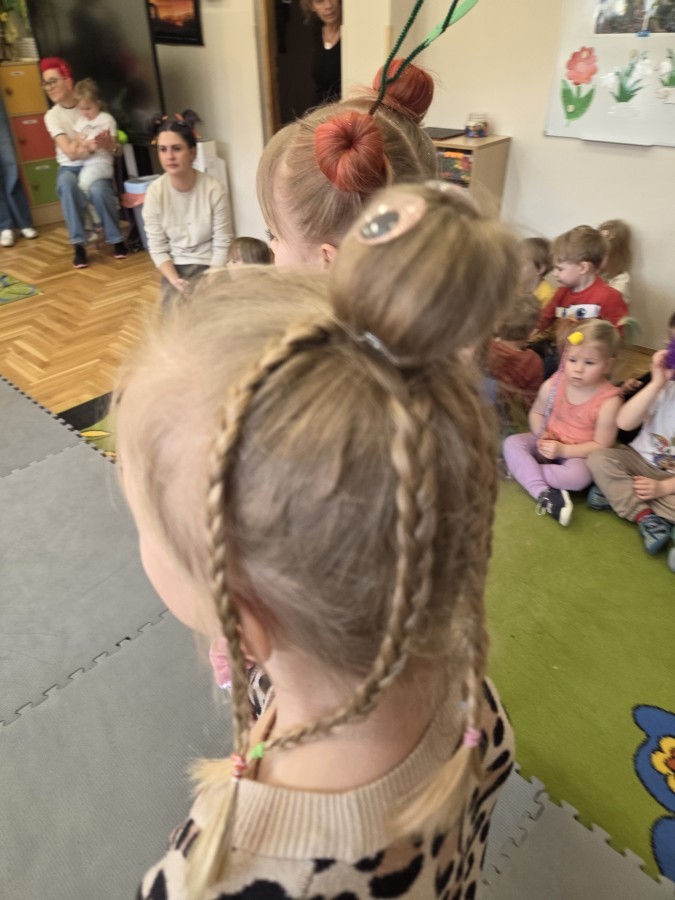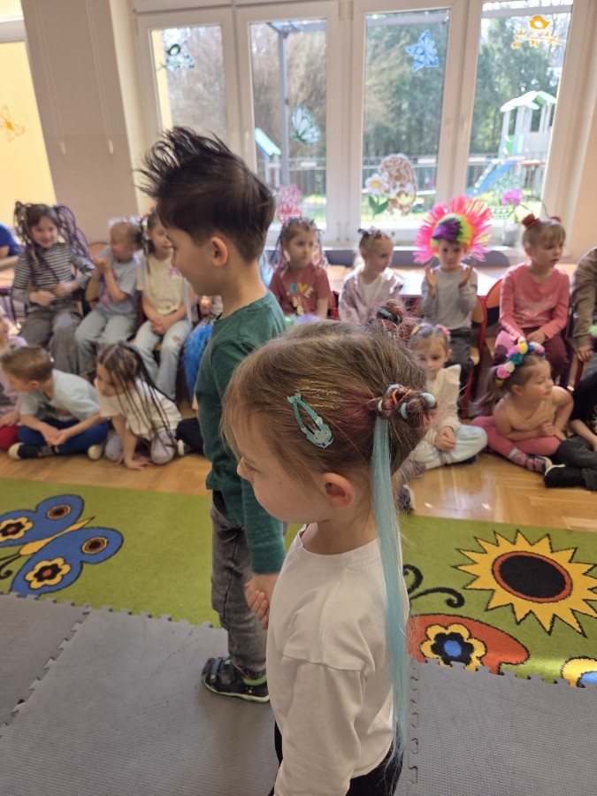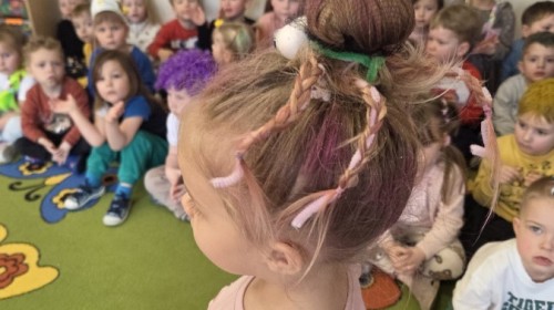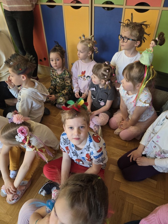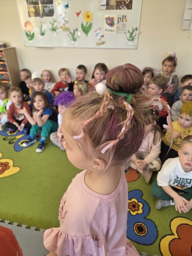 W poniedziałek 23 marca na głowach naszych przedszkolaków zagościły najbardziej szalone fryzury :-) dzieci przyszły uczesane w niezwykle pomysłowy i kolorowy sposób- pojawiły się min. fale, loki, koki, piórka, kwiaty, dredy i pająki. W ten sposób chcieliśmy uczcić nadejście wiosny :-) dziękujemy Rodzicom za współpracę i zaangażowanie.