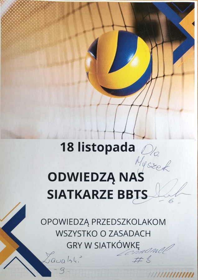 18 listopada odwiedzili nas siatkarze BBTS-u - Bartłomiej Zawalski #9, Mateusz Zawalski #6 oraz Patrik Lamanec #3. Opowiadali dzieciom o zasadach gry w siatkówkę, mówili jak wygląda ich praca. Ile trwają treningi i jak często się odbywają. Opowiadali o wyjazdach na mecze.