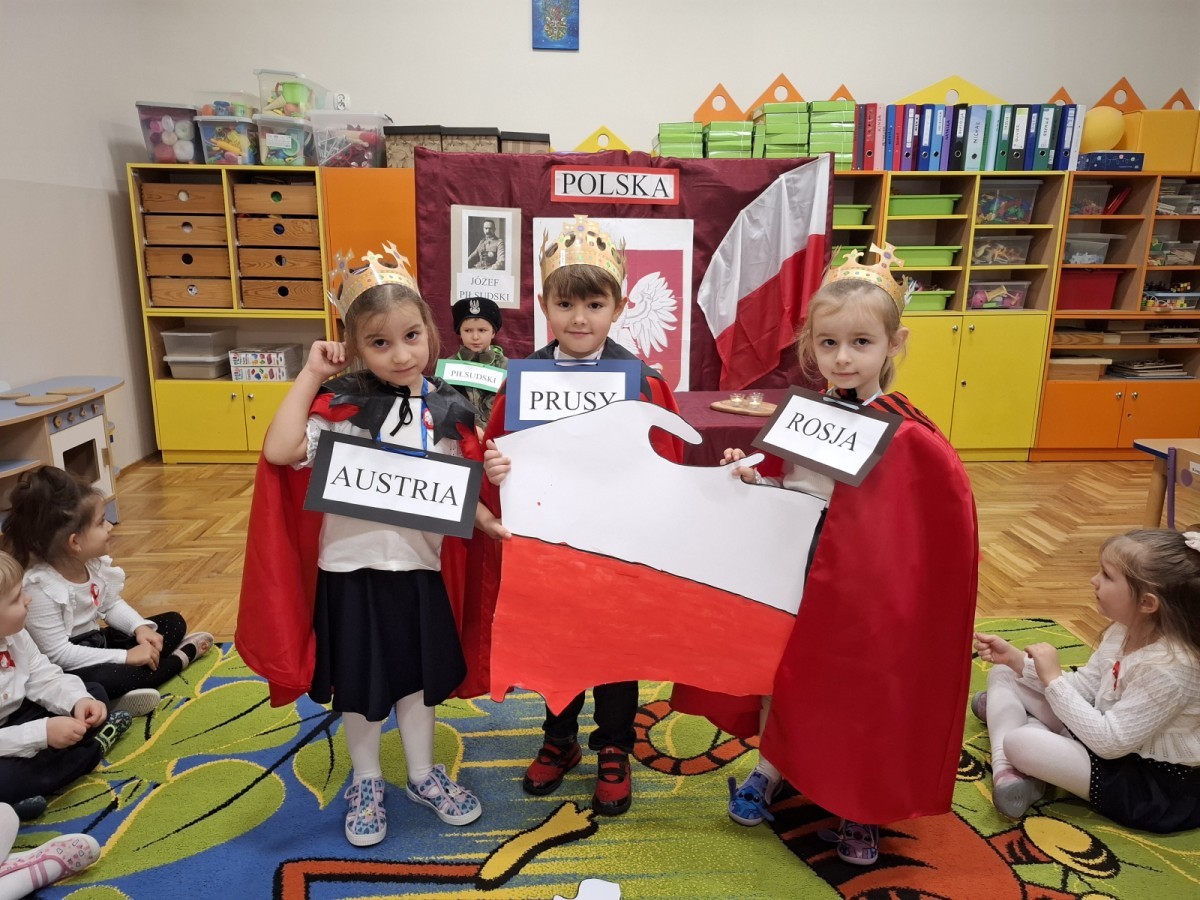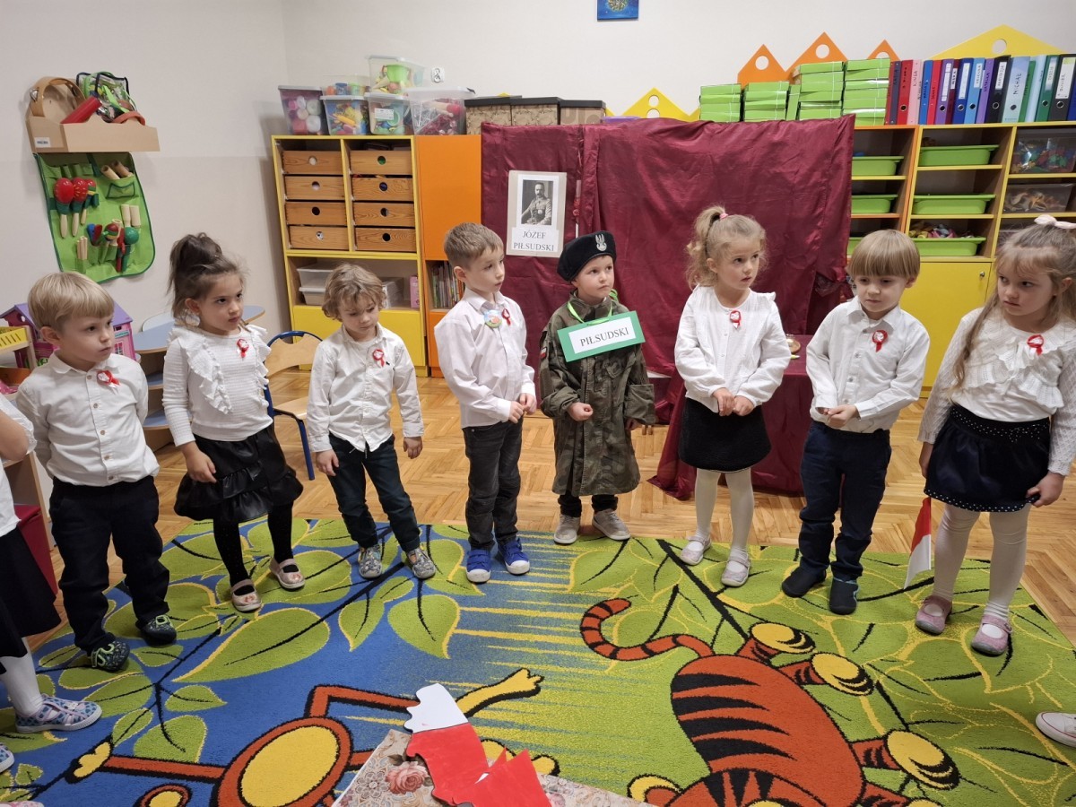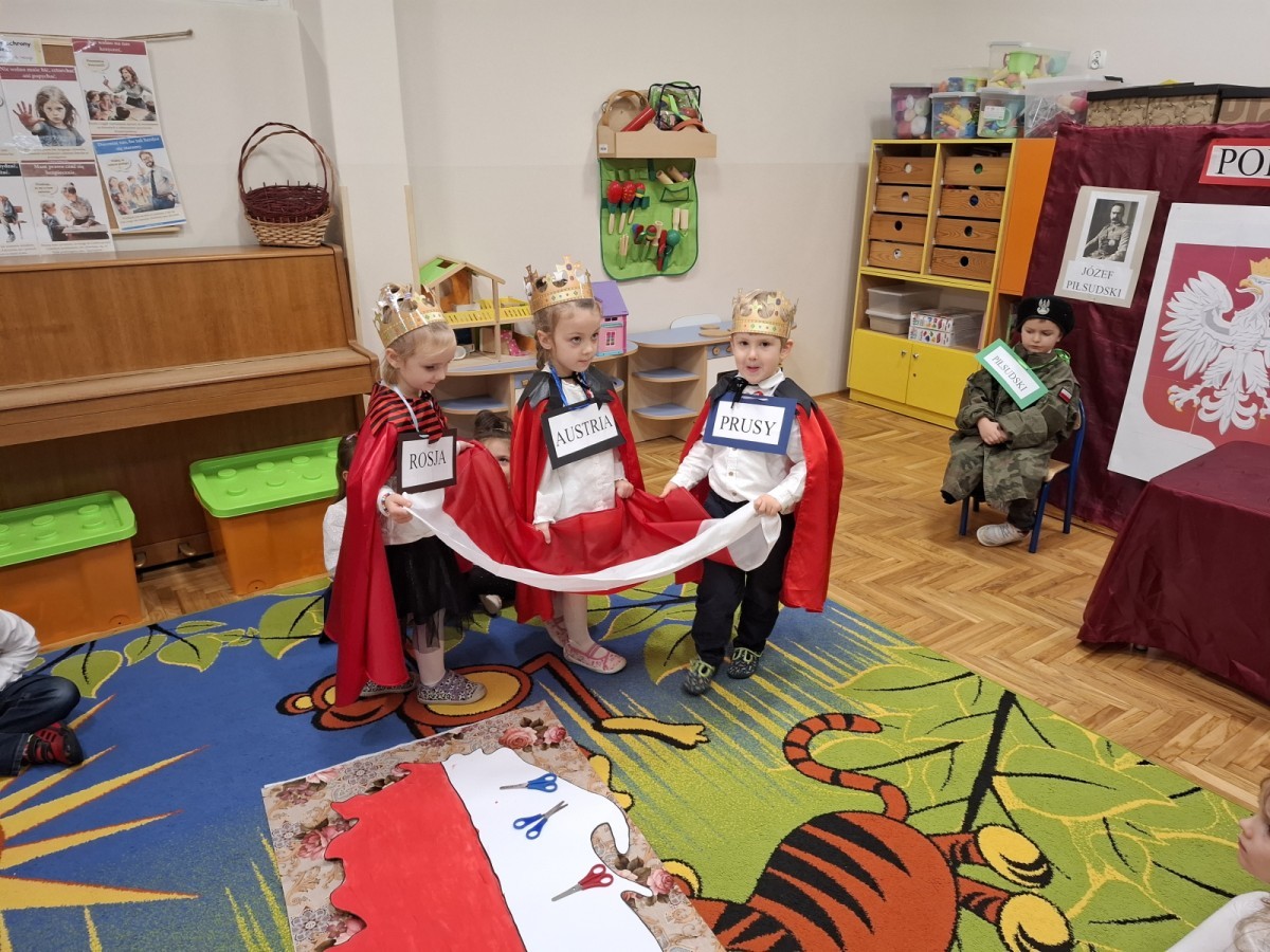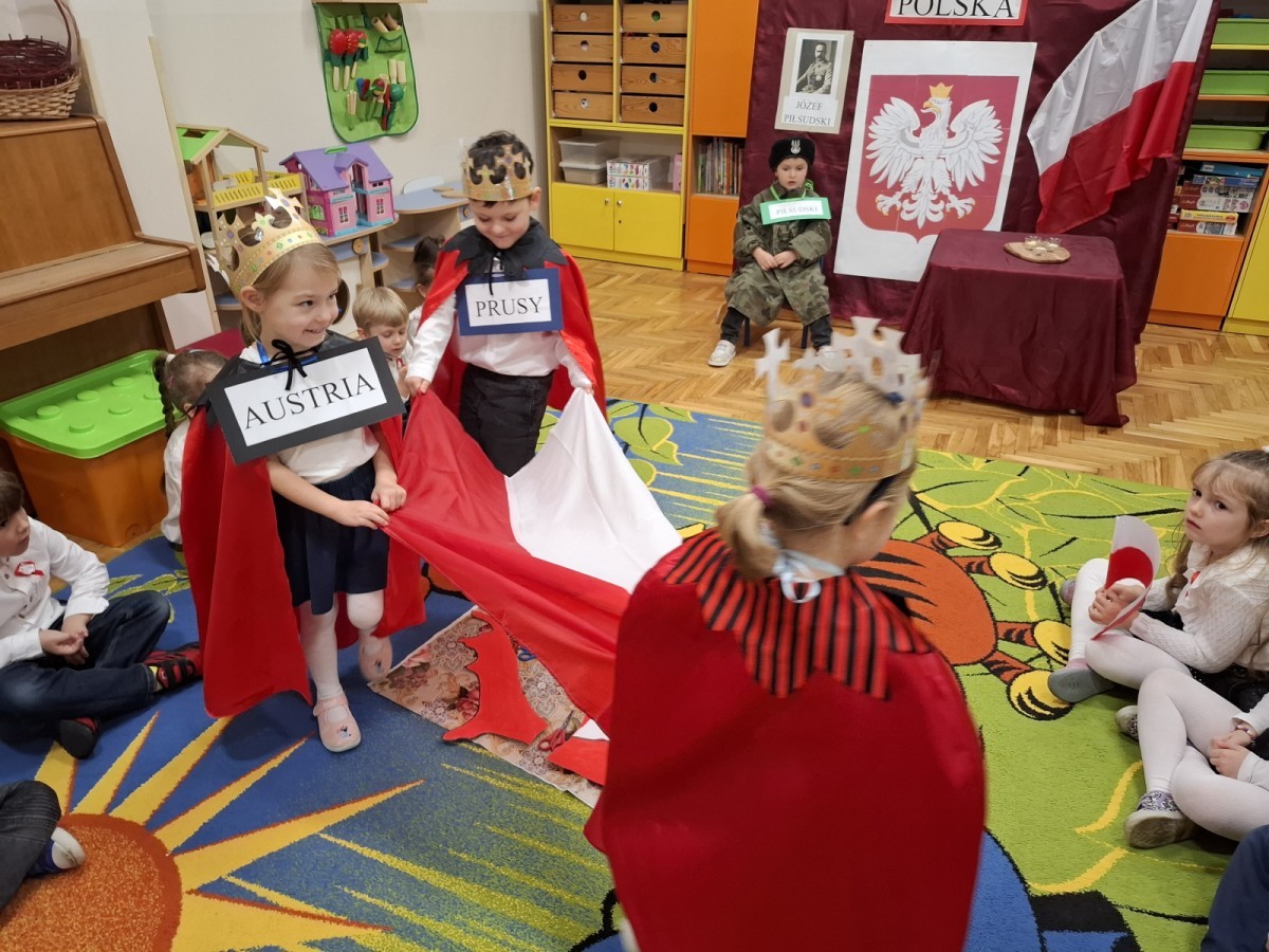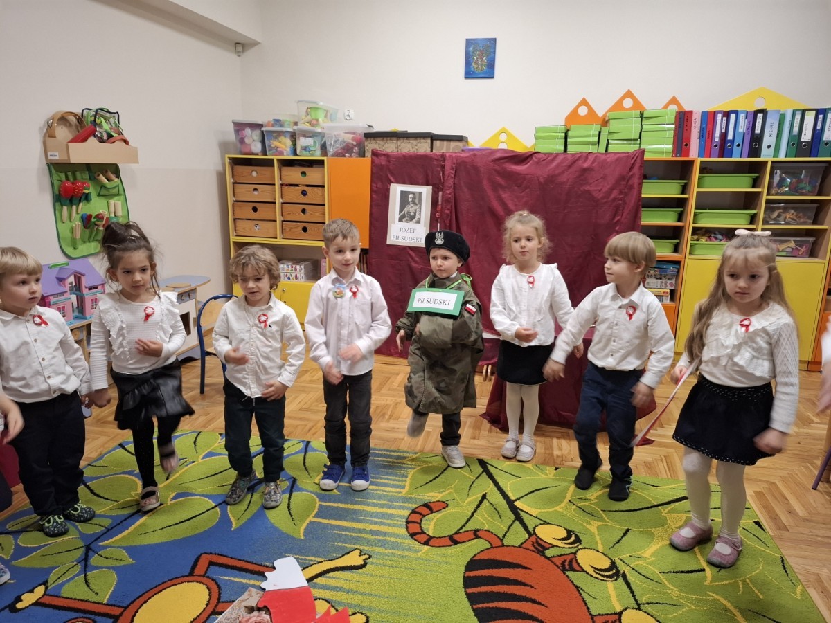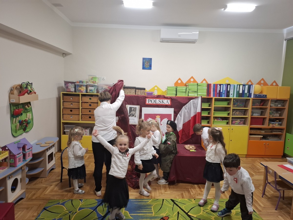 Odbyły się zajęcia patriotyczne, podczas których zainscenizowana została utrata niepodległości przez Polskę i jej odzyskanie po 123 latach zaborów. W trakcie realizacji zadania ,,Polskę miłuję- śpiewam i prezentuję"- dzieci odśpiewały hymn państwowy i pieśń ,,My, Pierwsza Brygada", a w ramach zadania ,,Symbole tworzę- pamięć odtworzę"- wykonały kotyliony.