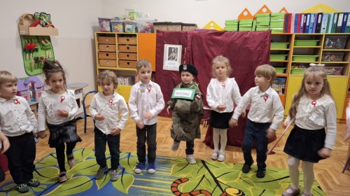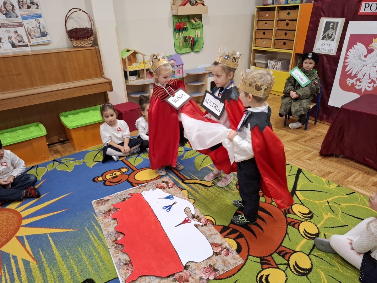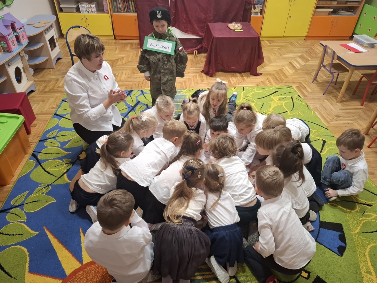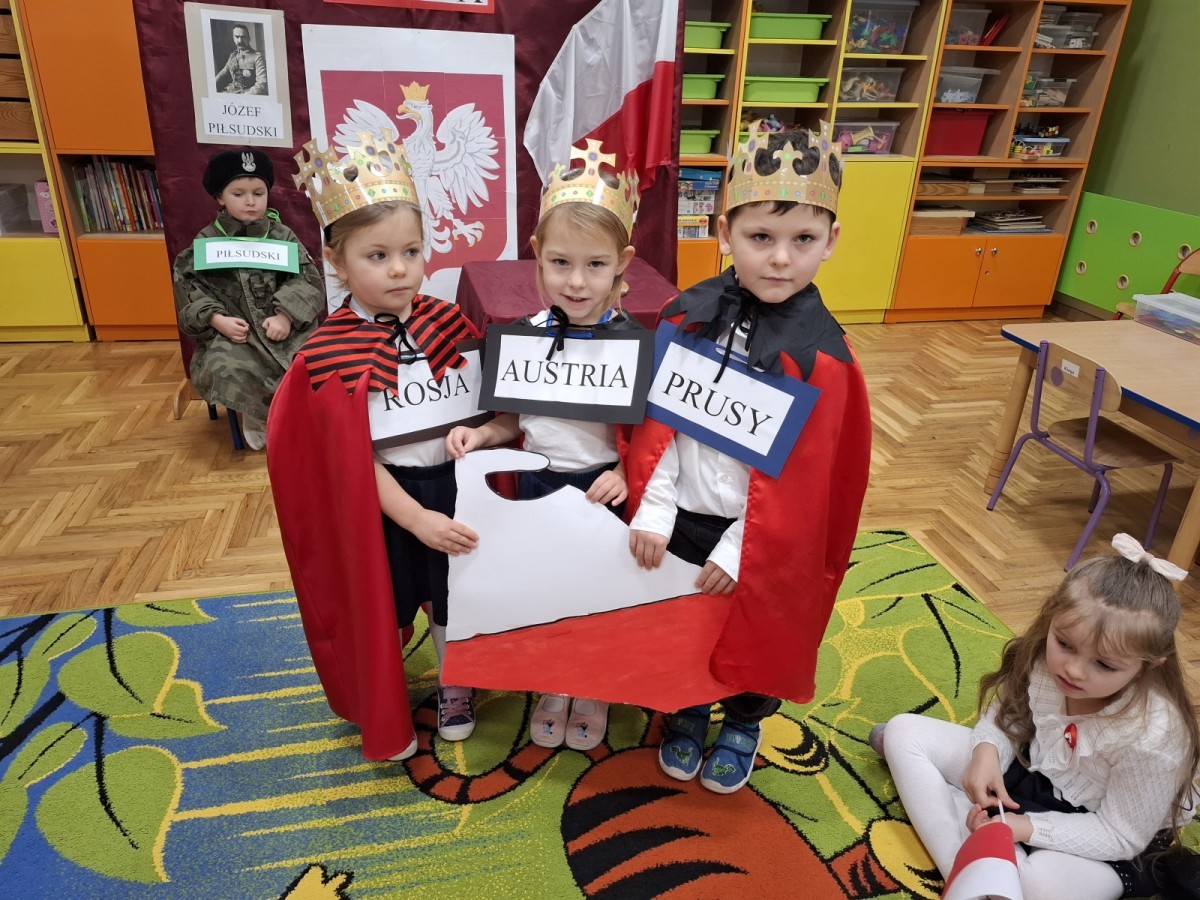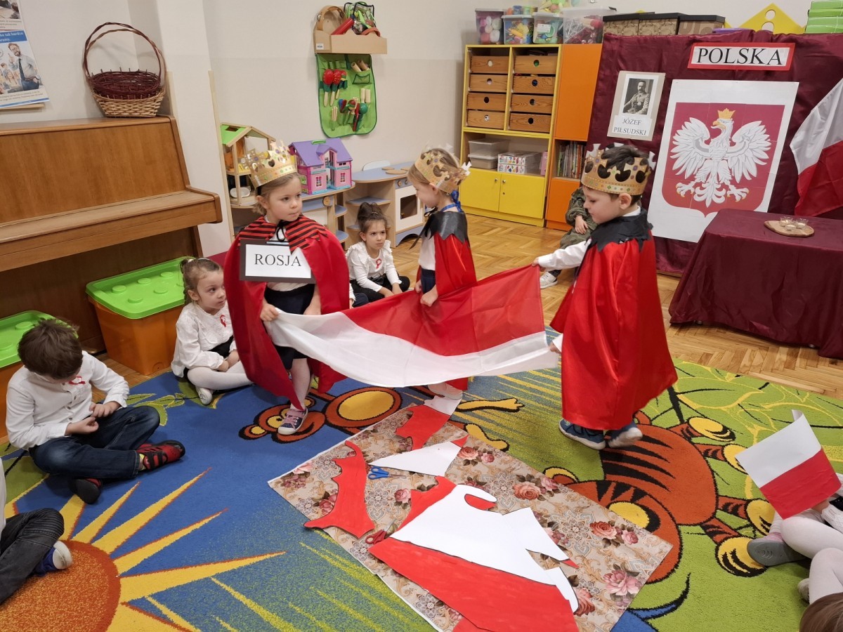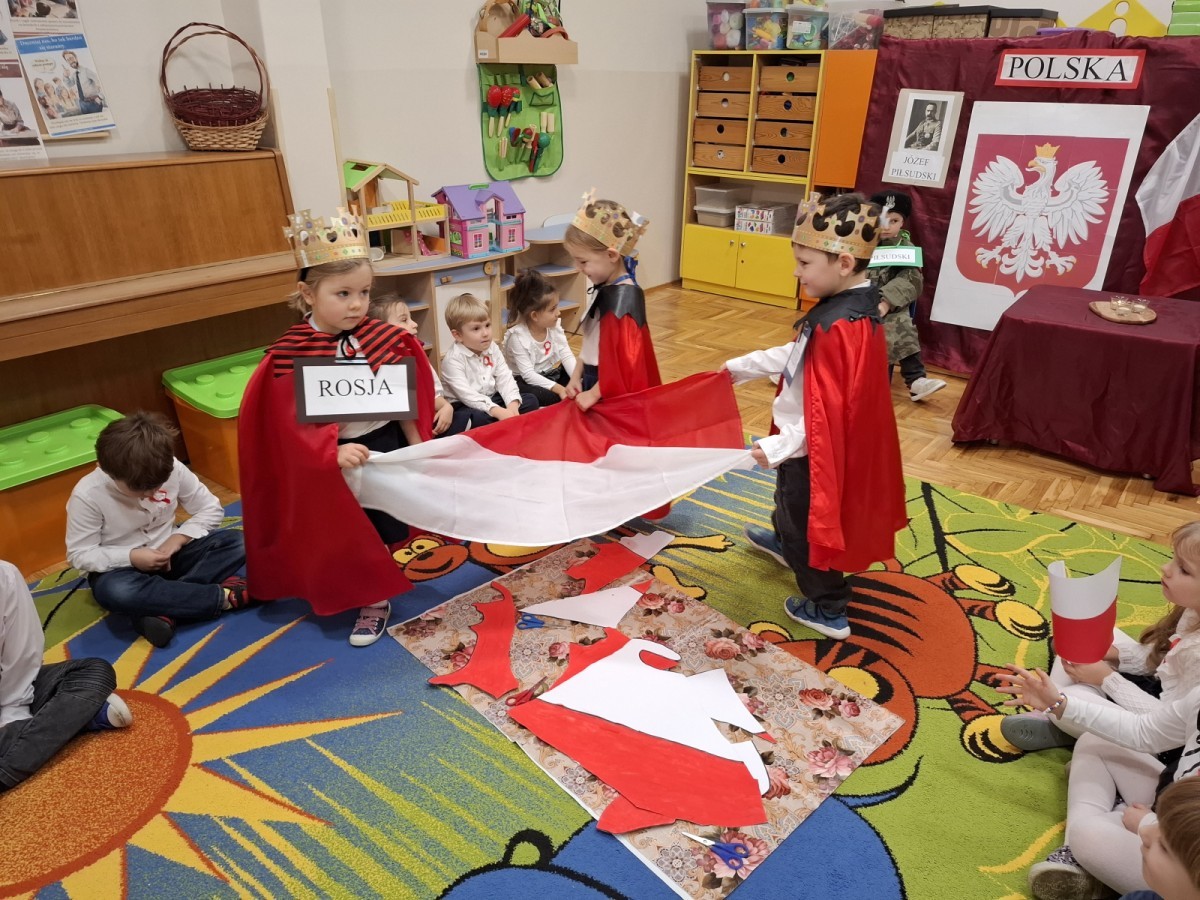 Odbyły się zajęcia patriotyczne, podczas których zainscenizowana została utrata niepodległości przez Polskę i jej odzyskanie po 123 latach zaborów. W trakcie realizacji zadania ,,Polskę miłuję- śpiewam i prezentuję"- dzieci odśpiewały hymn państwowy i pieśń ,,My, Pierwsza Brygada", a w ramach zadania ,,Symbole tworzę- pamięć odtworzę"- wykonały kotyliony.