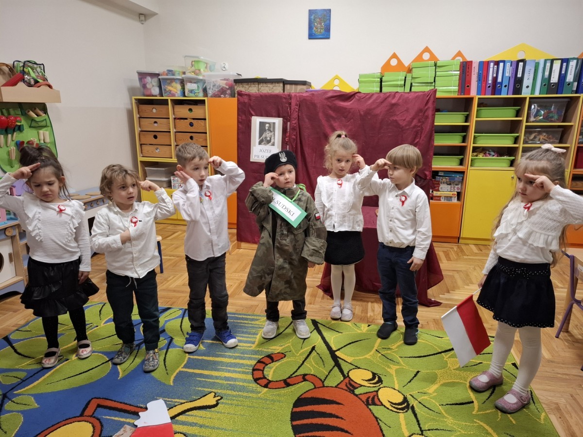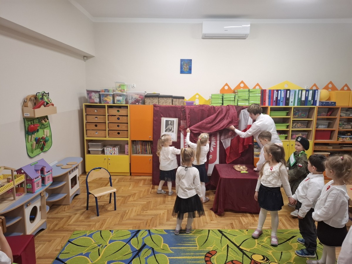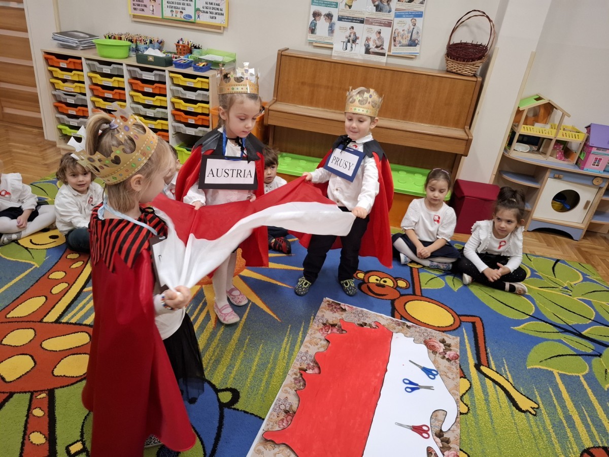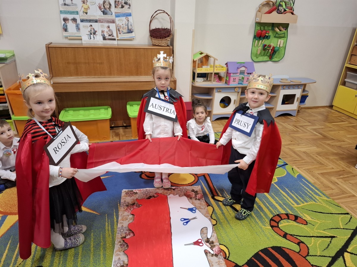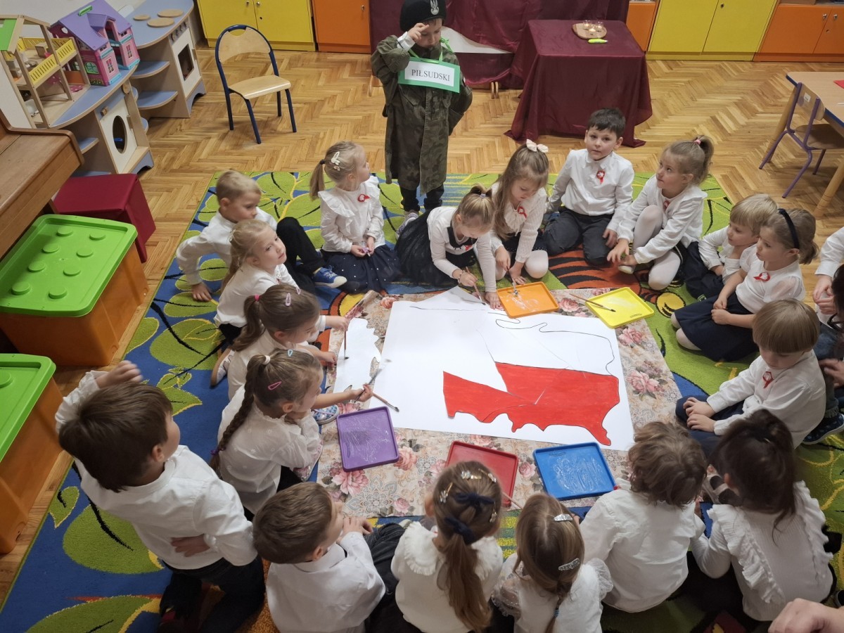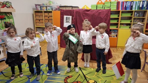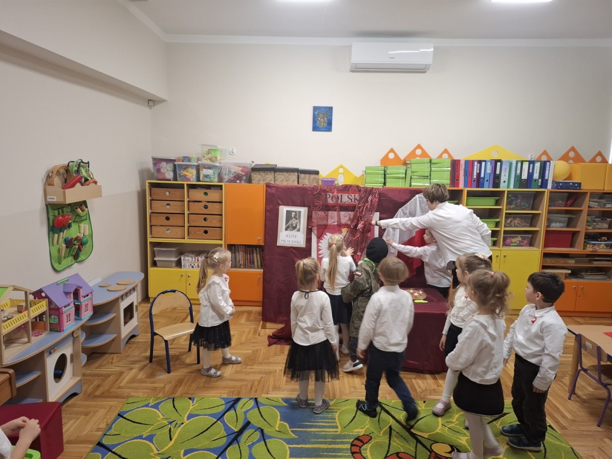 Odbyły się zajęcia patriotyczne, podczas których zainscenizowana została utrata niepodległości przez Polskę i jej odzyskanie po 123 latach zaborów. W trakcie realizacji zadania ,,Polskę miłuję- śpiewam i prezentuję"- dzieci odśpiewały hymn państwowy i pieśń ,,My, Pierwsza Brygada", a w ramach zadania ,,Symbole tworzę- pamięć odtworzę"- wykonały kotyliony.