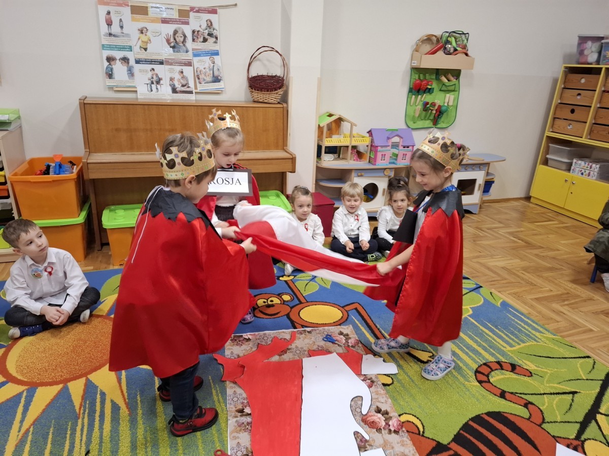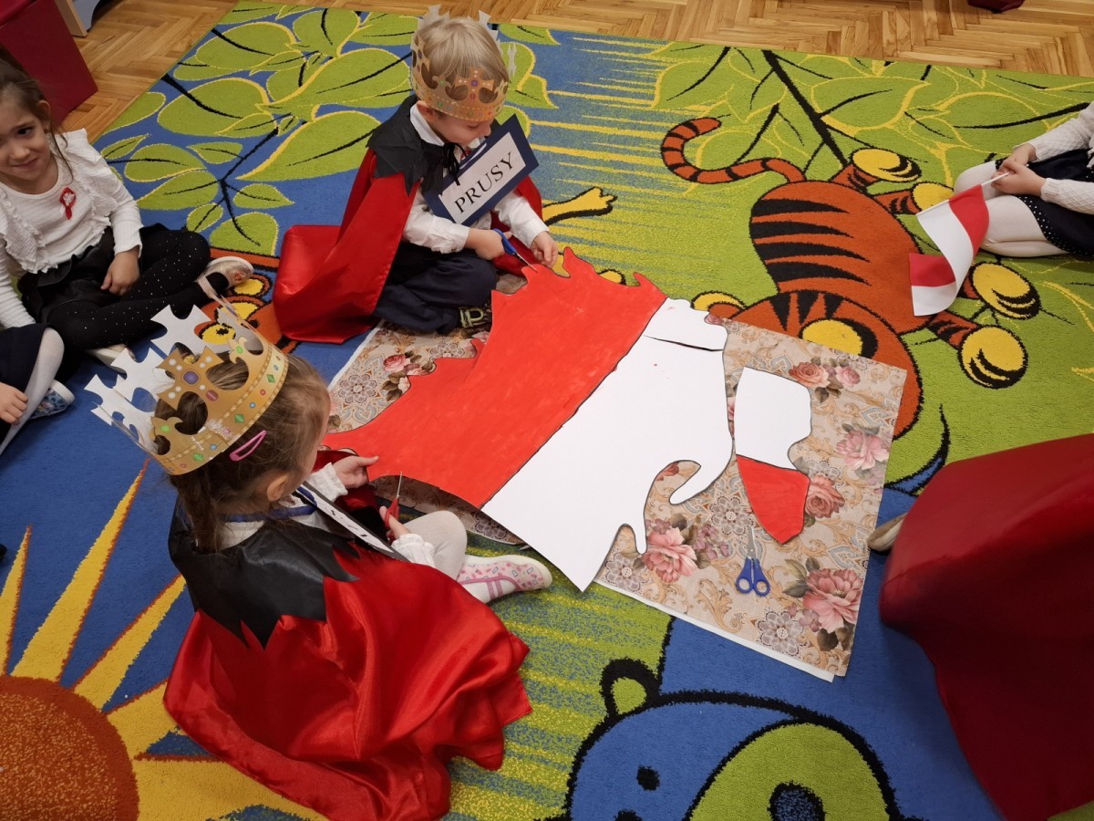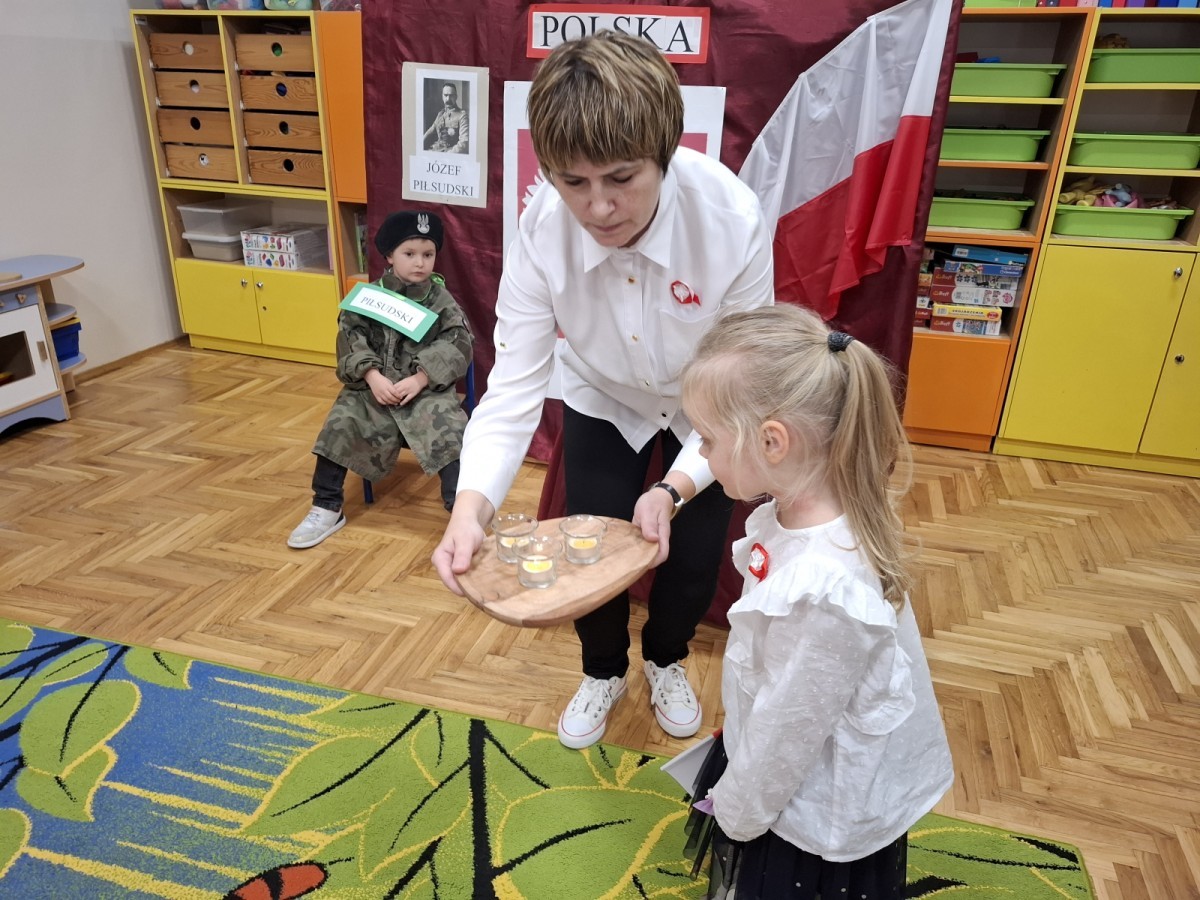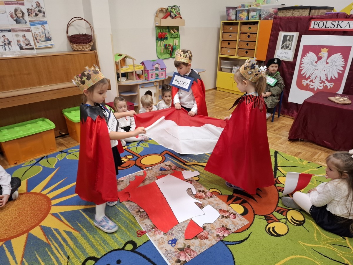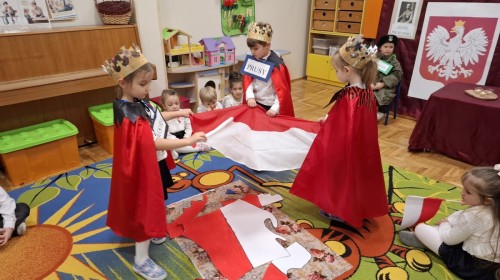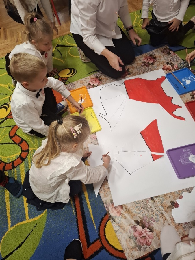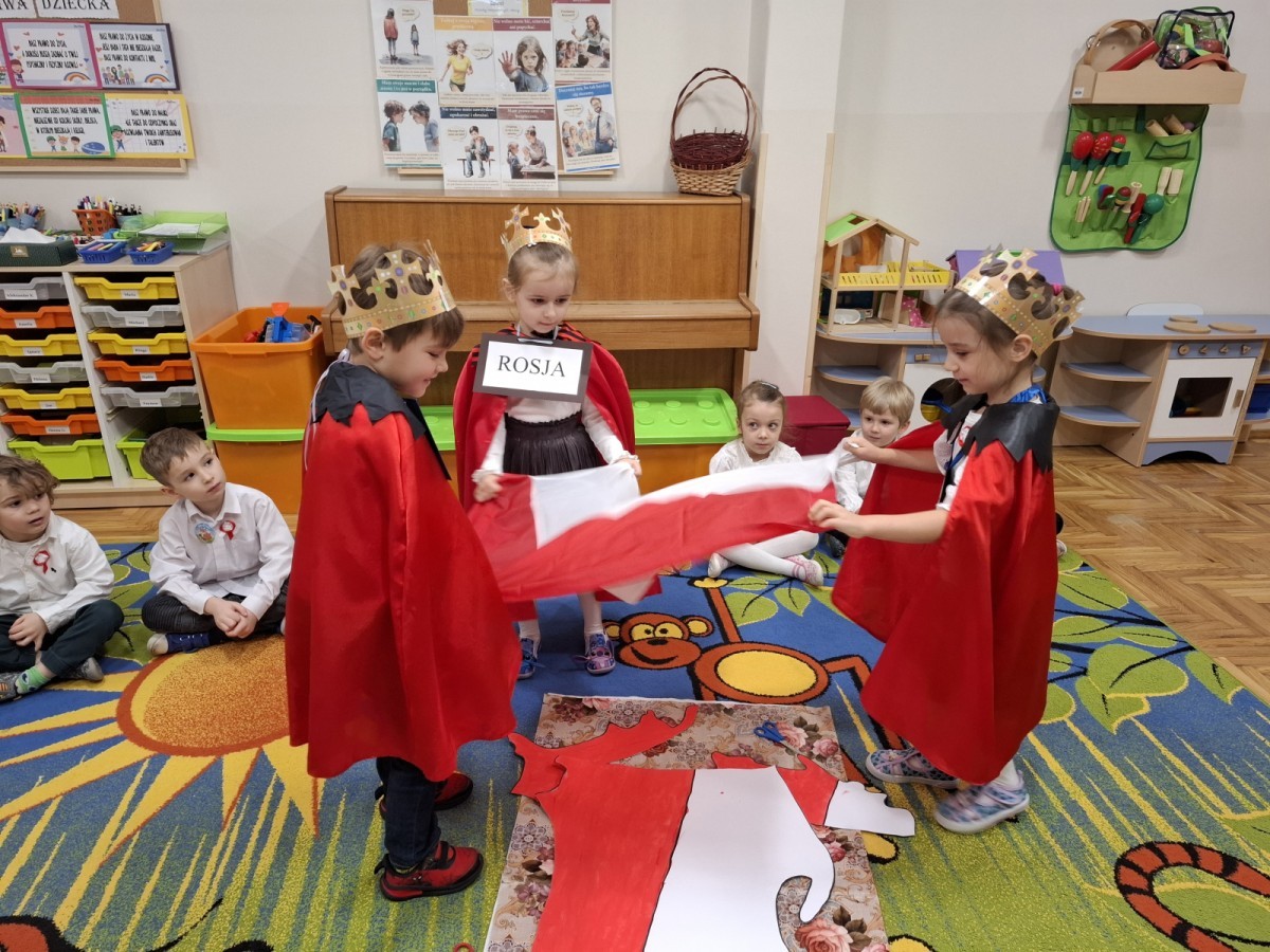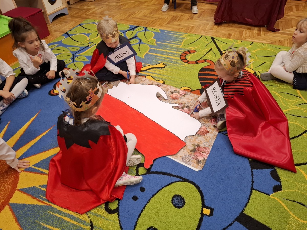 Odbyły się zajęcia patriotyczne, podczas których zainscenizowana została utrata niepodległości przez Polskę i jej odzyskanie po 123 latach zaborów. W trakcie realizacji zadania ,,Polskę miłuję- śpiewam i prezentuję"- dzieci odśpiewały hymn państwowy i pieśń ,,My, Pierwsza Brygada", a w ramach zadania ,,Symbole tworzę- pamięć odtworzę"- wykonały kotyliony.
