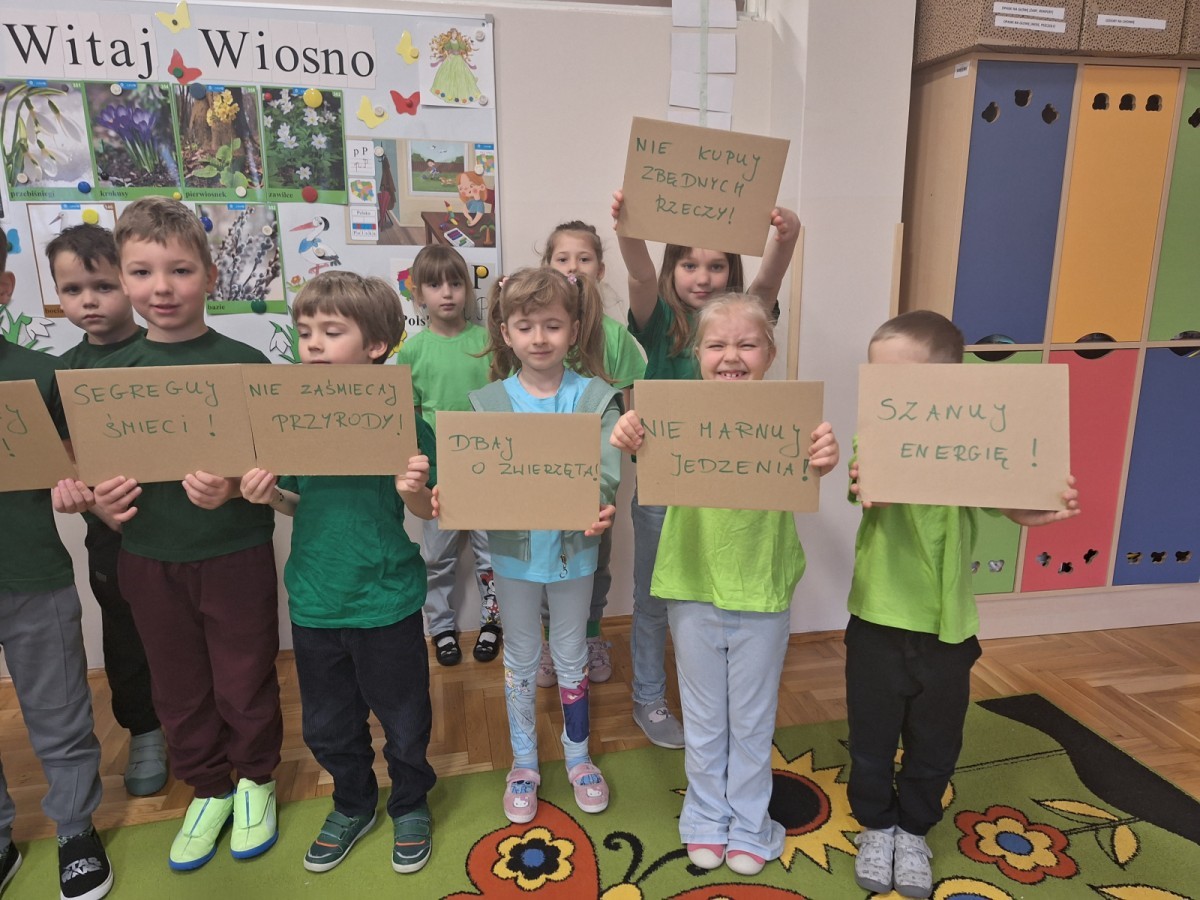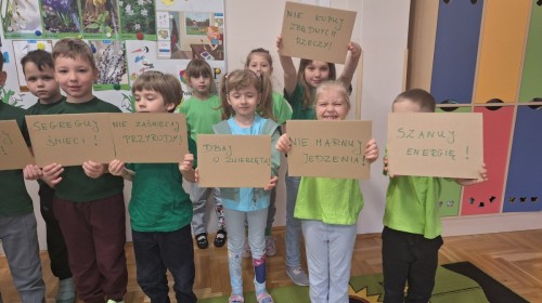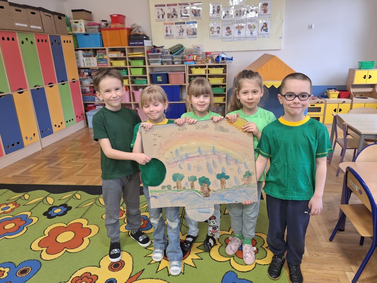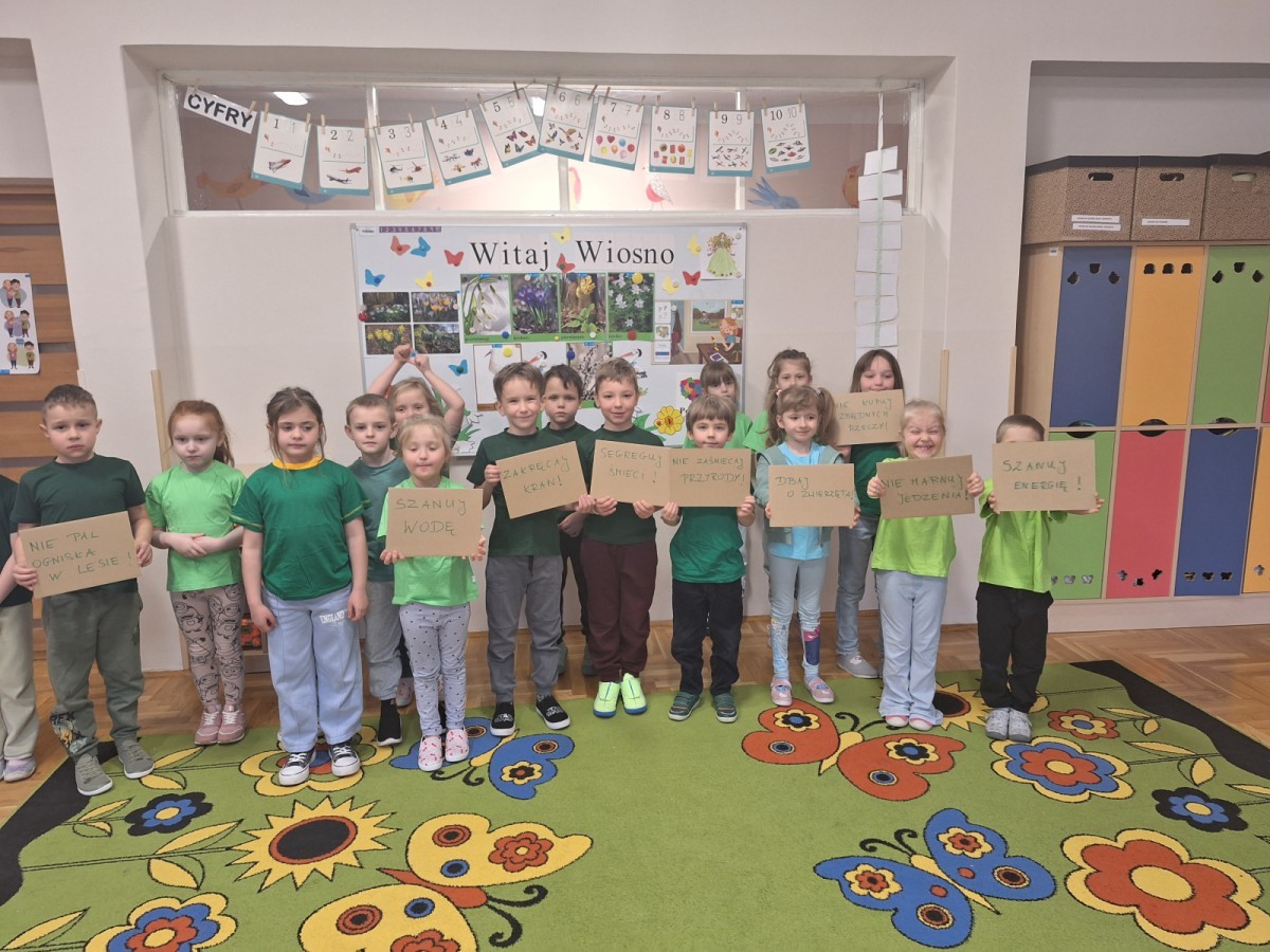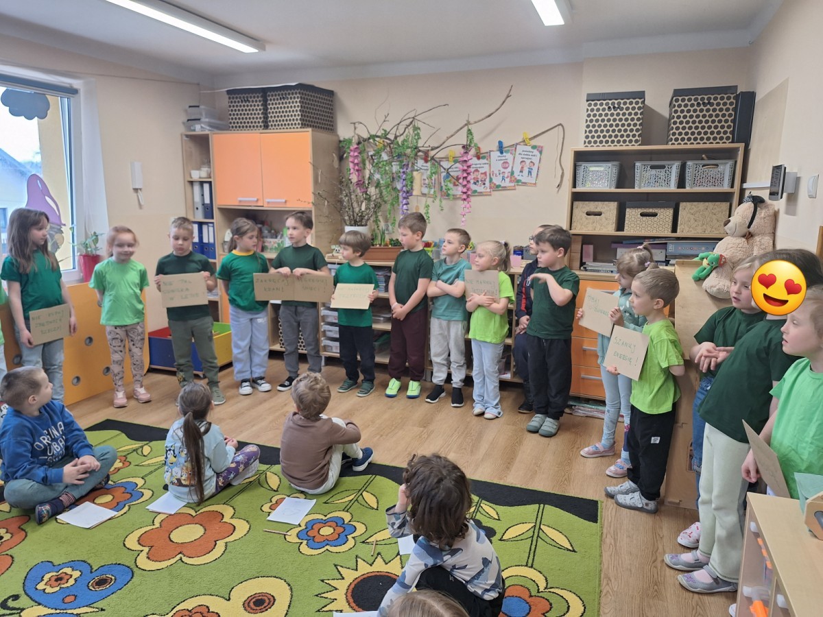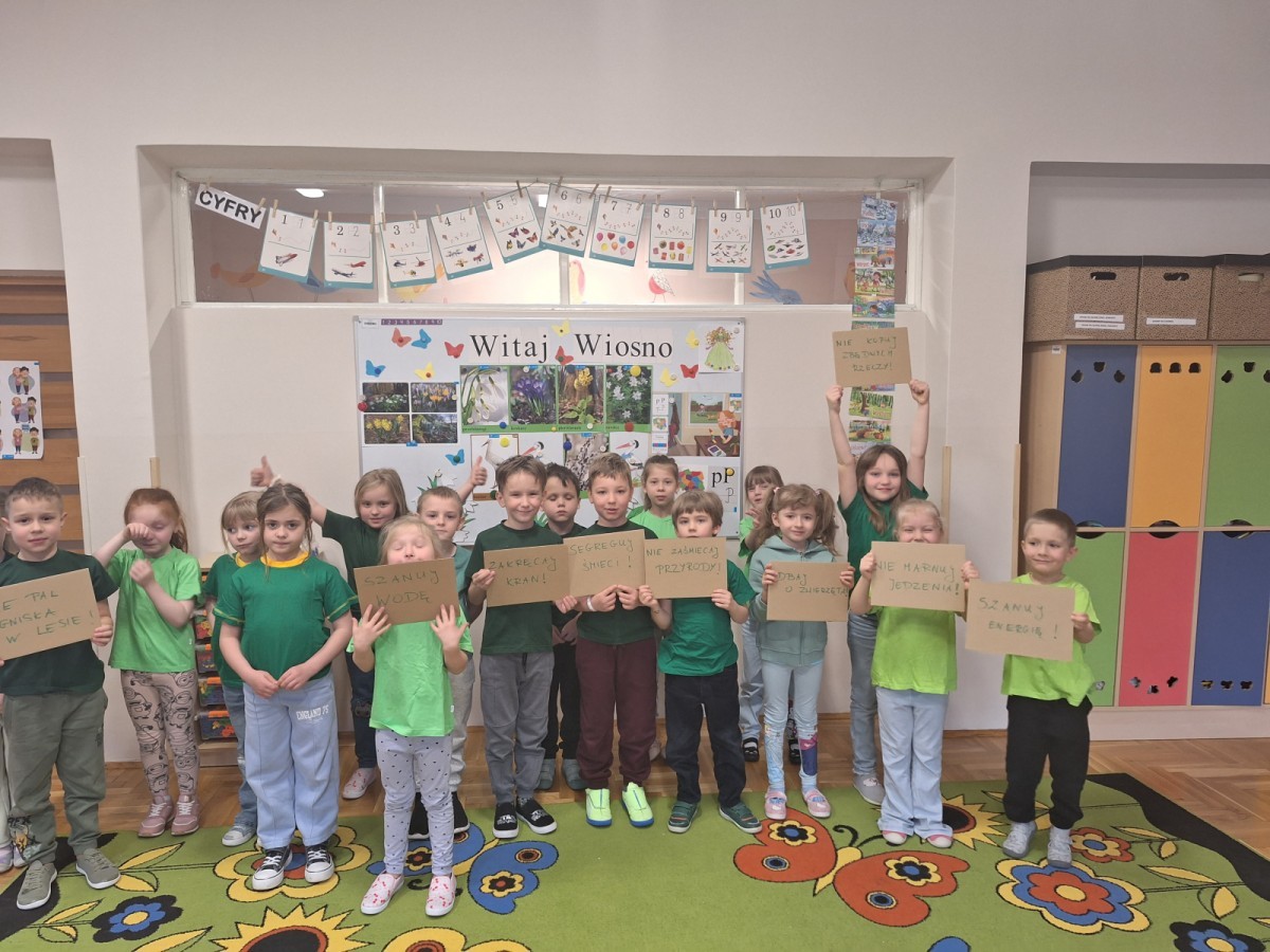 Od września nasze przedszkolaki brały udział w konkursie dla szkół i przedszkoli „Szanuj Energię, Chroń Klimat”. W kolejnych miesiącach wykonywały zadania konkursowe, a zdjęcia i opisy tych wydarzeń można zobaczyć w naszej galerii. 28 marca miało miejsce Eko wydarzenie – czyli podsumowanie wszystkich działań ekologicznych. Dzieci usystematyzowały zdobytą wiedzę na temat ekologii, zrobiły eko puzzle obrazujące sposoby ochrony i dbania o przyrodę, zaprezentowały swoje prace, odśpiewały wymyśloną wspólnie piosenkę o wodzie( jej znaczeniu i sposobach jej oszczędzania), wymyślały eko hasła , a następnie przeszły ekologicznym marszem do wszystkich grup przedszkolnych promując ekologiczny styl życia i zachęcając do dbania o przyrodę.