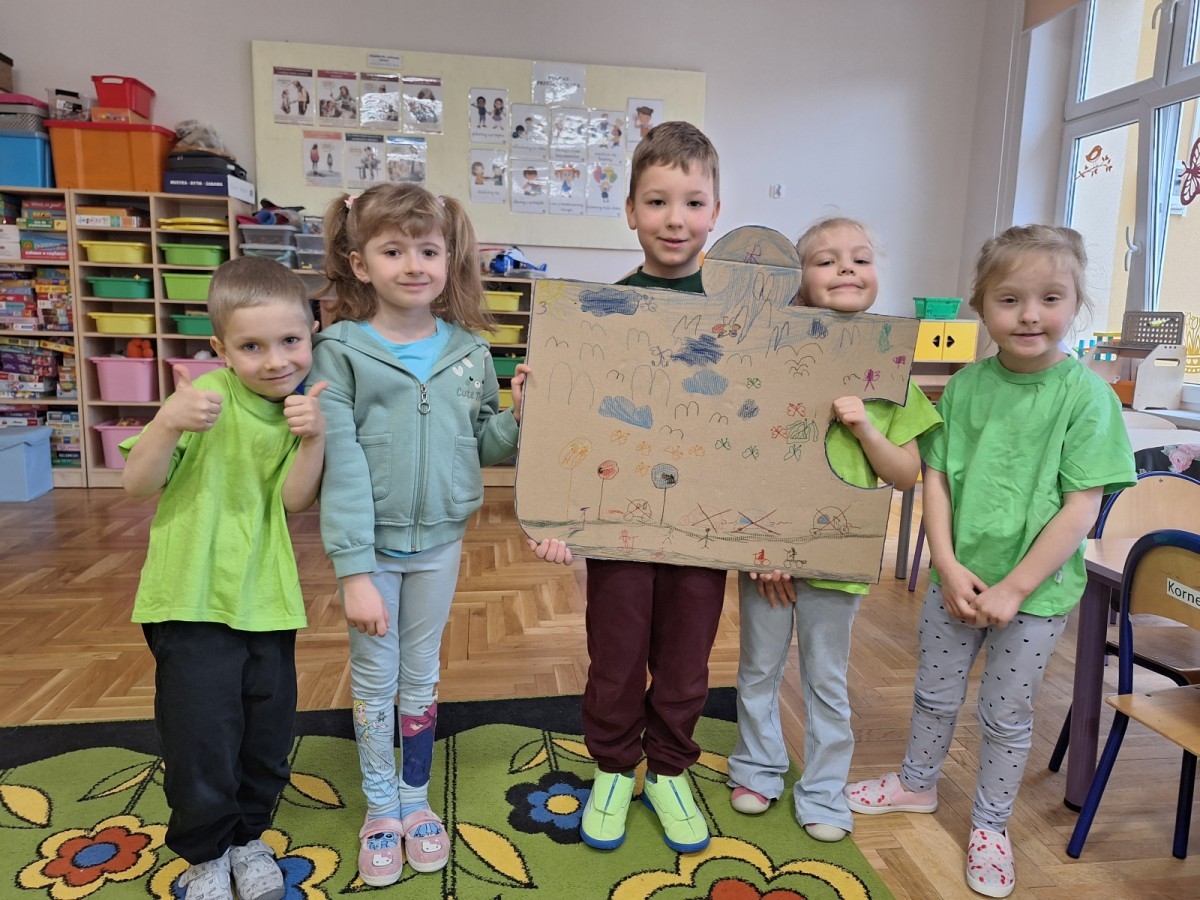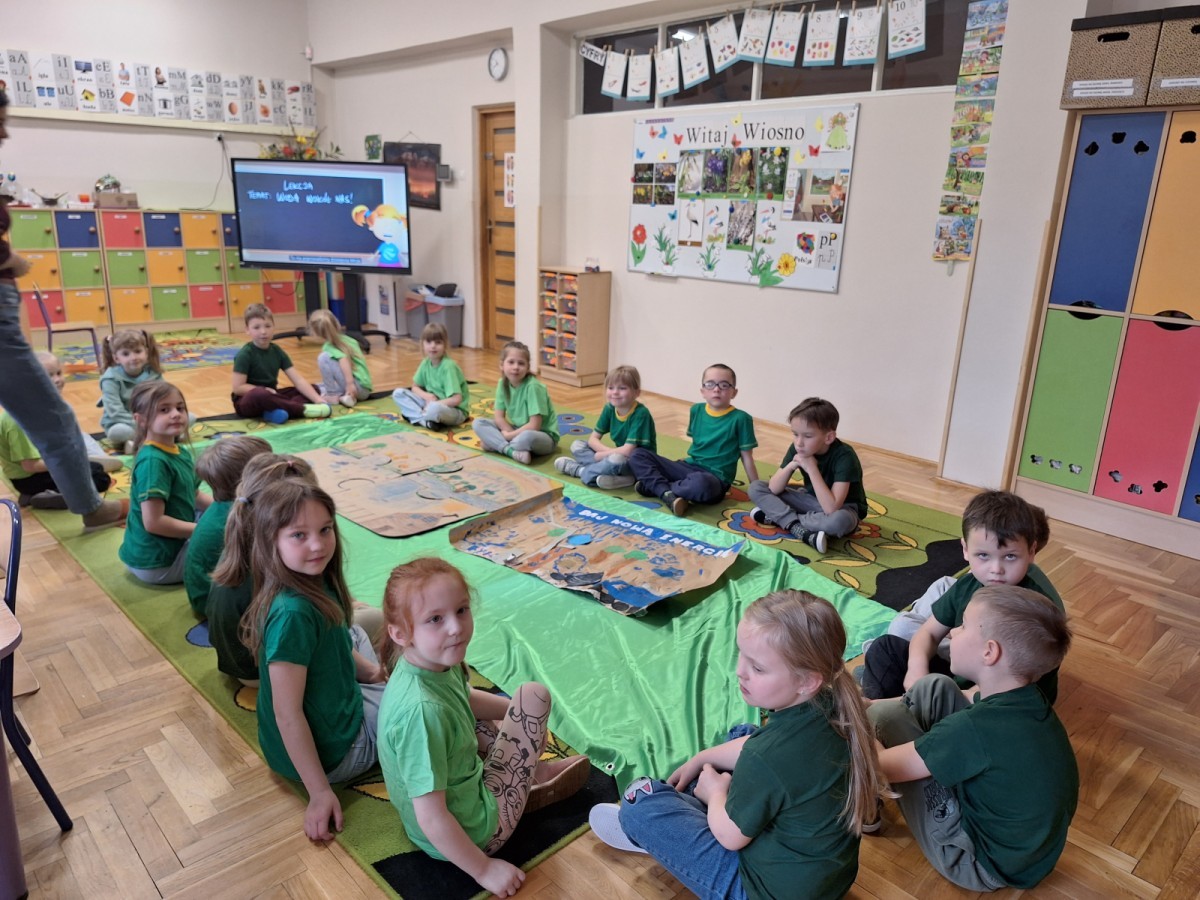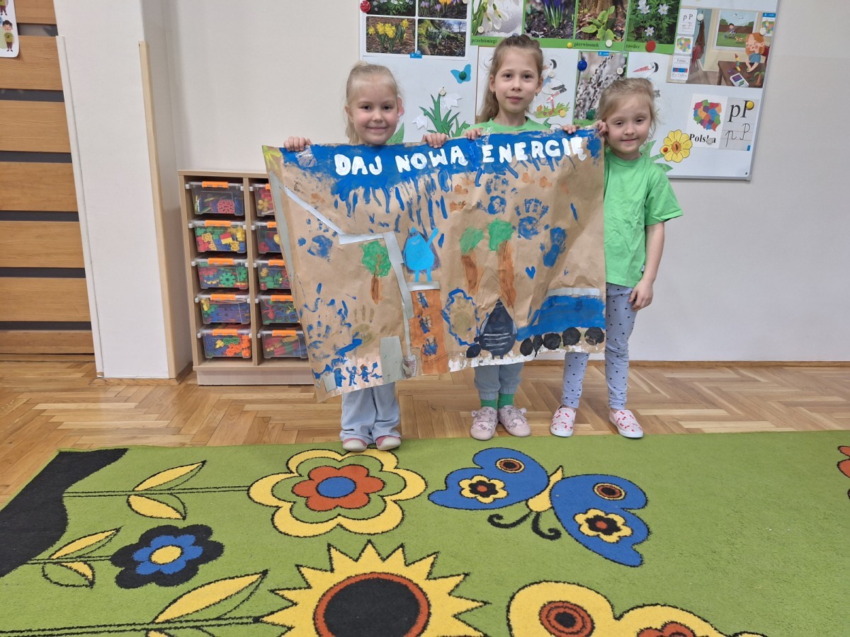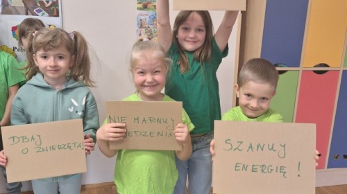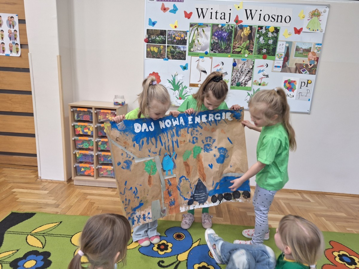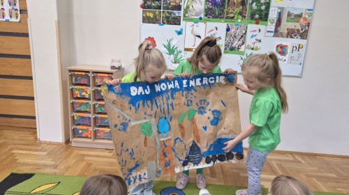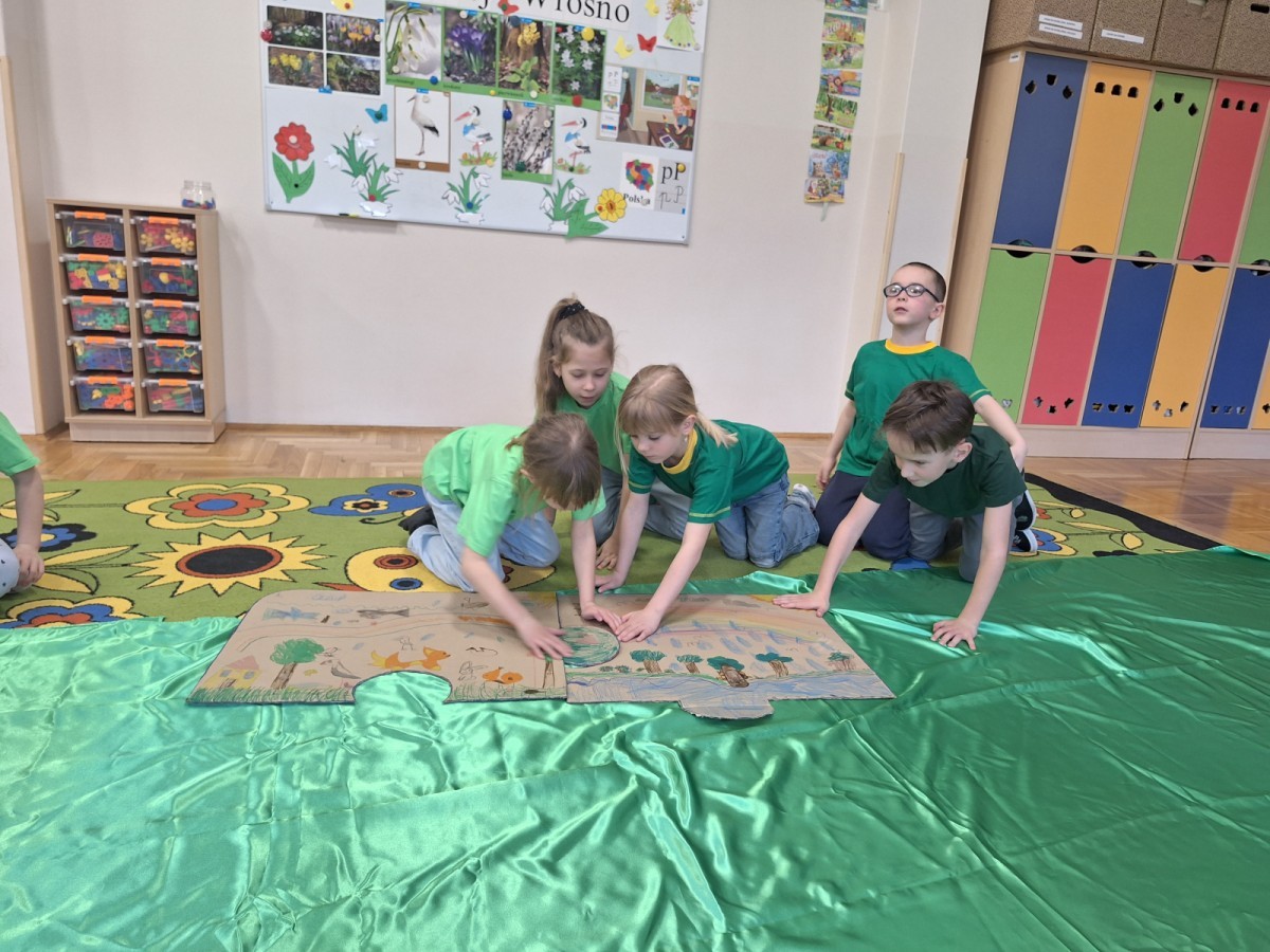 Od września nasze przedszkolaki brały udział w konkursie dla szkół i przedszkoli „Szanuj Energię, Chroń Klimat”. W kolejnych miesiącach wykonywały zadania konkursowe, a zdjęcia i opisy tych wydarzeń można zobaczyć w naszej galerii. 28 marca miało miejsce Eko wydarzenie – czyli podsumowanie wszystkich działań ekologicznych. Dzieci usystematyzowały zdobytą wiedzę na temat ekologii, zrobiły eko puzzle obrazujące sposoby ochrony i dbania o przyrodę, zaprezentowały swoje prace, odśpiewały wymyśloną wspólnie piosenkę o wodzie( jej znaczeniu i sposobach jej oszczędzania), wymyślały eko hasła , a następnie przeszły ekologicznym marszem do wszystkich grup przedszkolnych promując ekologiczny styl życia i zachęcając do dbania o przyrodę.