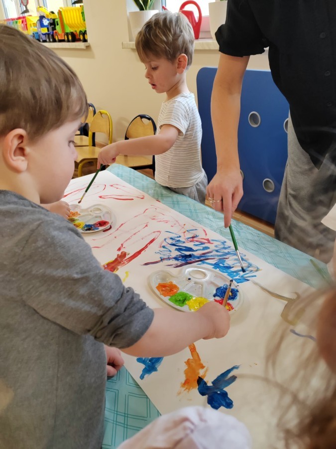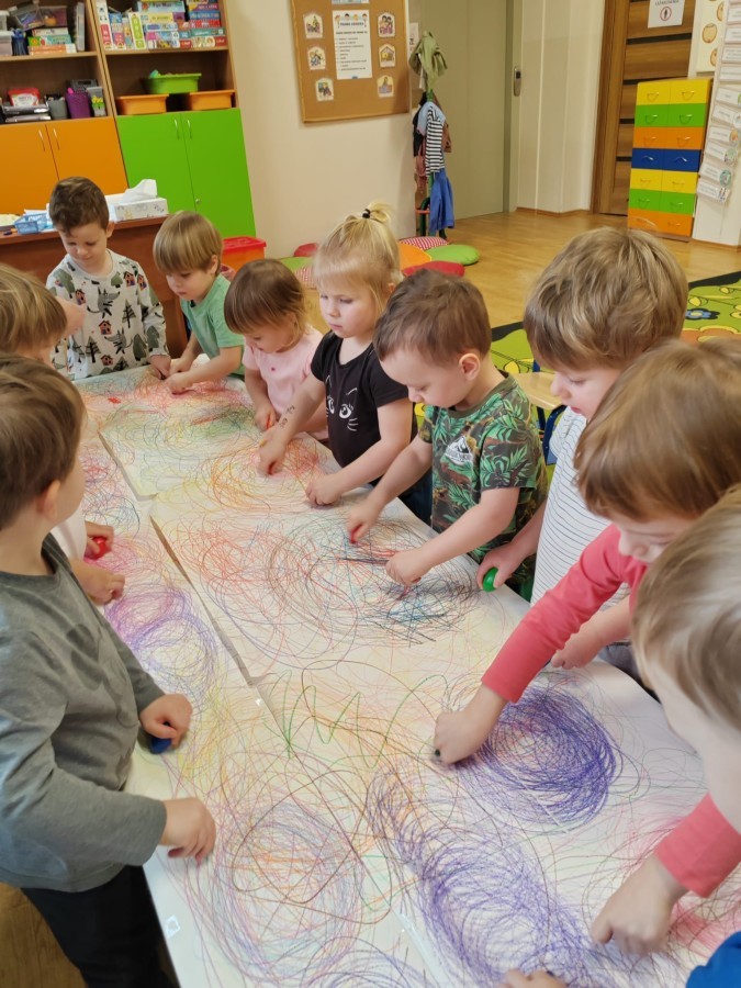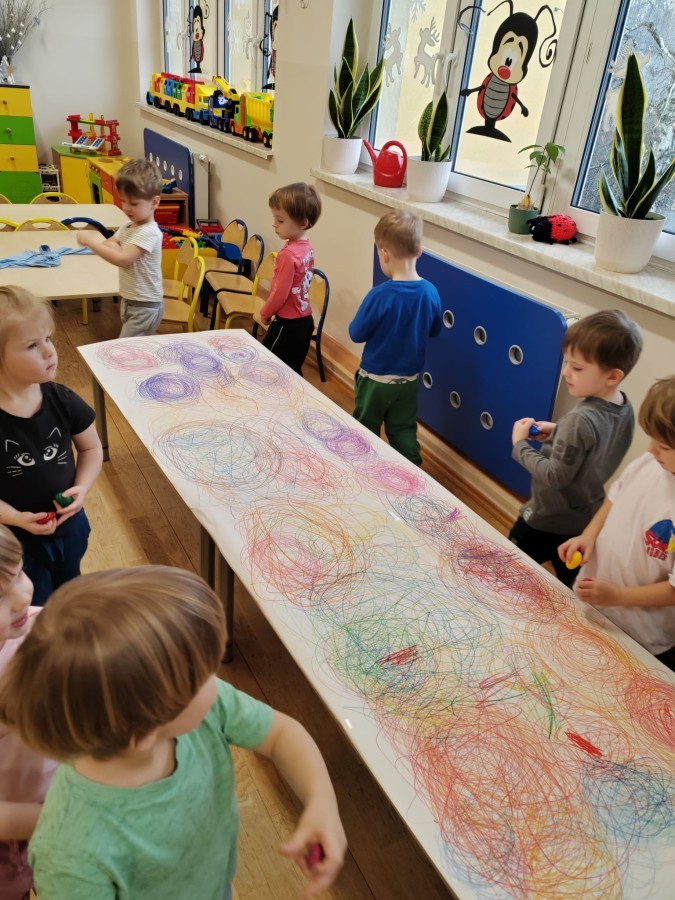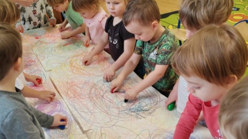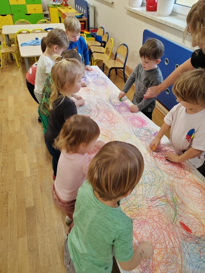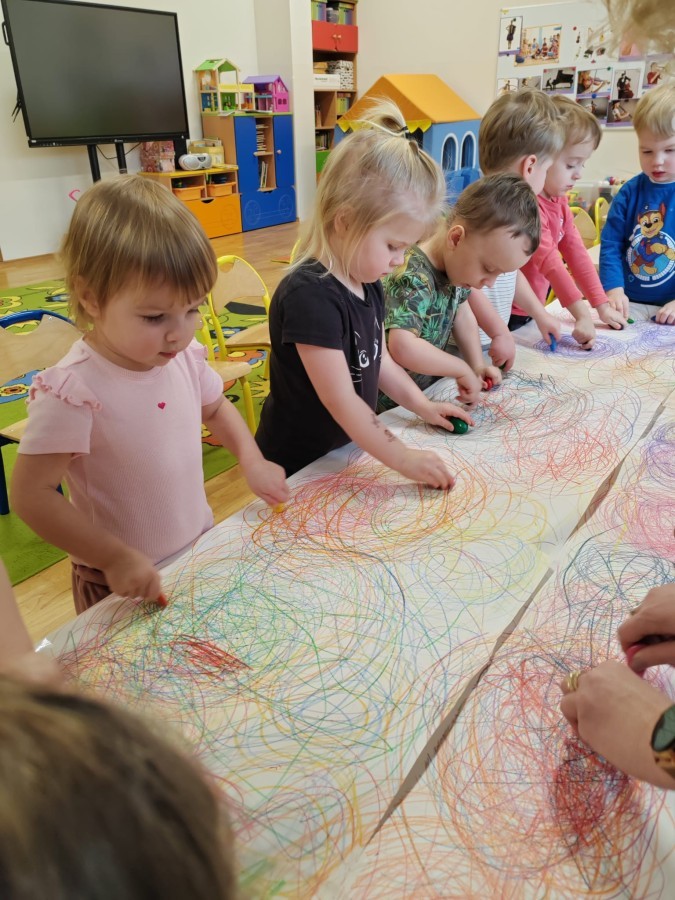 Grupa Biedronki w tym tygodniu przybliża się do pojęcia "muzyki". W dniu dzisiejszym dzieci słuchały utworów, a następnie łączyły słuchanie muzyki z ekspresją plastyczną. Jest to jedna z najskuteczniejszych metod rozwijania