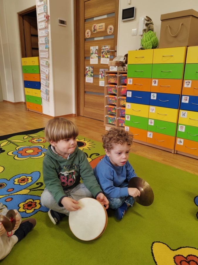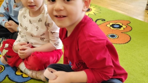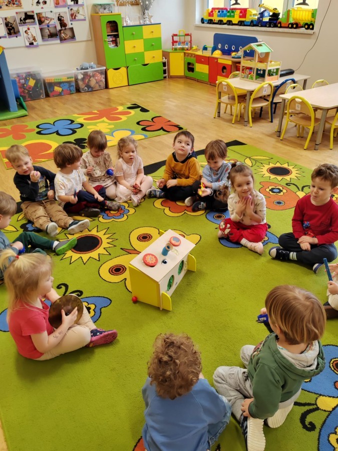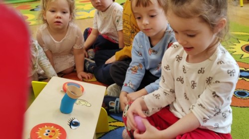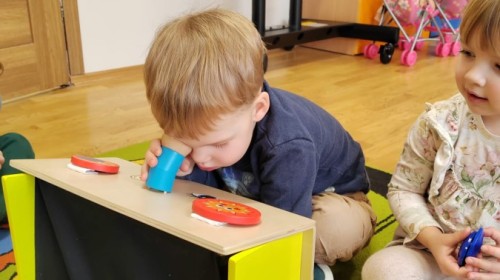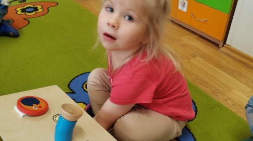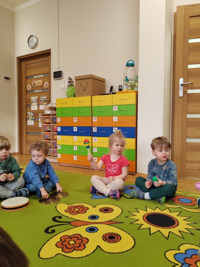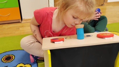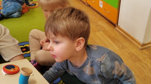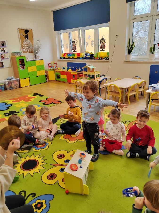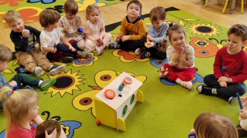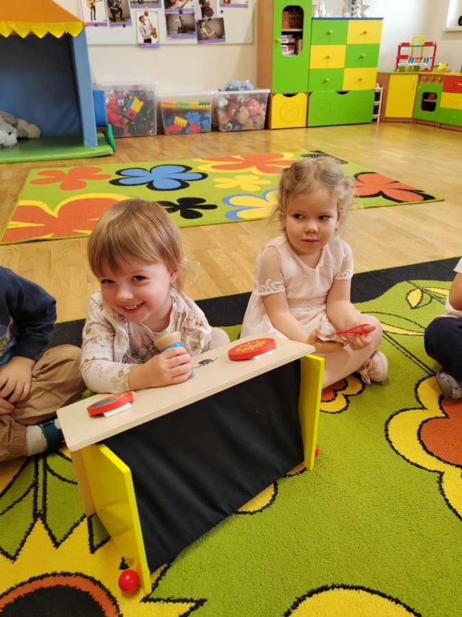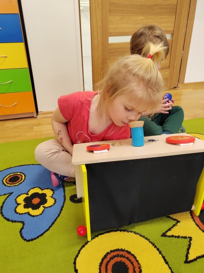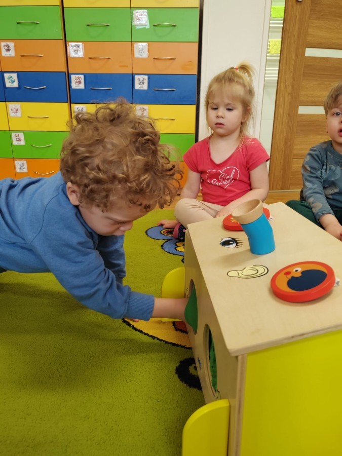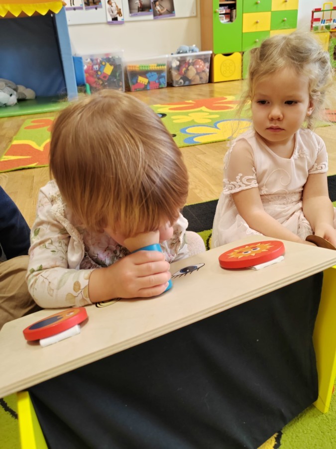 Łączenie muzyki z terapią sensoryczną to świetny sposób na rozwój słuchu, dotyku i motoryki, dlatego nasze przedszkolaki doświadczyły tego na zajęciach z poszukiwaniem muzyki w pudełku sensorycznym, poprzez dotyk i słuch mogły odgadywać jakie znajdują się w pudełku instrumenty, a także czasem podglądać, jeśli to było zbyt trudne zadanie. W tym dniu zabawa z muzyką zainicjowała prawdziwą orkiestrę, gdzie dzieci grały wg poznanej piosenki, ale także bawiły się w "Dyrygenta".