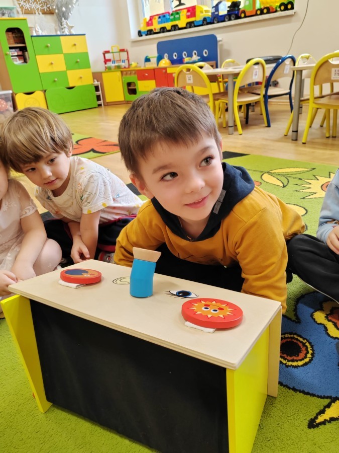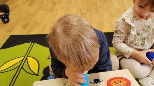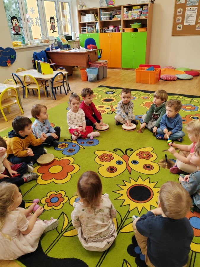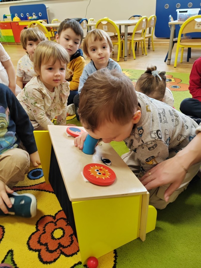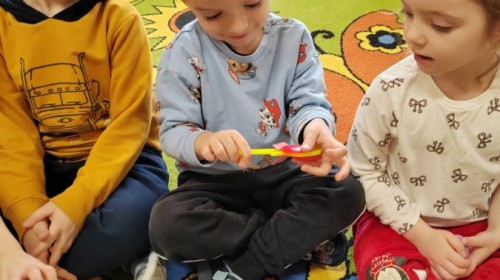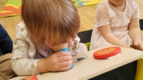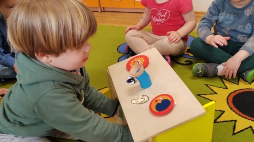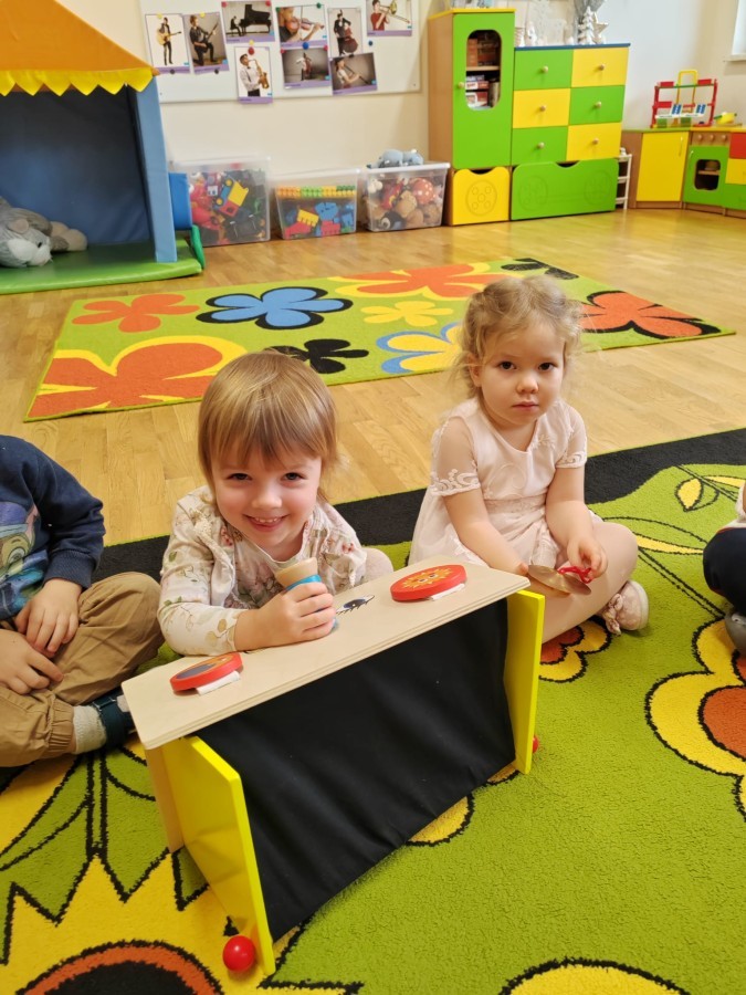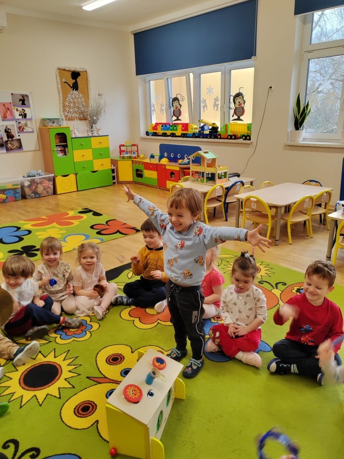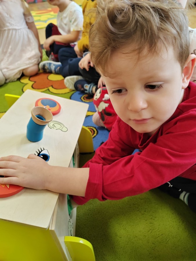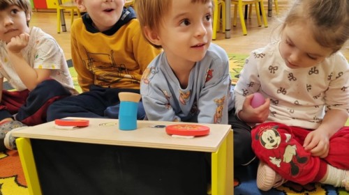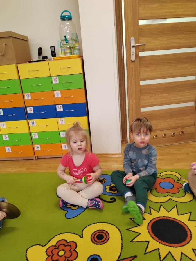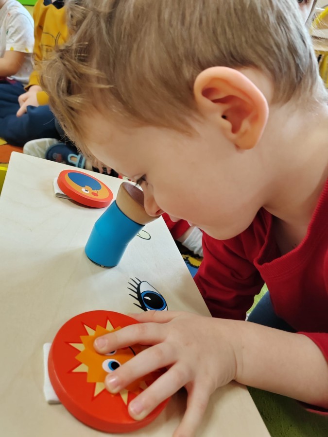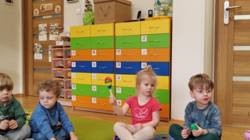 Łączenie muzyki z terapią sensoryczną to świetny sposób na rozwój słuchu, dotyku i motoryki, dlatego nasze przedszkolaki doświadczyły tego na zajęciach z poszukiwaniem muzyki w pudełku sensorycznym, poprzez dotyk i słuch mogły odgadywać jakie znajdują się w pudełku instrumenty, a także czasem podglądać, jeśli to było zbyt trudne zadanie. W tym dniu zabawa z muzyką zainicjowała prawdziwą orkiestrę, gdzie dzieci grały wg poznanej piosenki, ale także bawiły się w "Dyrygenta".