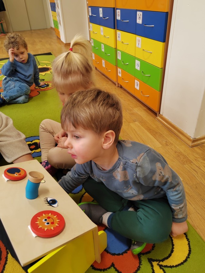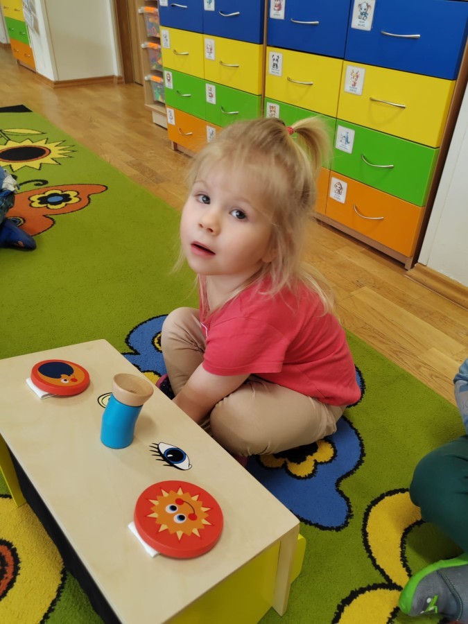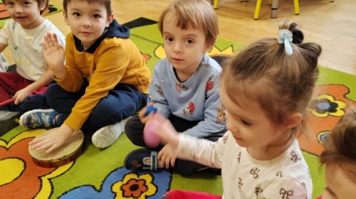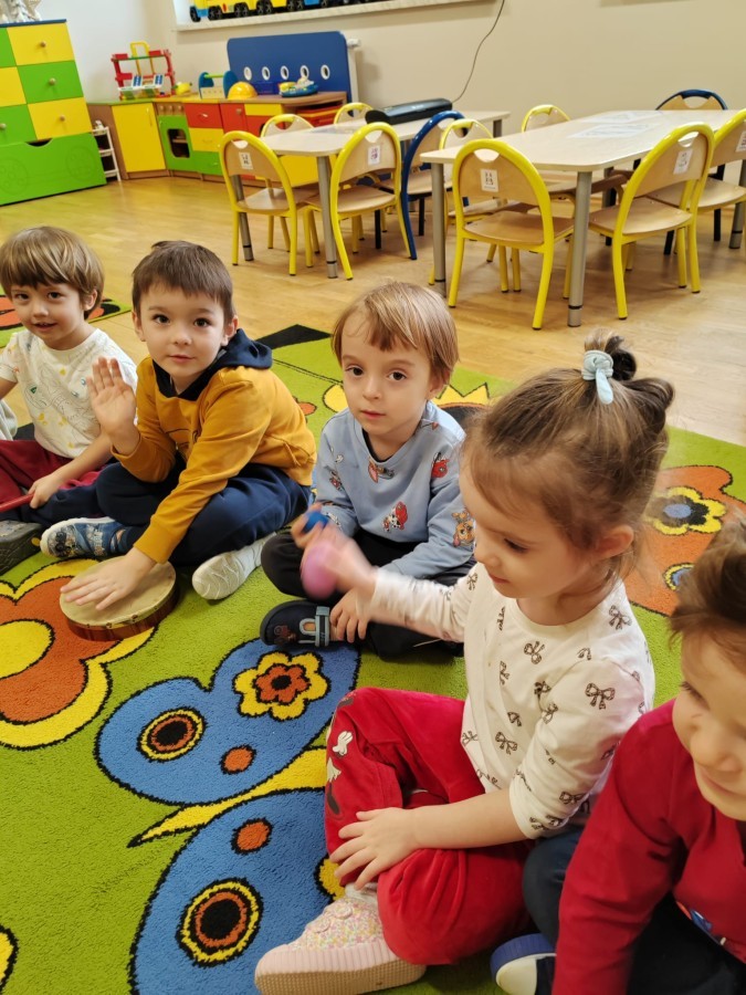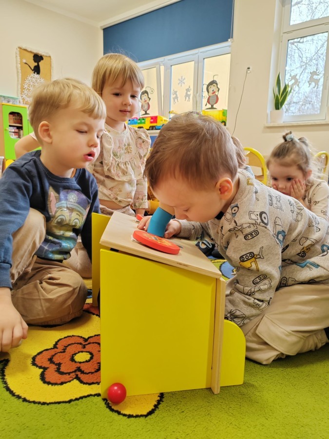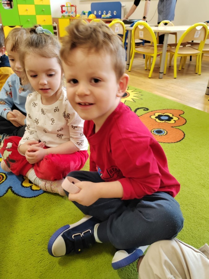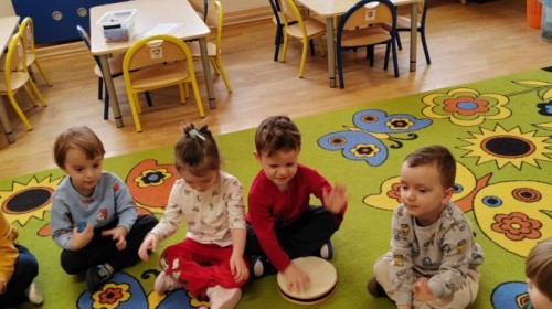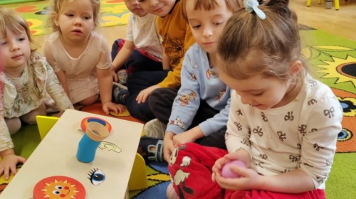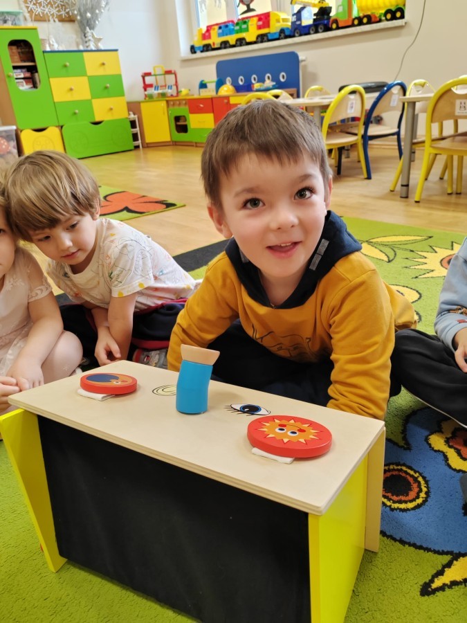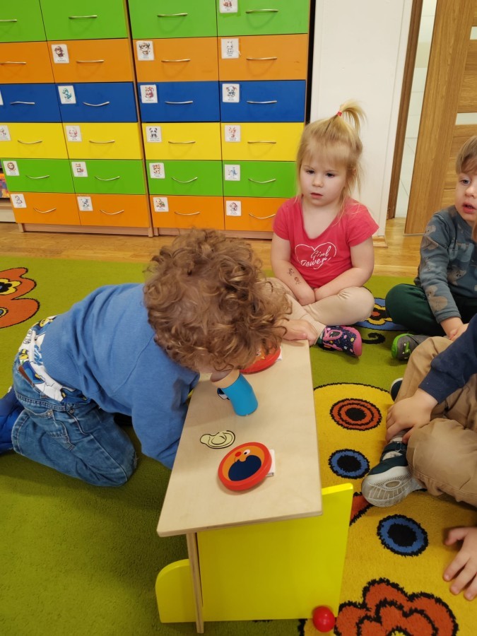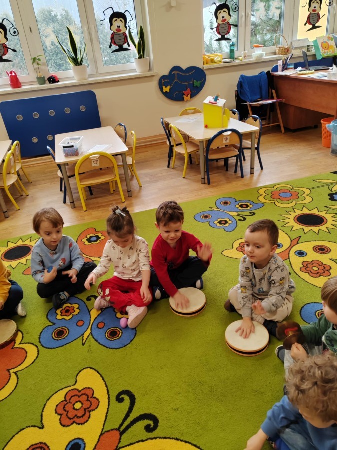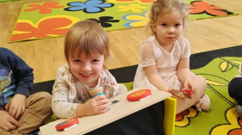 Łączenie muzyki z terapią sensoryczną to świetny sposób na rozwój słuchu, dotyku i motoryki, dlatego nasze przedszkolaki doświadczyły tego na zajęciach z poszukiwaniem muzyki w pudełku sensorycznym, poprzez dotyk i słuch mogły odgadywać jakie znajdują się w pudełku instrumenty, a także czasem podglądać, jeśli to było zbyt trudne zadanie. W tym dniu zabawa z muzyką zainicjowała prawdziwą orkiestrę, gdzie dzieci grały wg poznanej piosenki, ale także bawiły się w "Dyrygenta".