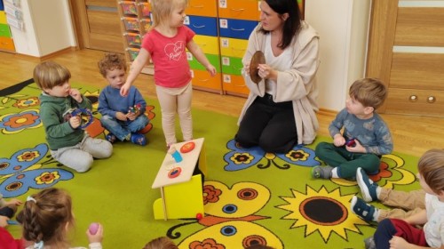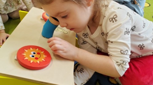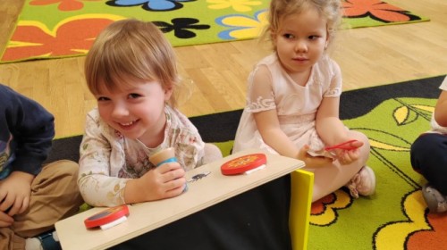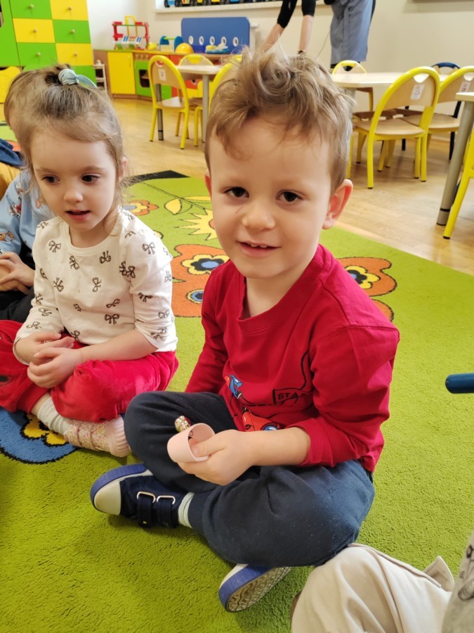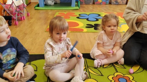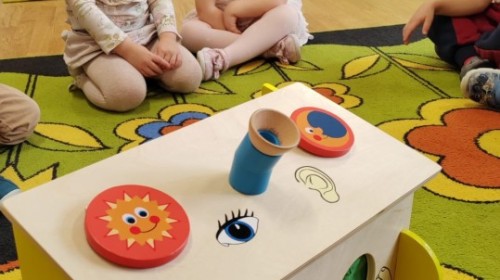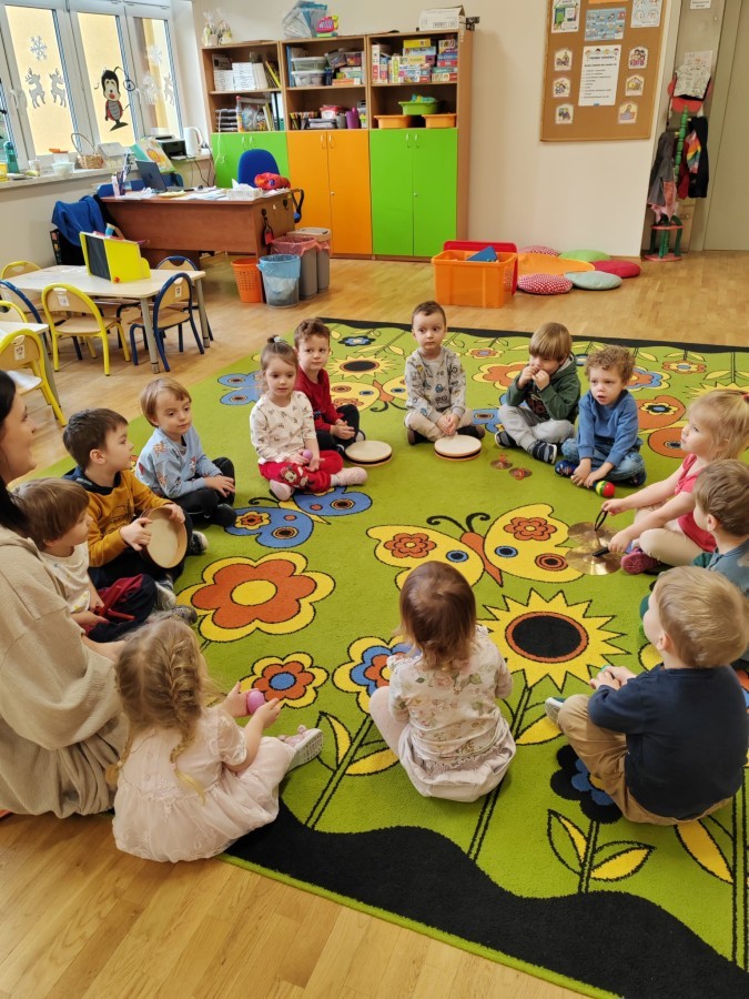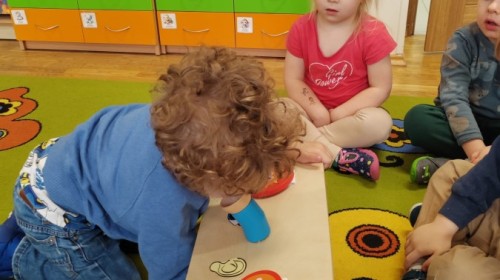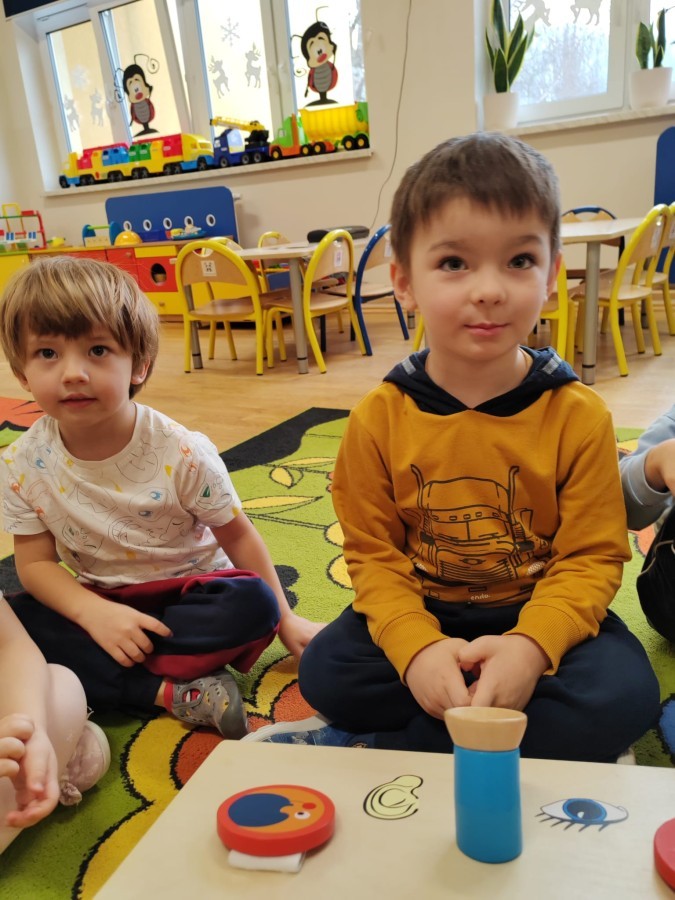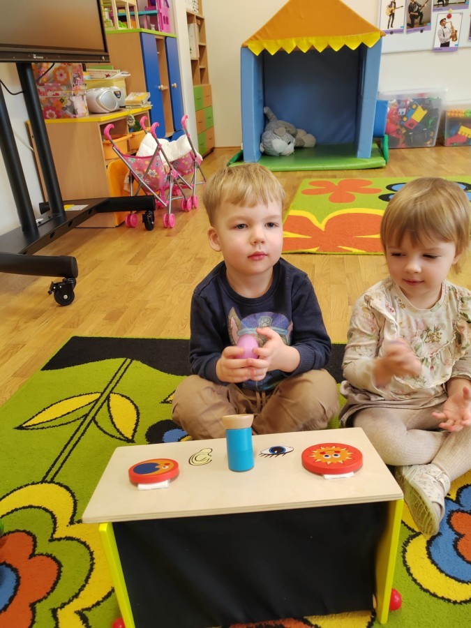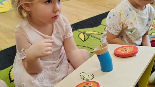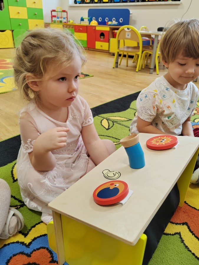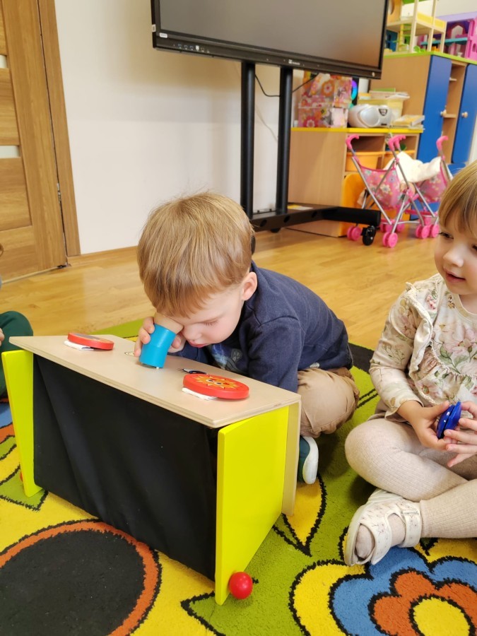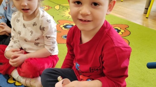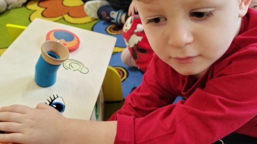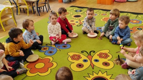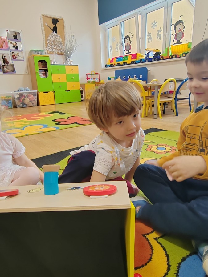Łączenie muzyki z terapią sensoryczną to świetny sposób na rozwój słuchu, dotyku i motoryki, dlatego nasze przedszkolaki doświadczyły tego na zajęciach z poszukiwaniem muzyki w pudełku sensorycznym, poprzez dotyk i słuch mogły odgadywać jakie znajdują się w pudełku instrumenty, a także czasem podglądać, jeśli to było zbyt trudne zadanie. W tym dniu zabawa z muzyką zainicjowała prawdziwą orkiestrę, gdzie dzieci grały wg poznanej piosenki, ale także bawiły się w "Dyrygenta".