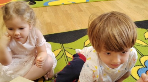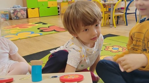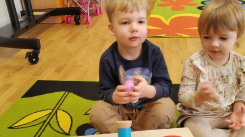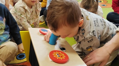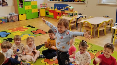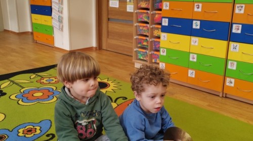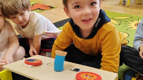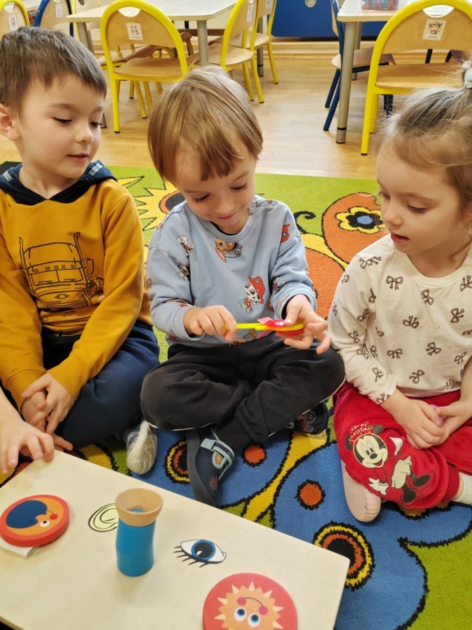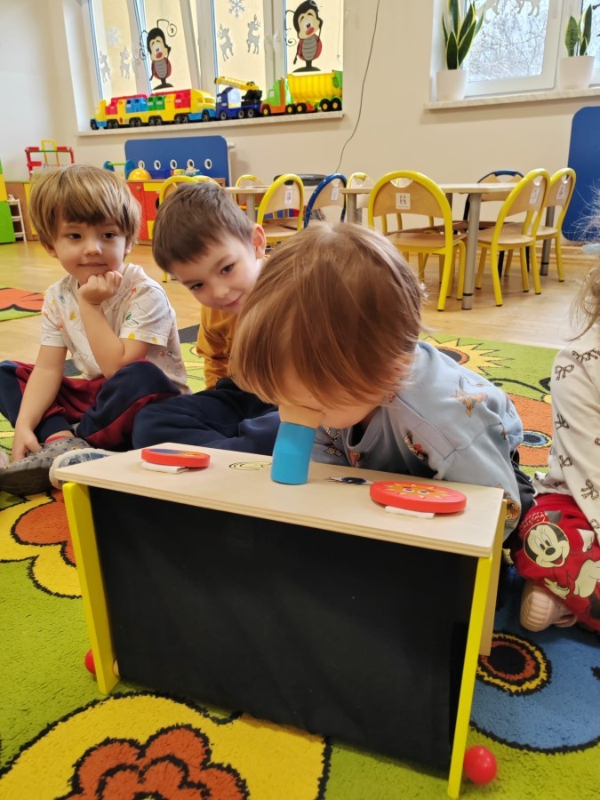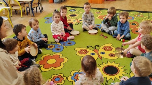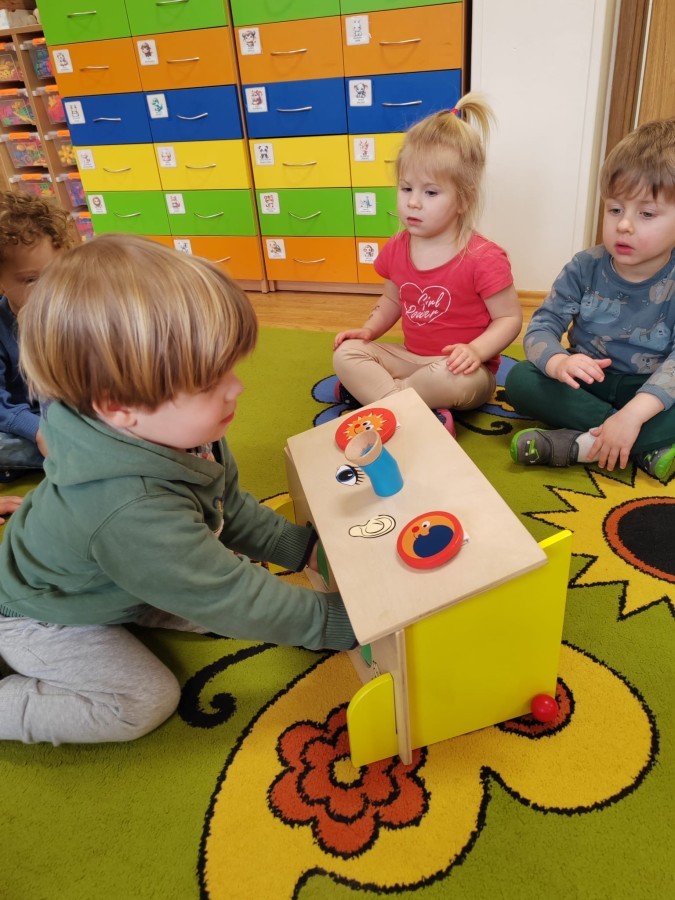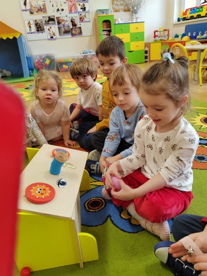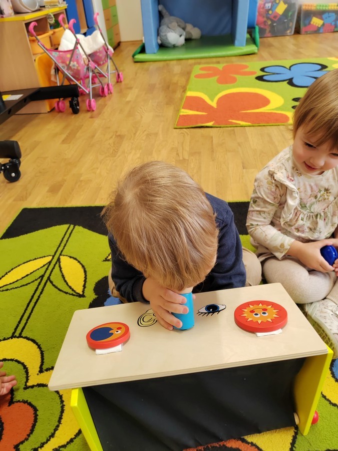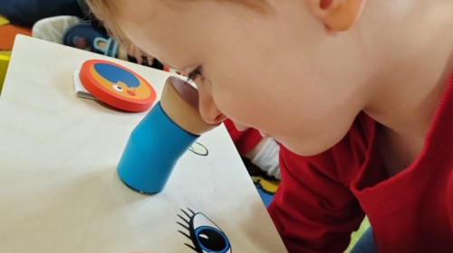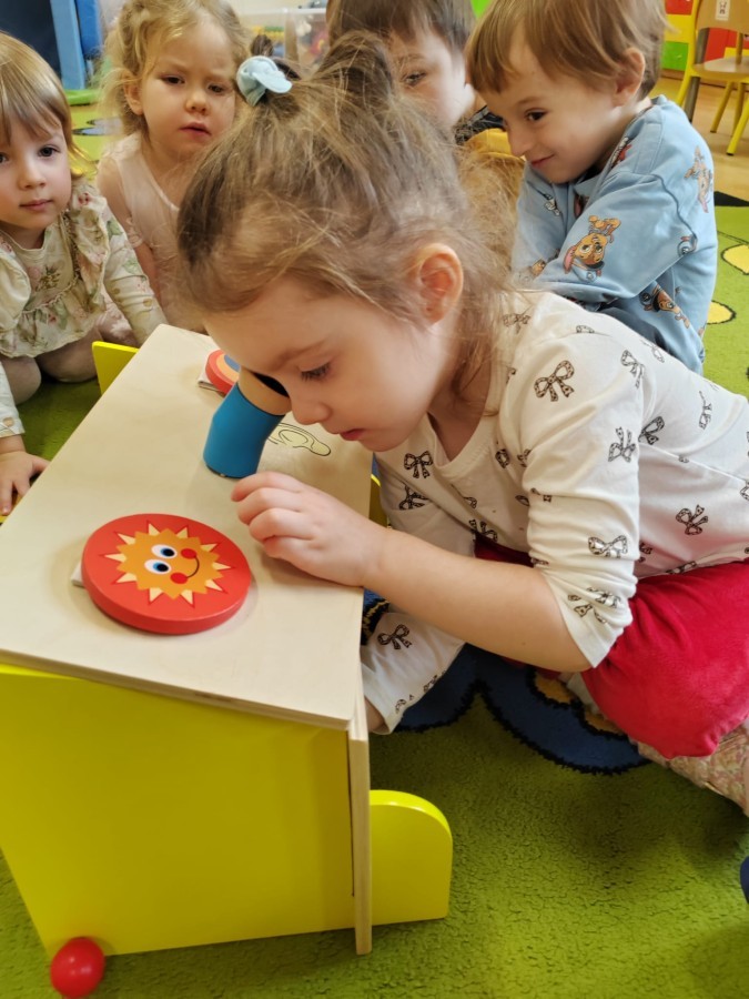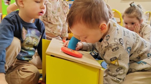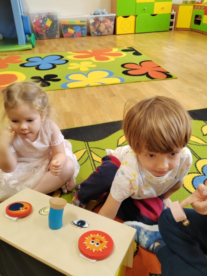 Łączenie muzyki z terapią sensoryczną to świetny sposób na rozwój słuchu, dotyku i motoryki, dlatego nasze przedszkolaki doświadczyły tego na zajęciach z poszukiwaniem muzyki w pudełku sensorycznym, poprzez dotyk i słuch mogły odgadywać jakie znajdują się w pudełku instrumenty, a także czasem podglądać, jeśli to było zbyt trudne zadanie. W tym dniu zabawa z muzyką zainicjowała prawdziwą orkiestrę, gdzie dzieci grały wg poznanej piosenki, ale także bawiły się w "Dyrygenta".