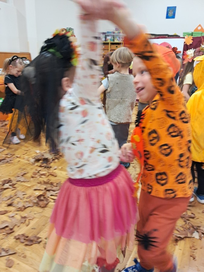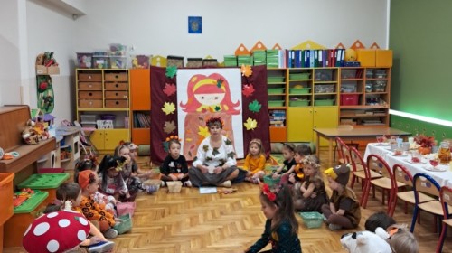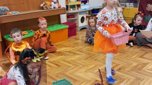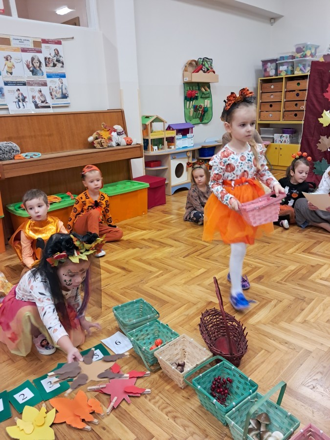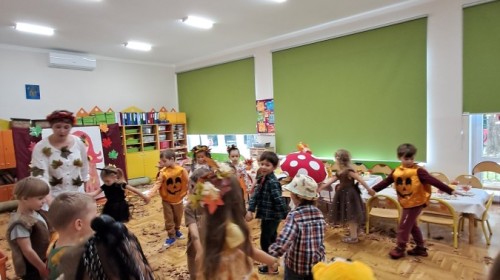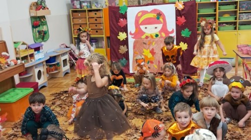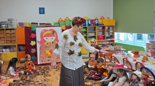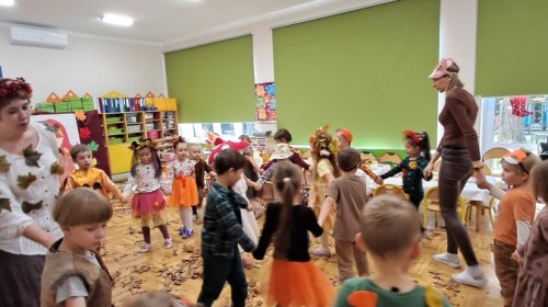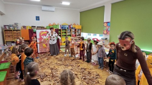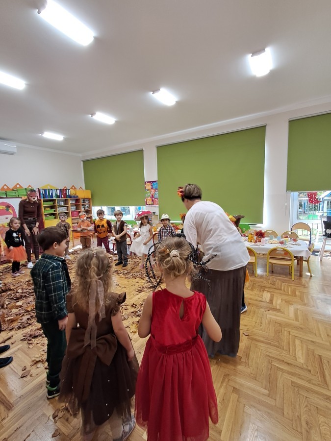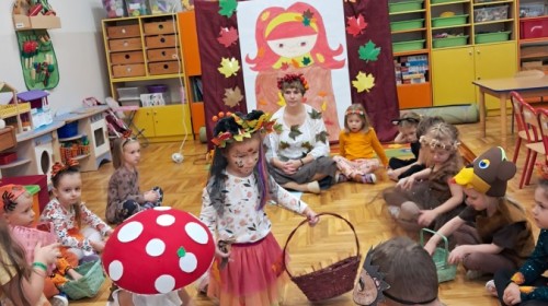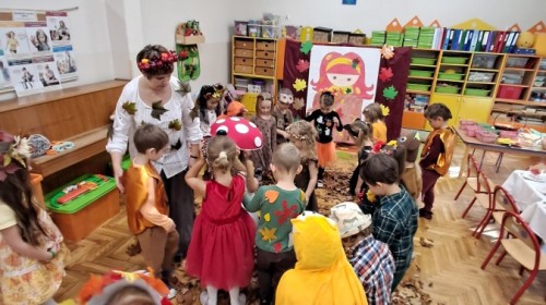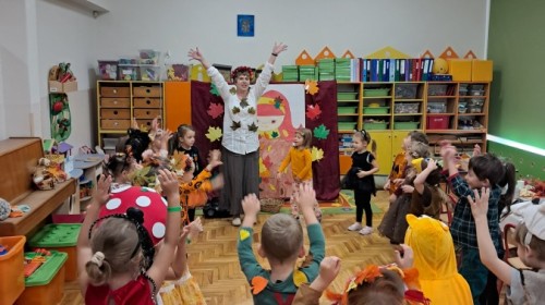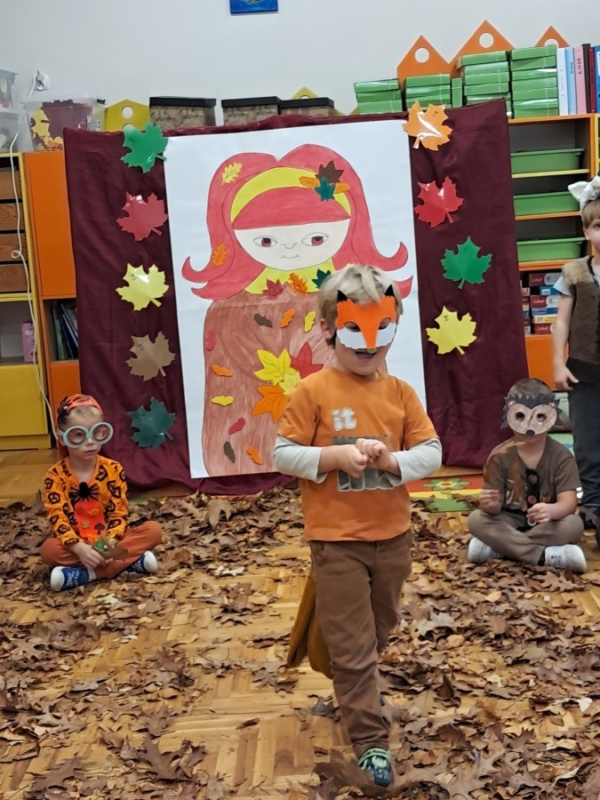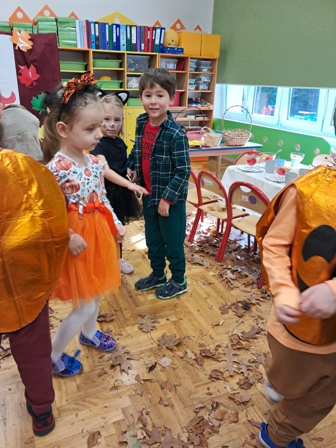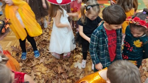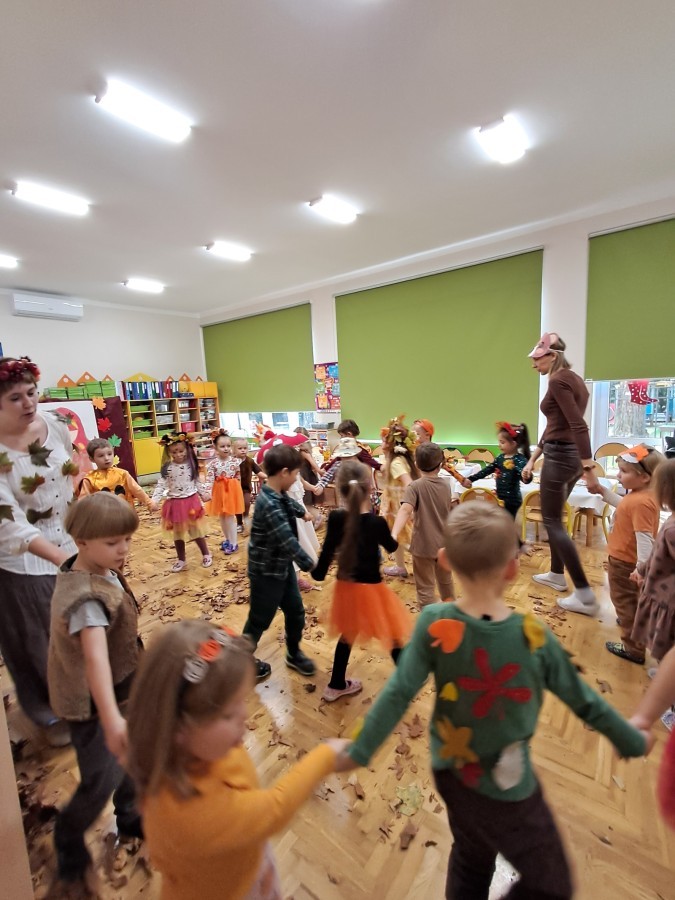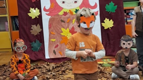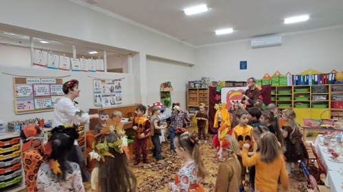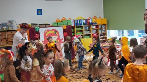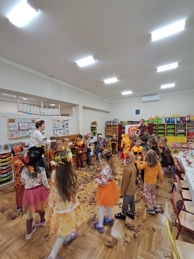 Wśród szeleszczących liści i przy dźwiękach jesiennych piosenek odbył się bal Lisków. Przygotowane zostały pyszne deserki z kolorową galaretką, pokaz mody jesiennej oraz zabawa taneczna. Liski policzyły skarby z koszyka Pani Jesieni, zagrały na kasztankach, pięknie zaprezentowały swoje stroje na wybiegu oraz super się bawiły. Kręciły piruety z Leśną Wróżką, ruszały skrzydełkami do Kaczuszek, tańczyły z Pszczółką Mają, a na koniec wsiadły do jesiennego pociągu i dojechały do stacji: Deserkowo.