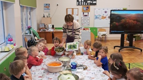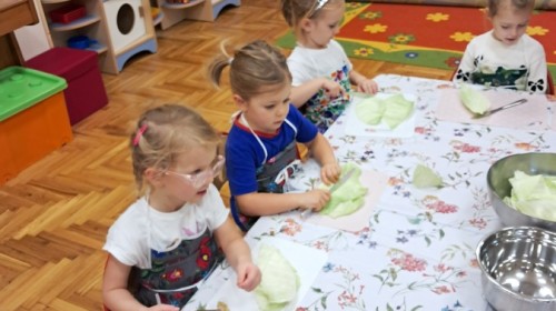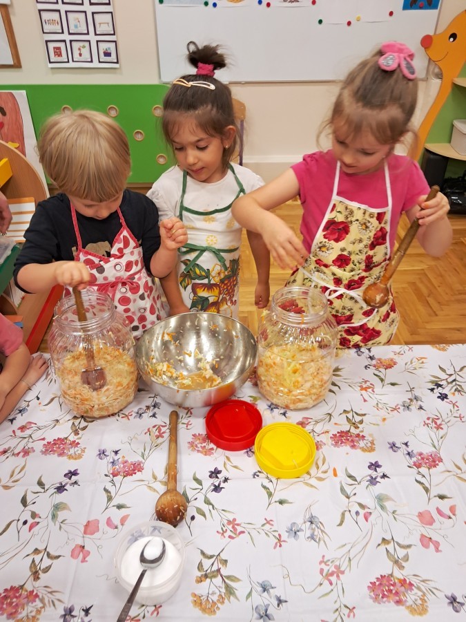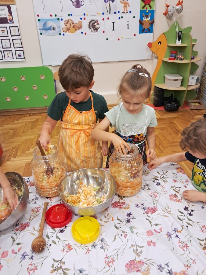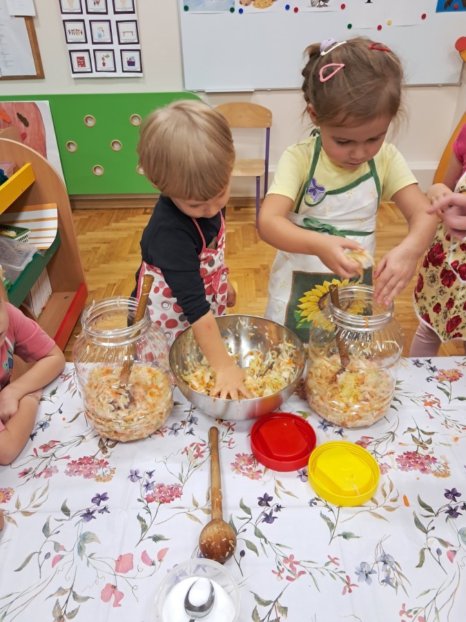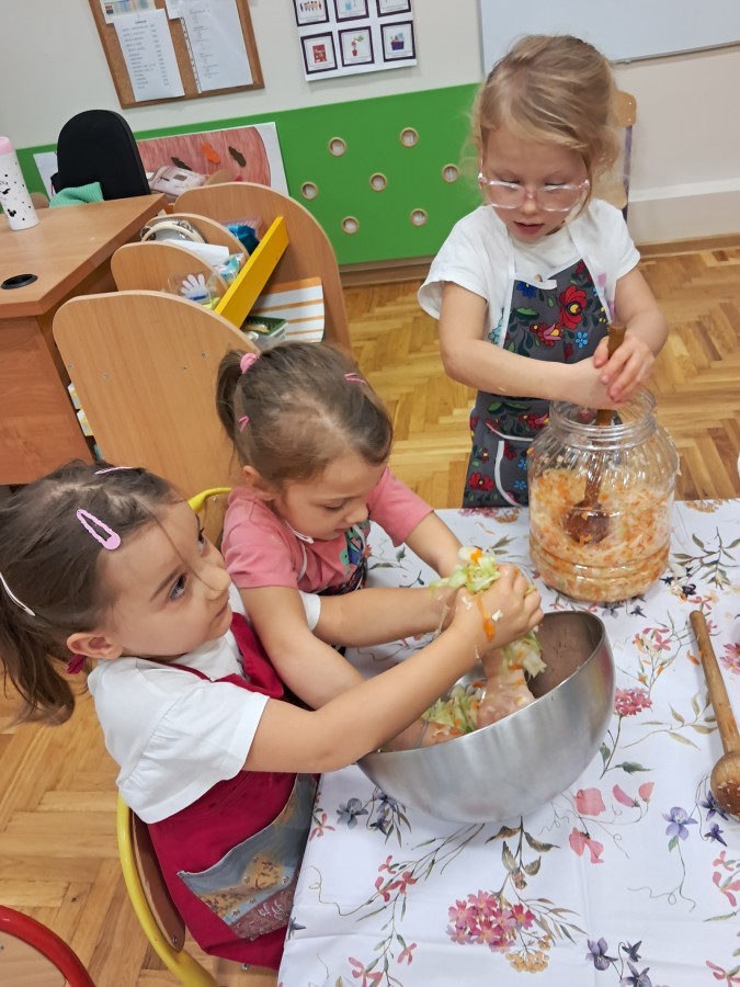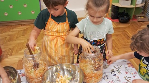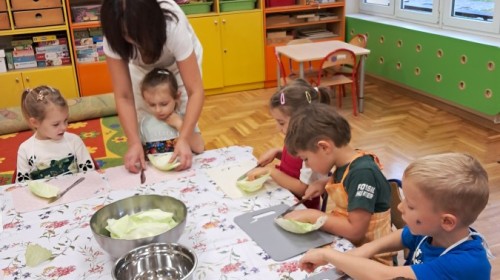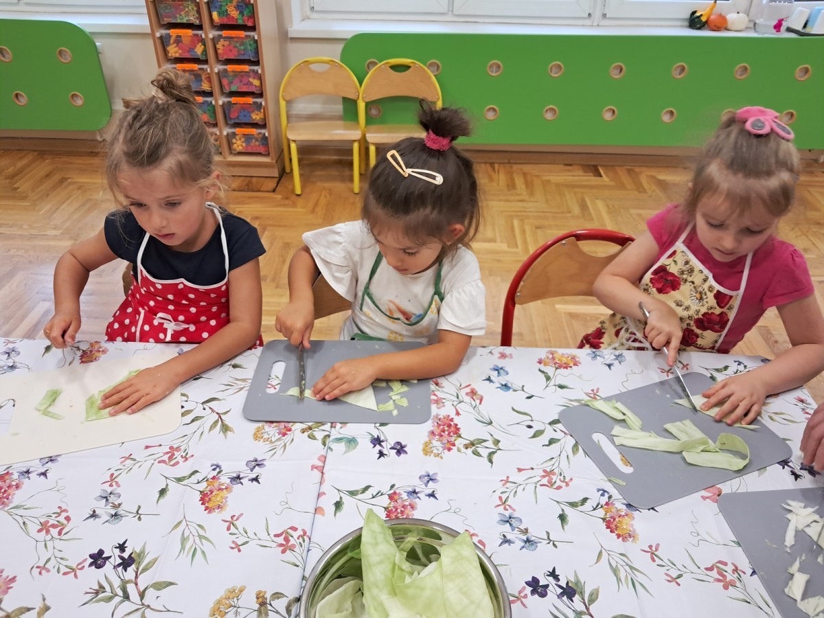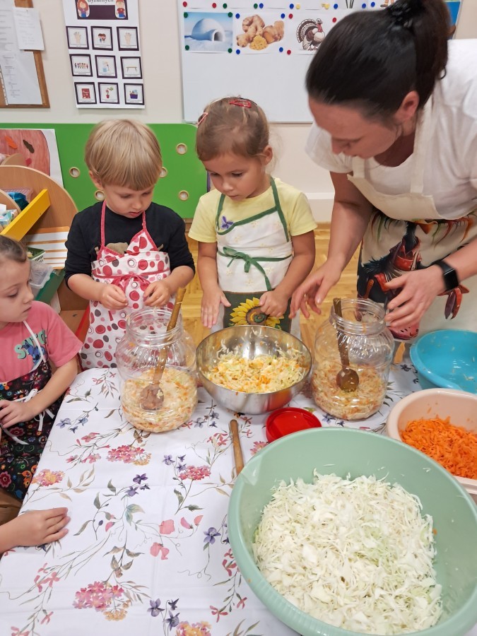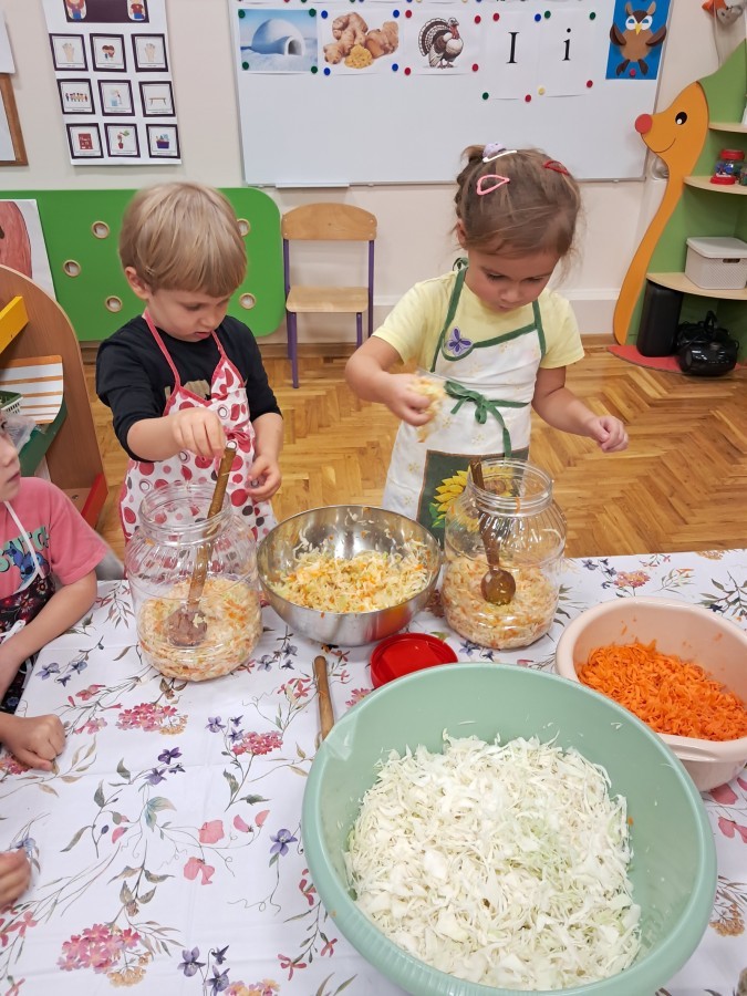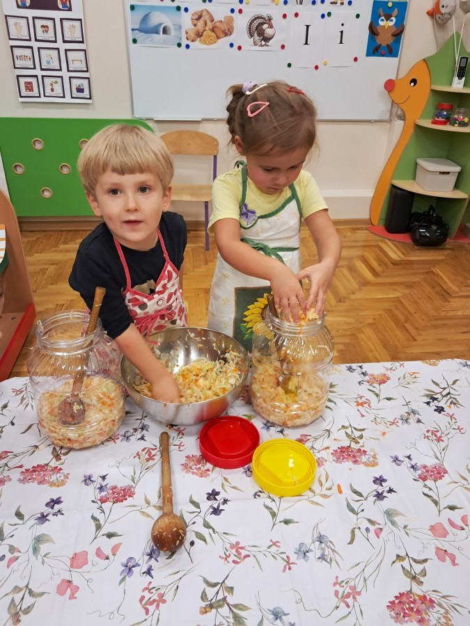 Liski zrealizowały pierwsze zadanie z Ogólnopolskiego Projektu ,,Eko przedszkolaki" pt: ,,Kiszonki-co to takiego?". Dowiedziały się co to są kiszonki, jak smakują, po co kisimy warzywa i pod czujnym okiem Pani Kasi i Iwonki zakisiły kapustę. Dodatkowo zwiedziły kuchnię, gdzie przygotowuje się pyszne przedszkolne posiłki.