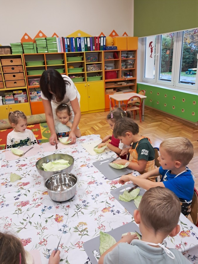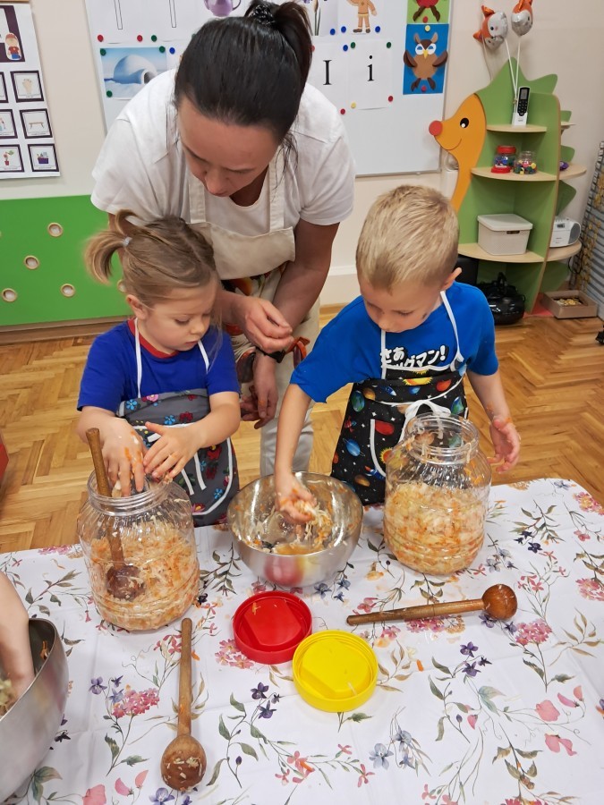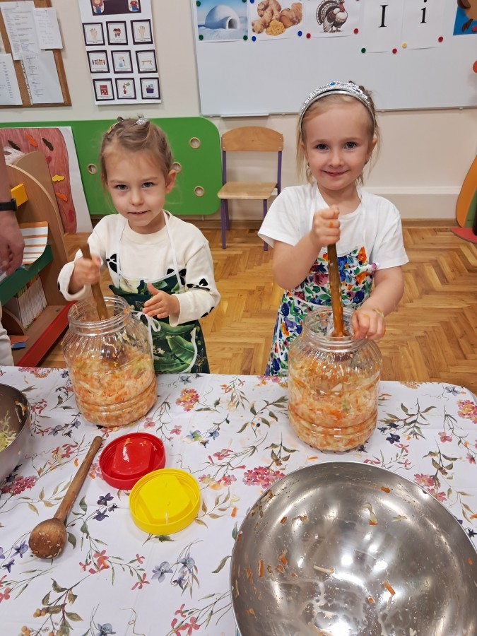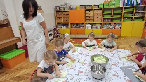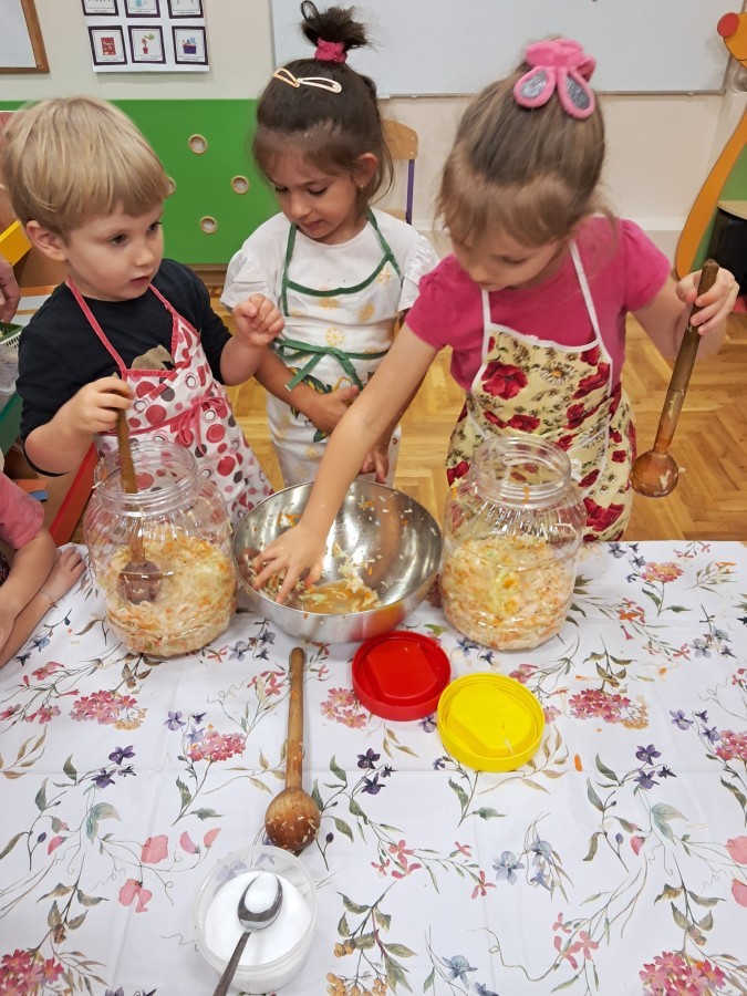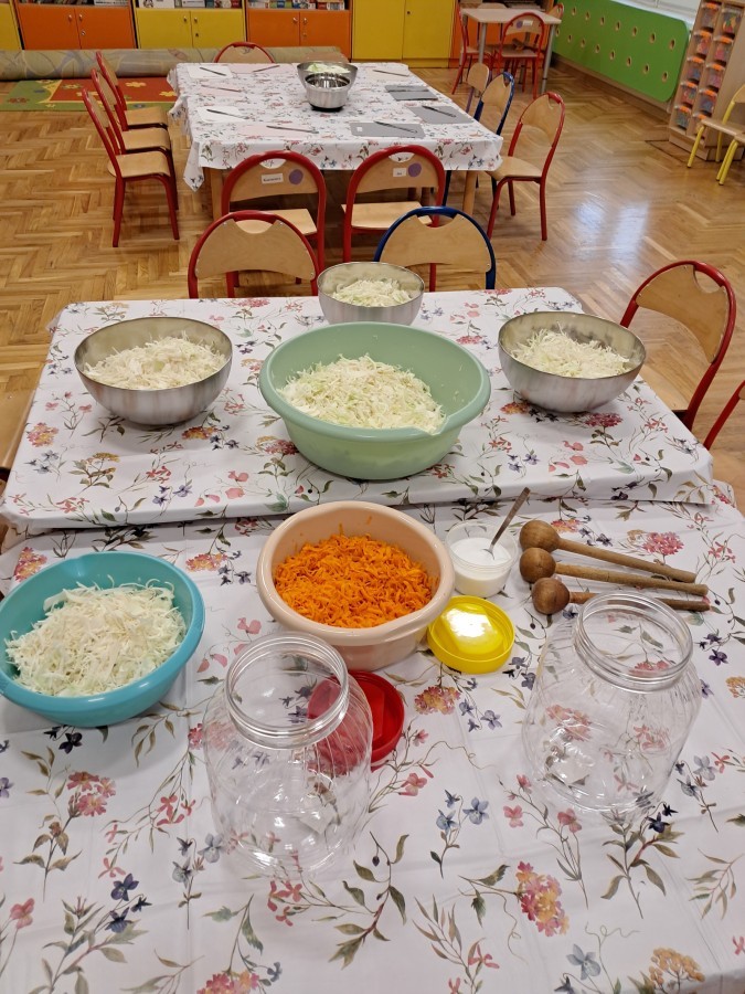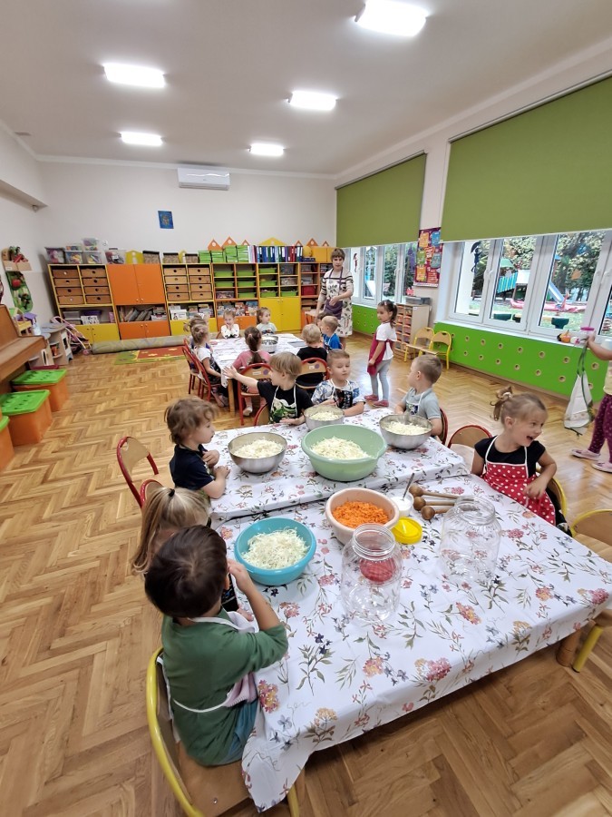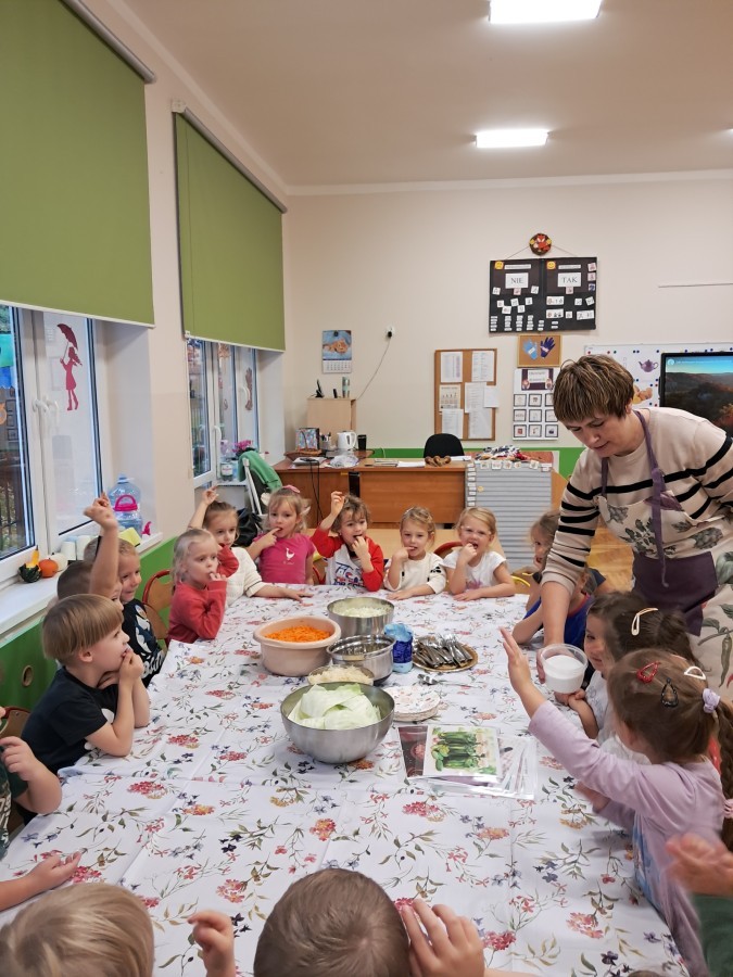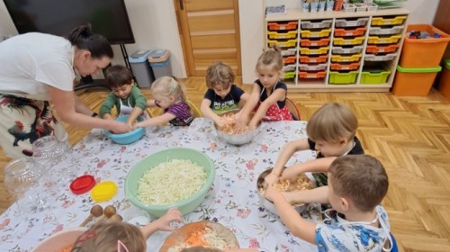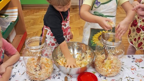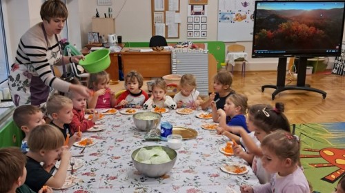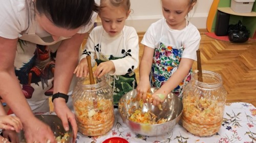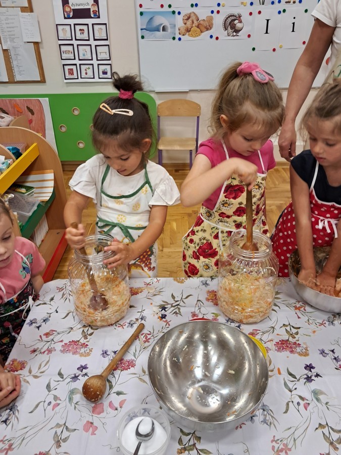 Liski zrealizowały pierwsze zadanie z Ogólnopolskiego Projektu ,,Eko przedszkolaki" pt: ,,Kiszonki-co to takiego?". Dowiedziały się co to są kiszonki, jak smakują, po co kisimy warzywa i pod czujnym okiem Pani Kasi i Iwonki zakisiły kapustę. Dodatkowo zwiedziły kuchnię, gdzie przygotowuje się pyszne przedszkolne posiłki.