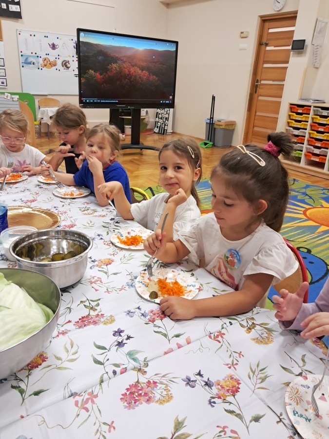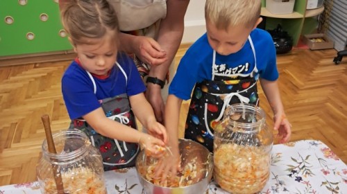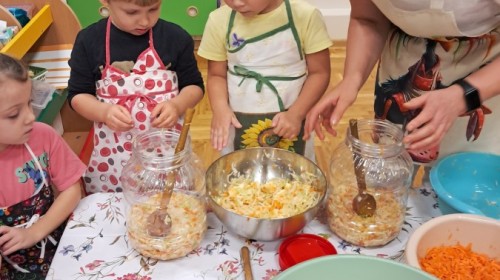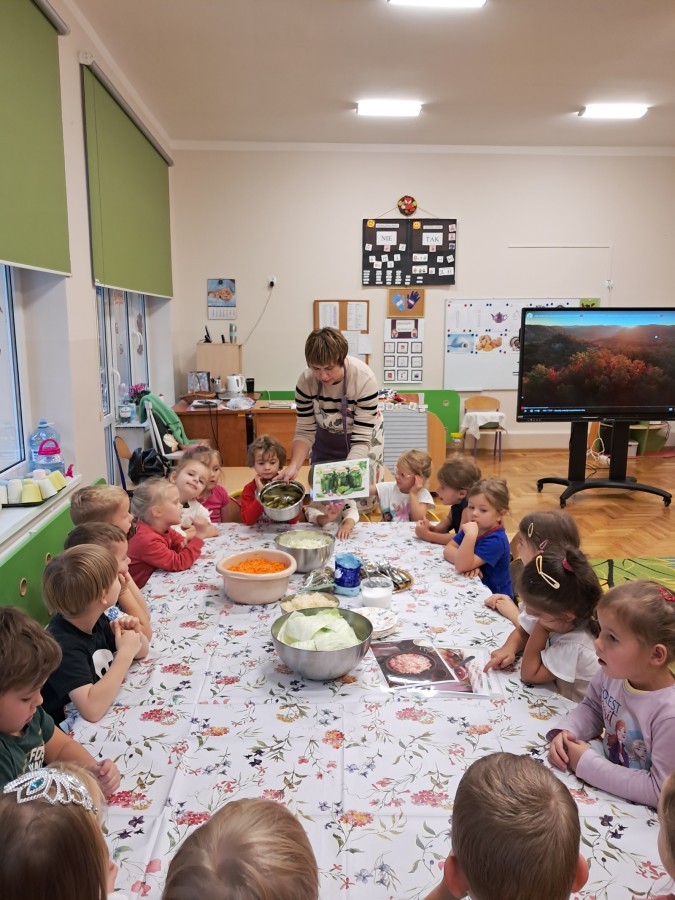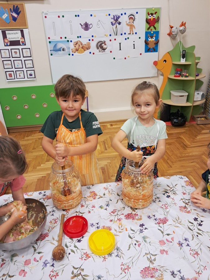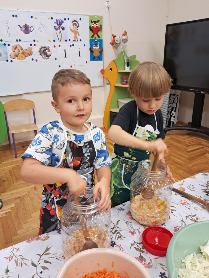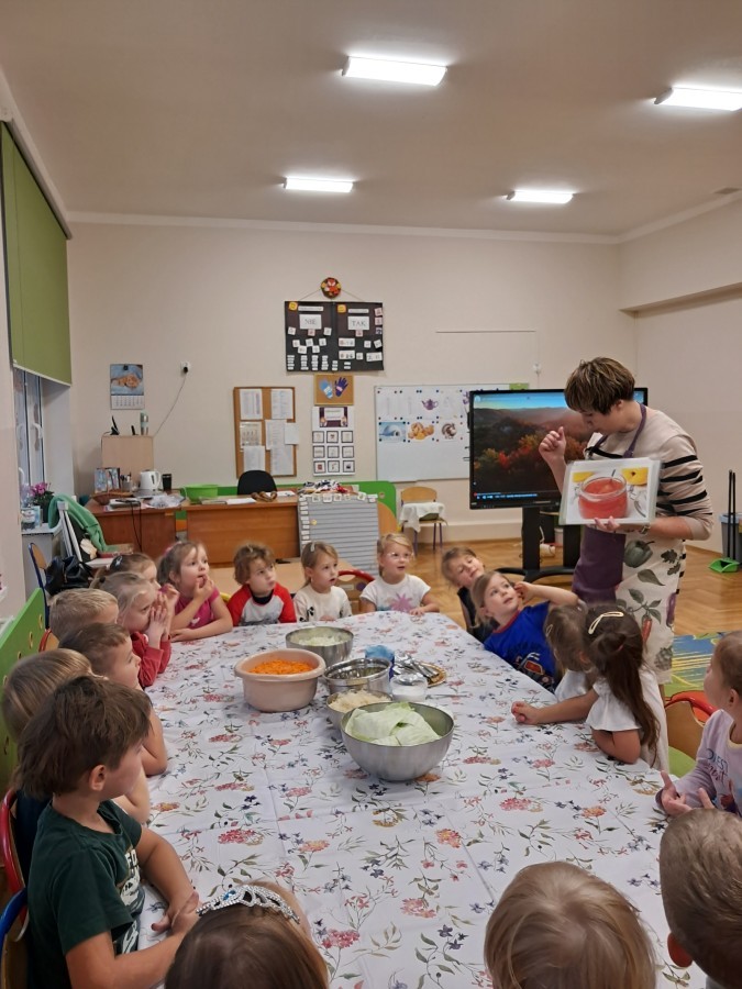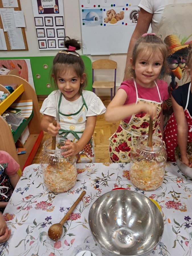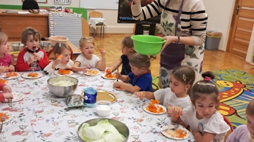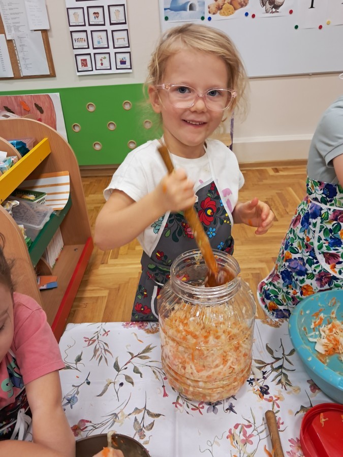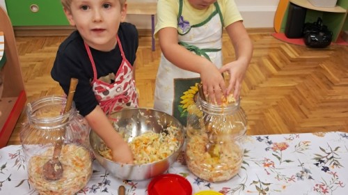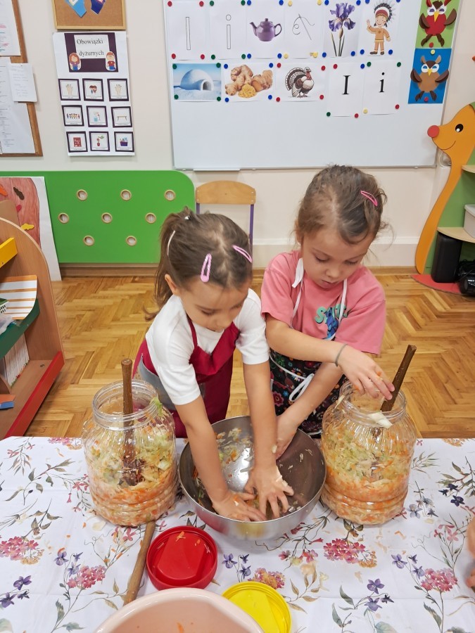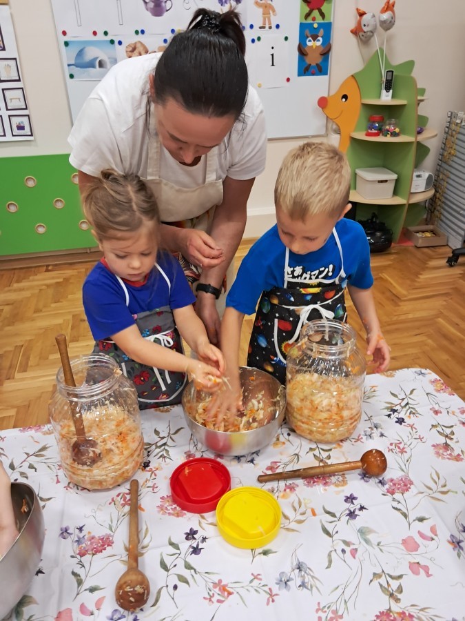 Liski zrealizowały pierwsze zadanie z Ogólnopolskiego Projektu ,,Eko przedszkolaki" pt: ,,Kiszonki-co to takiego?". Dowiedziały się co to są kiszonki, jak smakują, po co kisimy warzywa i pod czujnym okiem Pani Kasi i Iwonki zakisiły kapustę. Dodatkowo zwiedziły kuchnię, gdzie przygotowuje się pyszne przedszkolne posiłki.