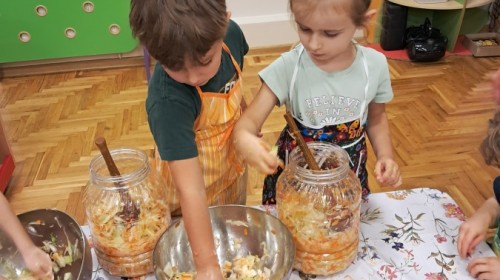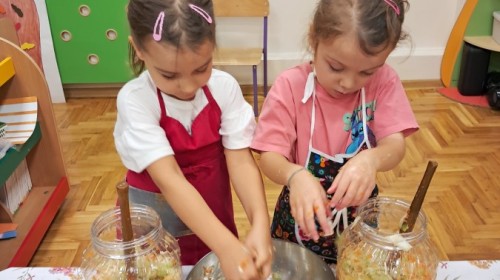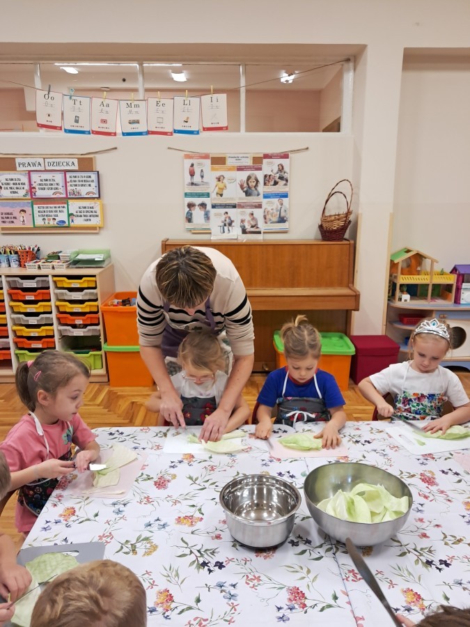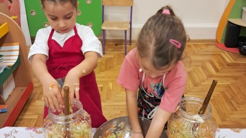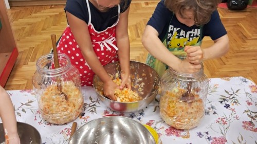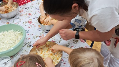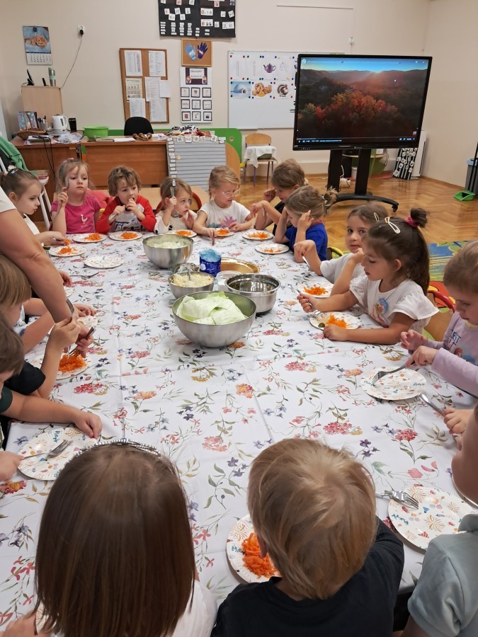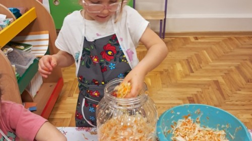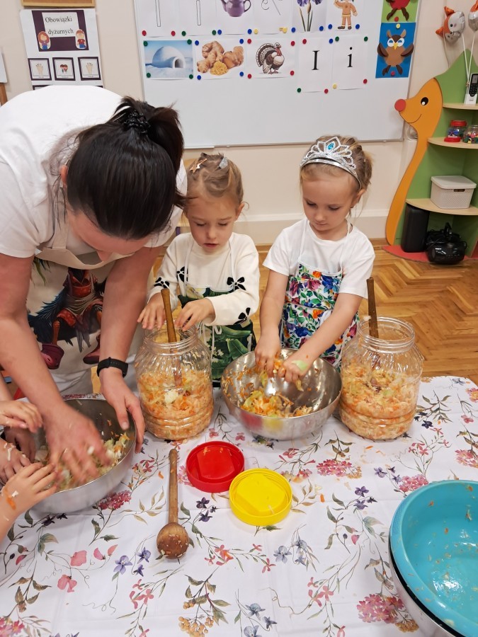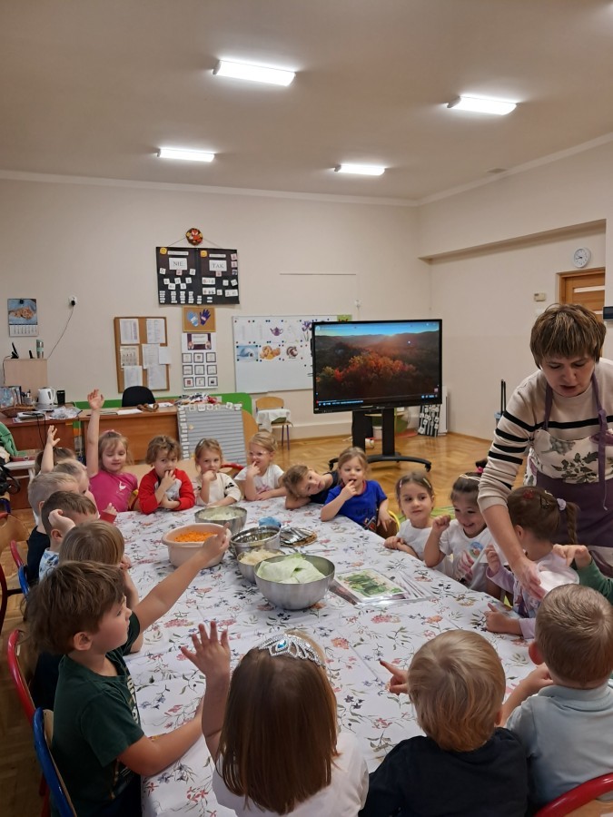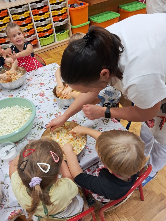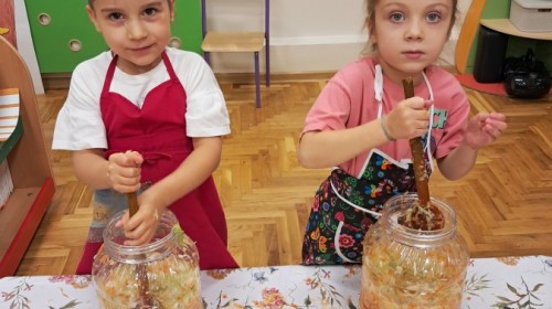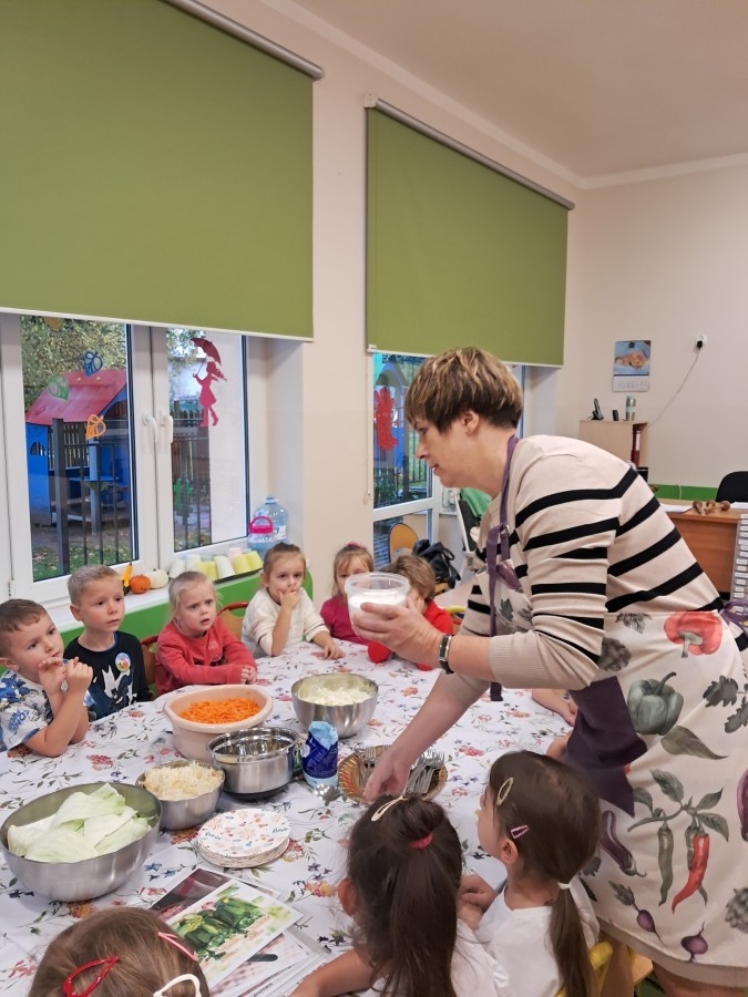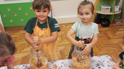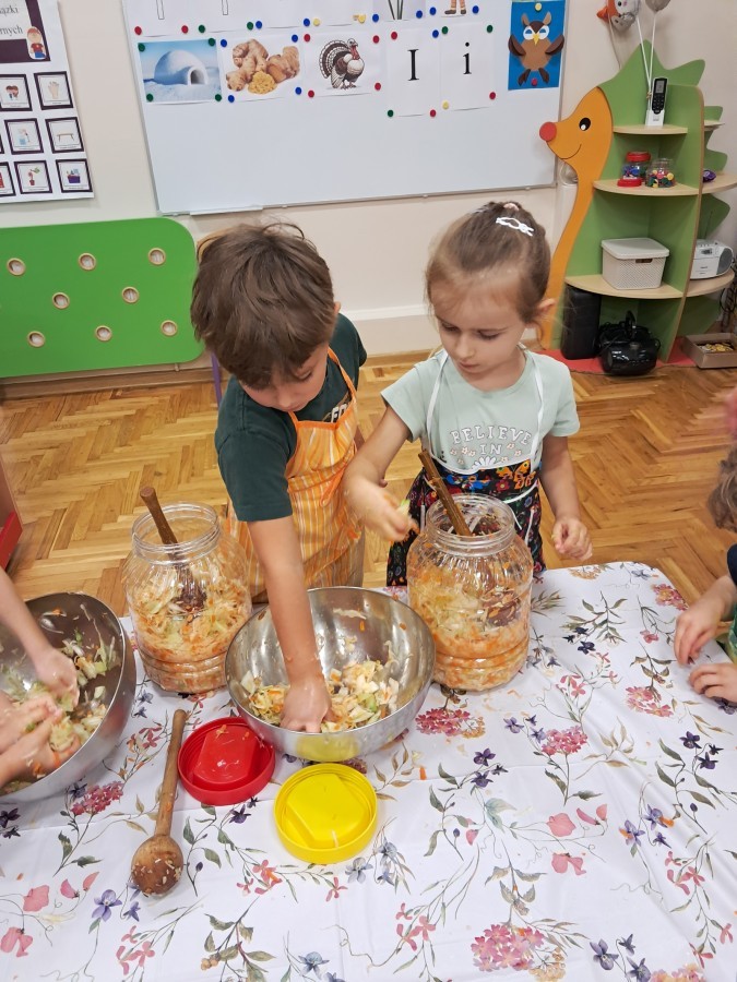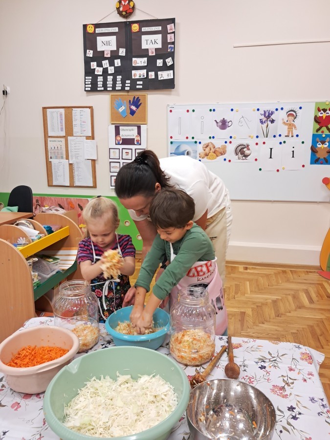 Liski zrealizowały pierwsze zadanie z Ogólnopolskiego Projektu ,,Eko przedszkolaki" pt: ,,Kiszonki-co to takiego?". Dowiedziały się co to są kiszonki, jak smakują, po co kisimy warzywa i pod czujnym okiem Pani Kasi i Iwonki zakisiły kapustę. Dodatkowo zwiedziły kuchnię, gdzie przygotowuje się pyszne przedszkolne posiłki.