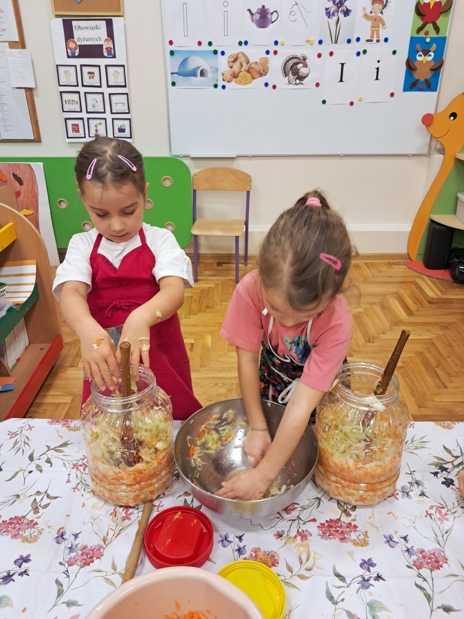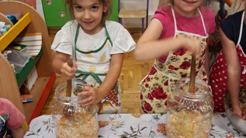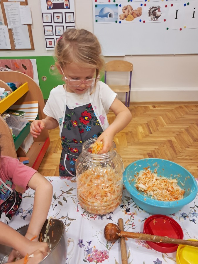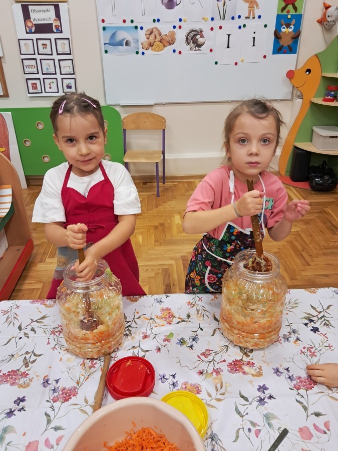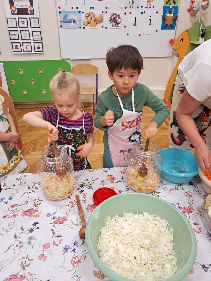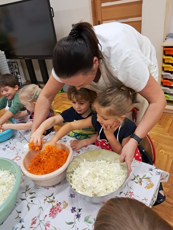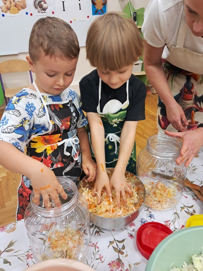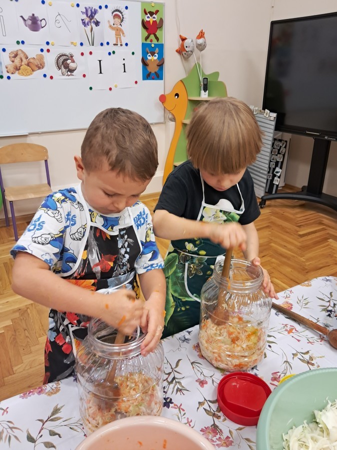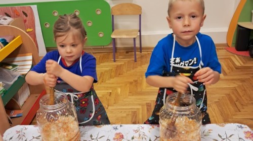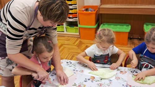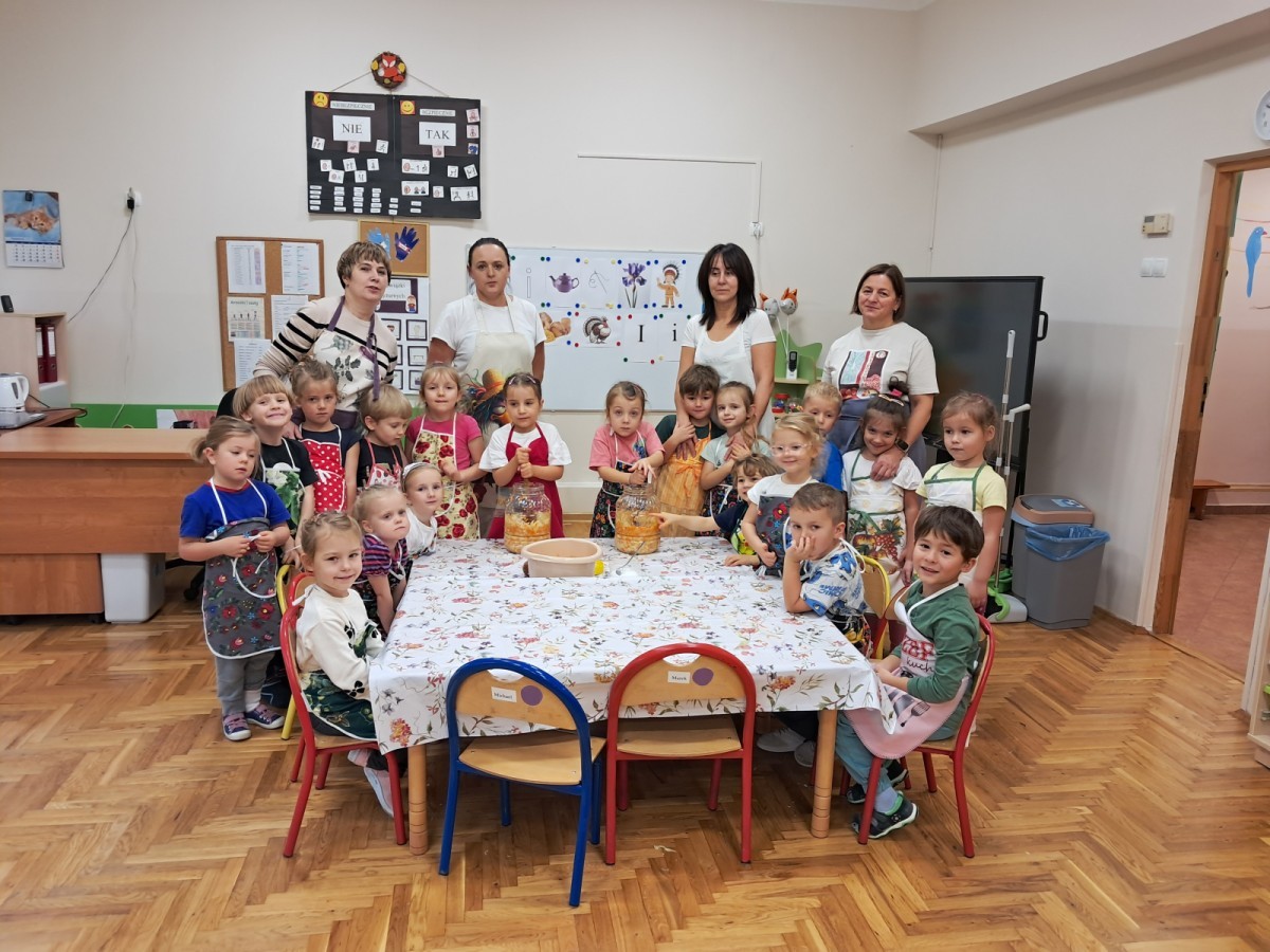Liski zrealizowały pierwsze zadanie z Ogólnopolskiego Projektu ,,Eko przedszkolaki" pt: ,,Kiszonki-co to takiego?". Dowiedziały się co to są kiszonki, jak smakują, po co kisimy warzywa i pod czujnym okiem Pani Kasi i Iwonki zakisiły kapustę. Dodatkowo zwiedziły kuchnię, gdzie przygotowuje się pyszne przedszkolne posiłki.