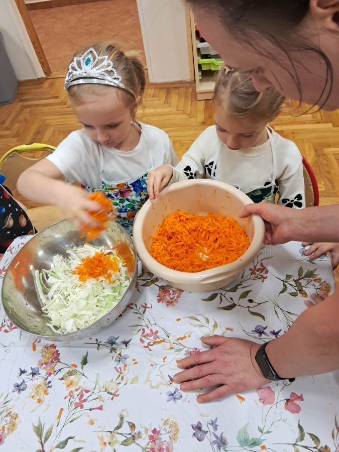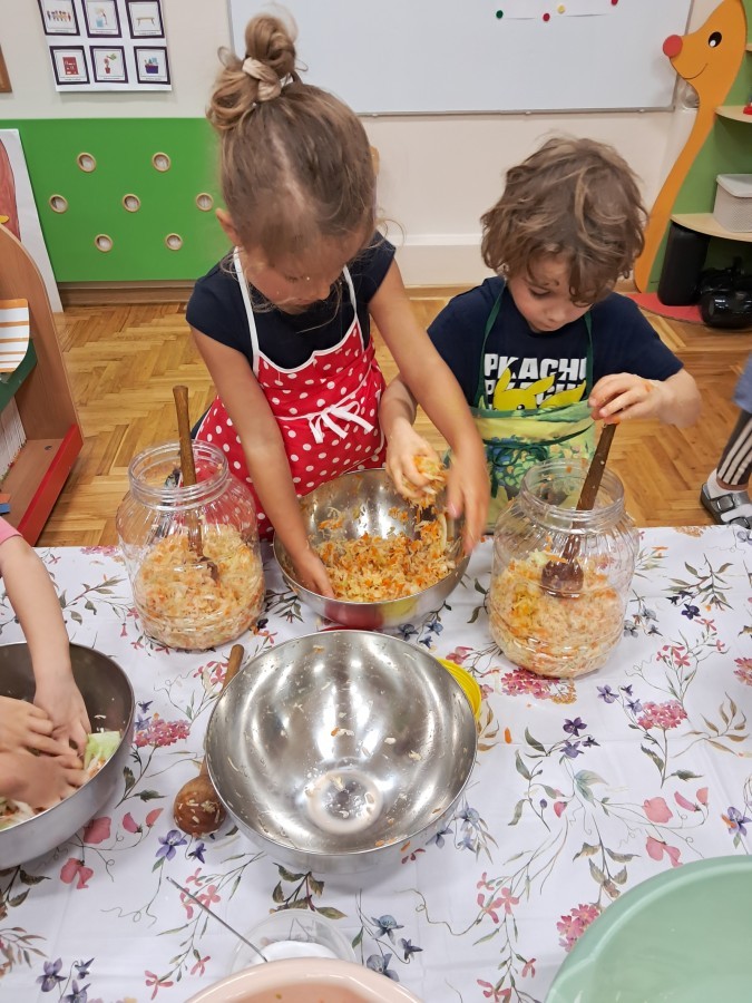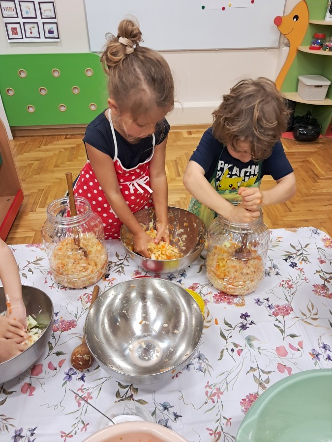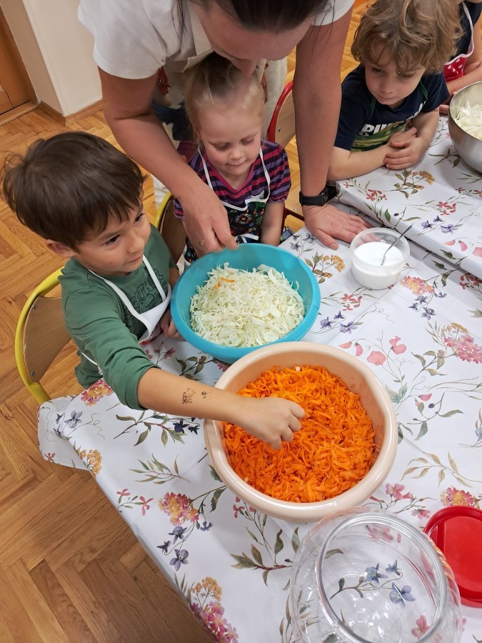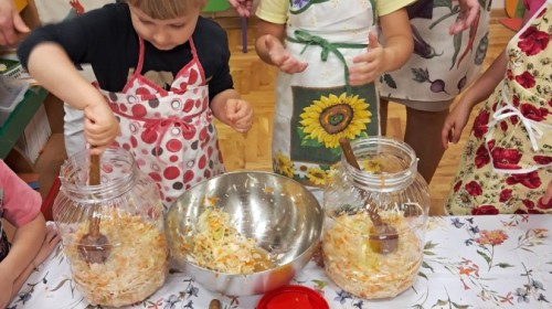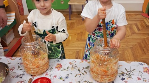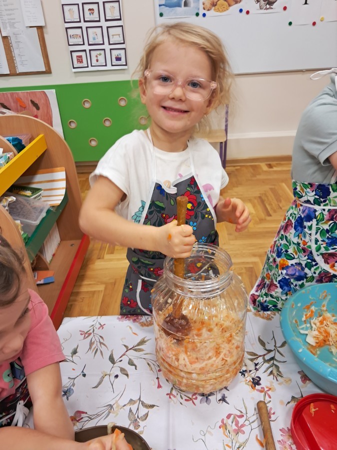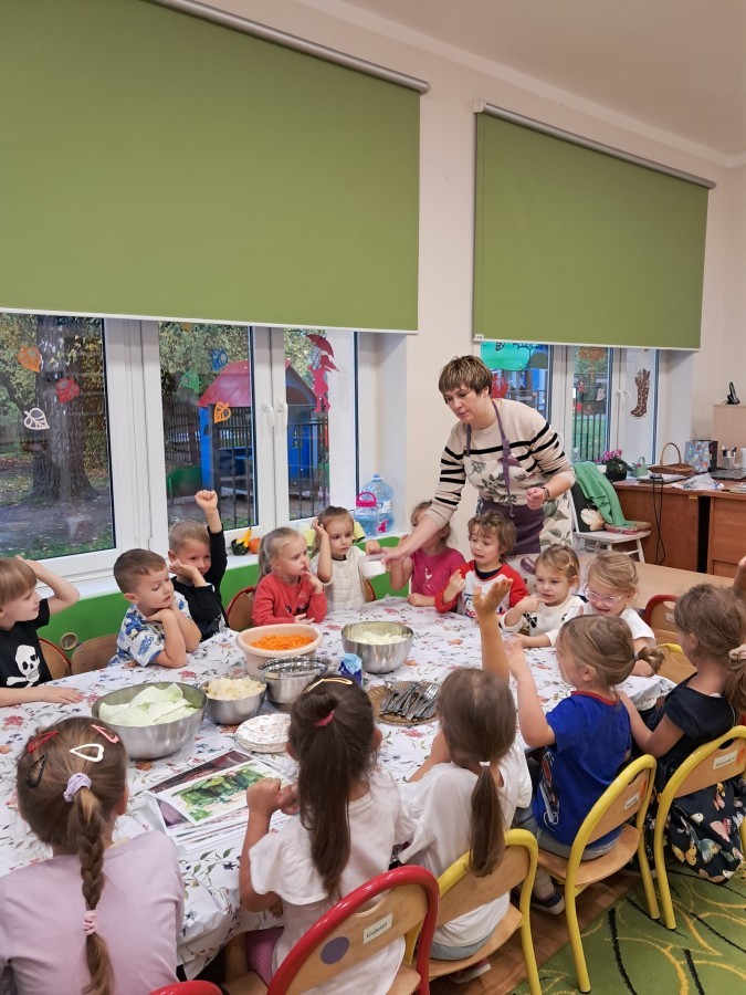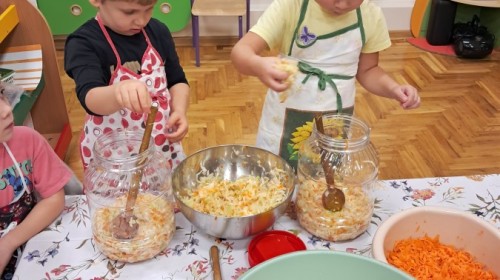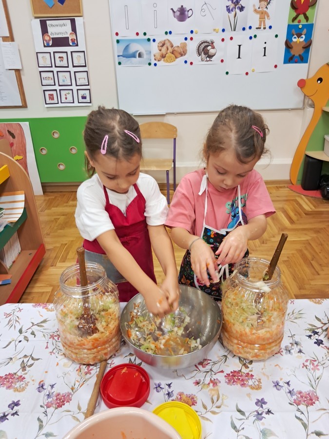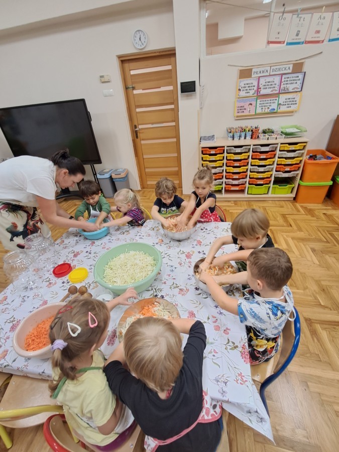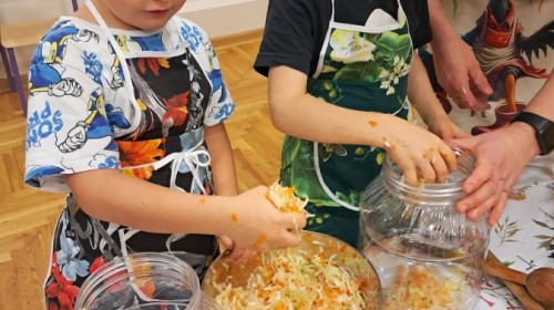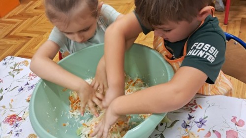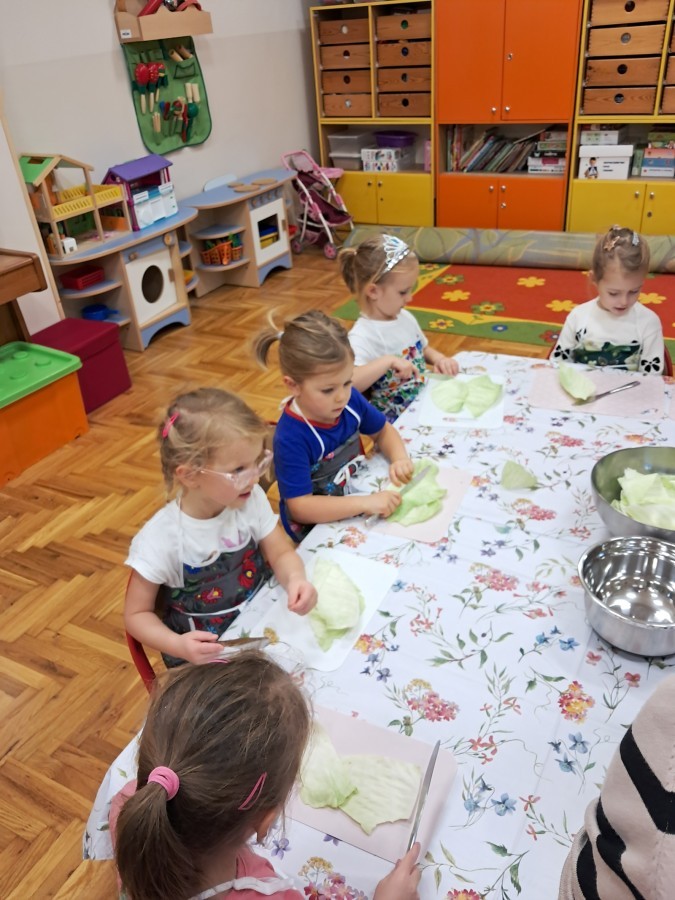 Liski zrealizowały pierwsze zadanie z Ogólnopolskiego Projektu ,,Eko przedszkolaki" pt: ,,Kiszonki-co to takiego?". Dowiedziały się co to są kiszonki, jak smakują, po co kisimy warzywa i pod czujnym okiem Pani Kasi i Iwonki zakisiły kapustę. Dodatkowo zwiedziły kuchnię, gdzie przygotowuje się pyszne przedszkolne posiłki.