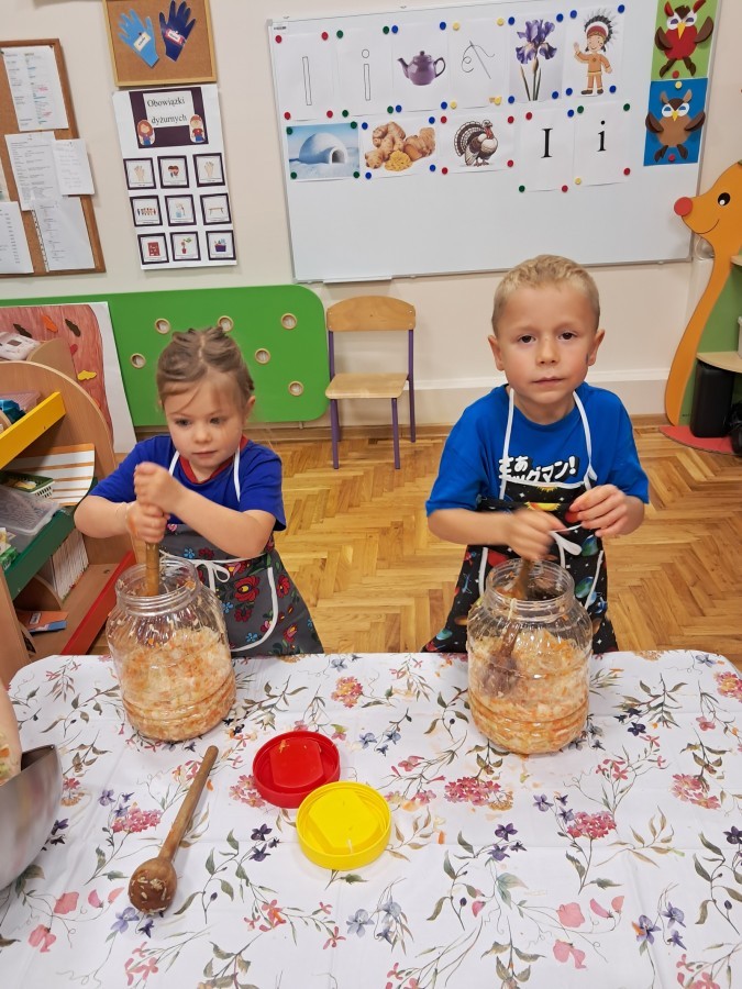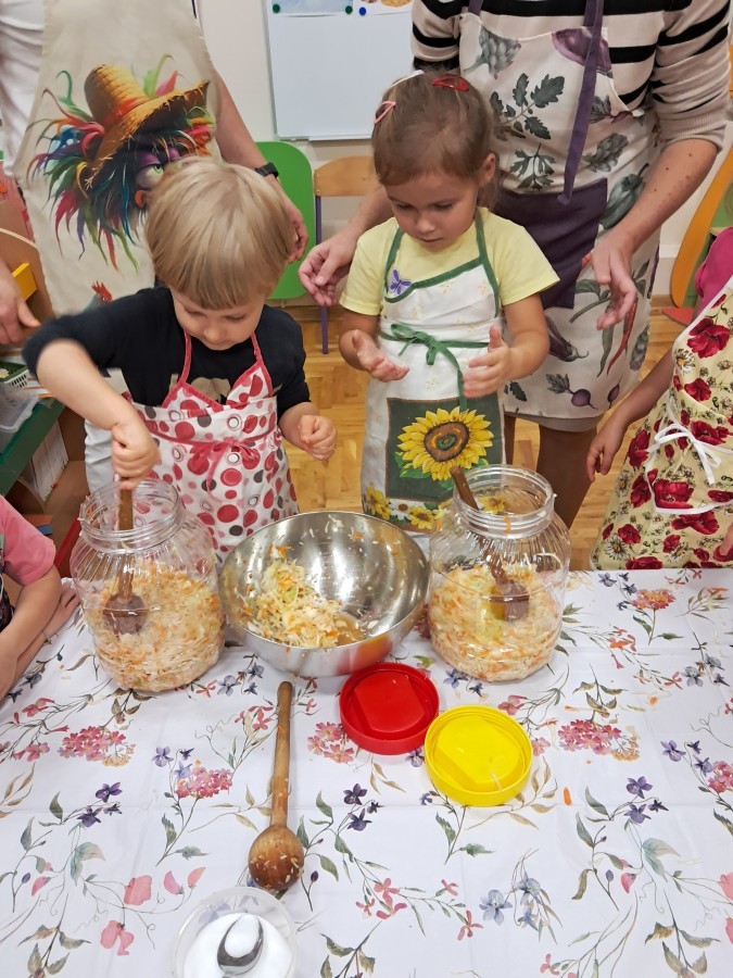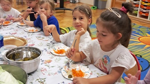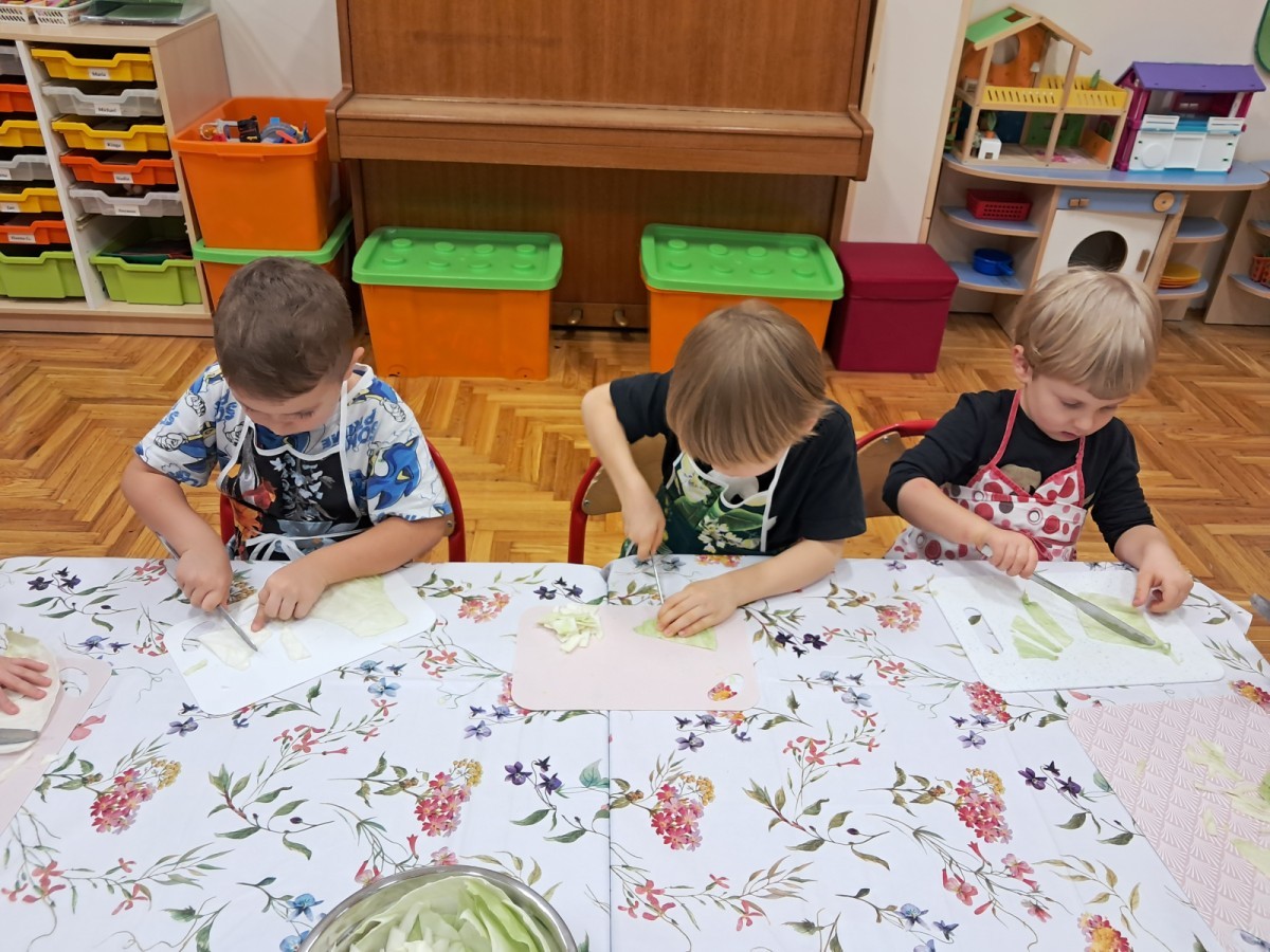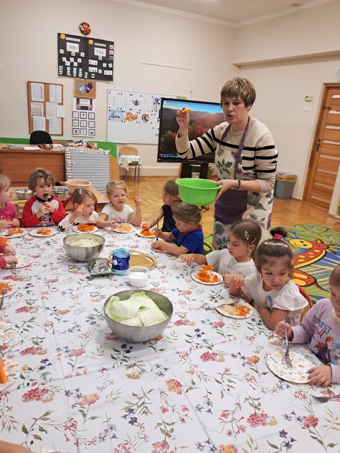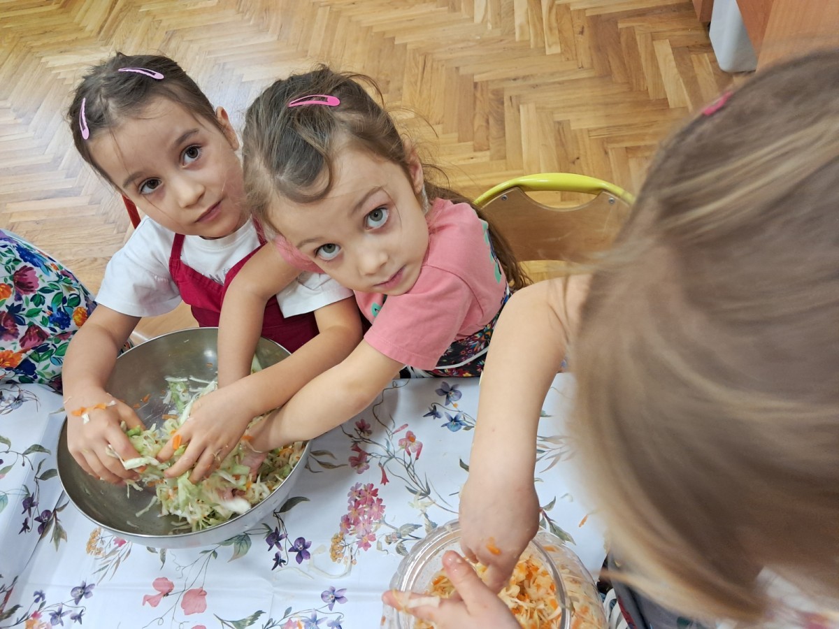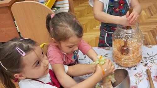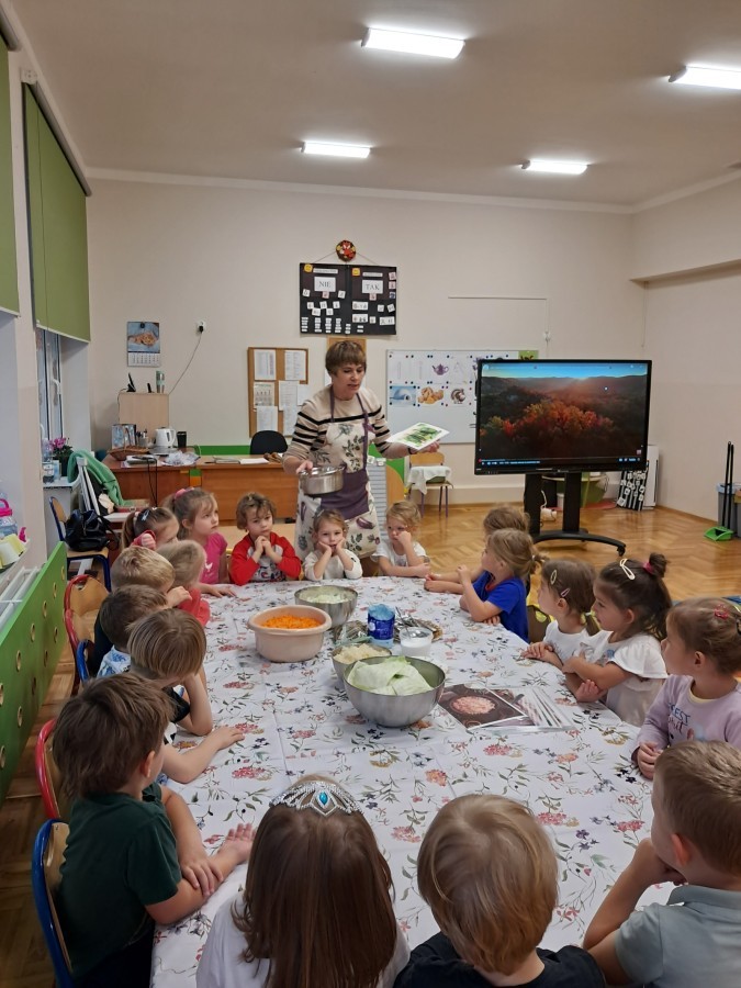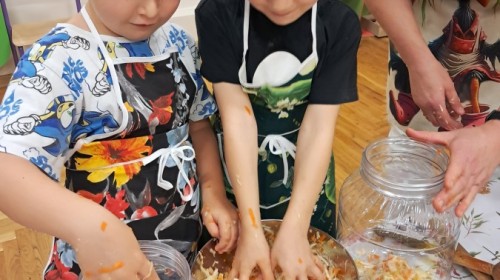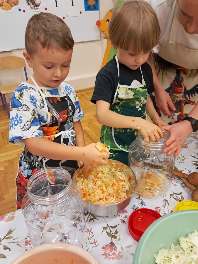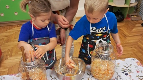 Liski zrealizowały pierwsze zadanie z Ogólnopolskiego Projektu ,,Eko przedszkolaki" pt: ,,Kiszonki-co to takiego?". Dowiedziały się co to są kiszonki, jak smakują, po co kisimy warzywa i pod czujnym okiem Pani Kasi i Iwonki zakisiły kapustę. Dodatkowo zwiedziły kuchnię, gdzie przygotowuje się pyszne przedszkolne posiłki.