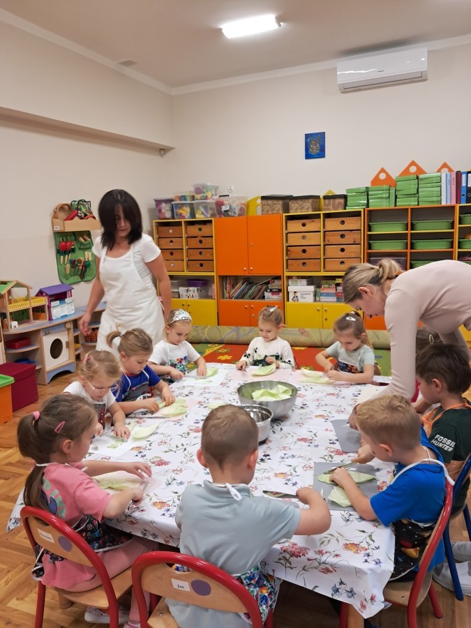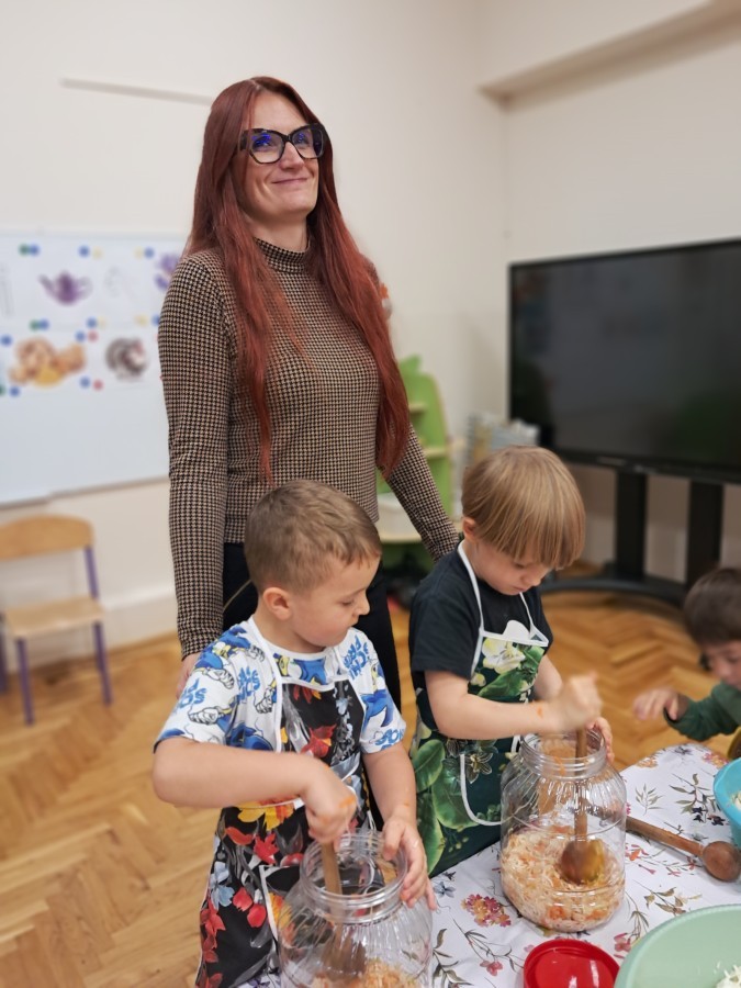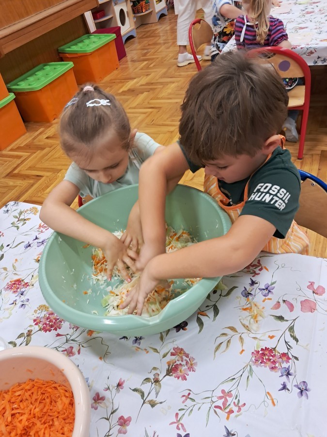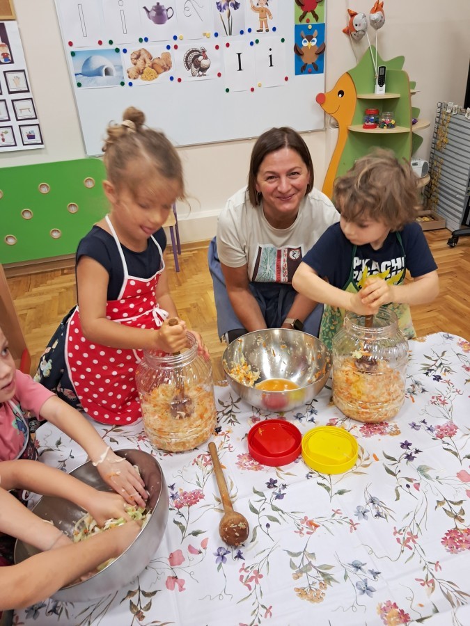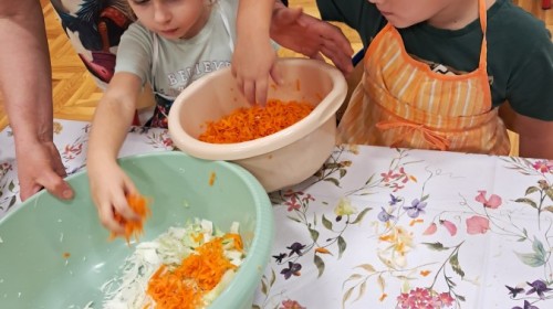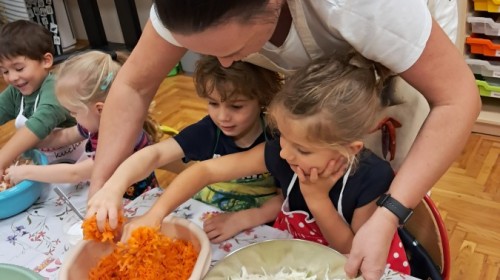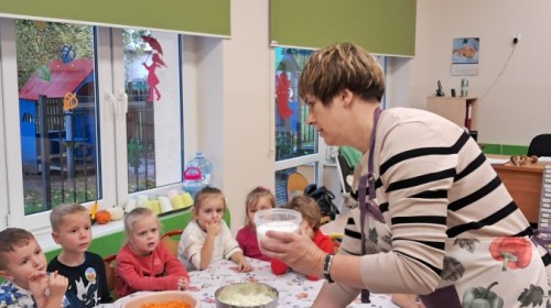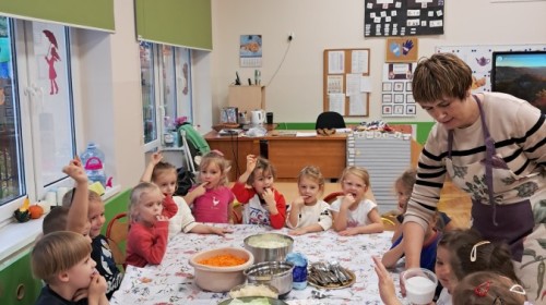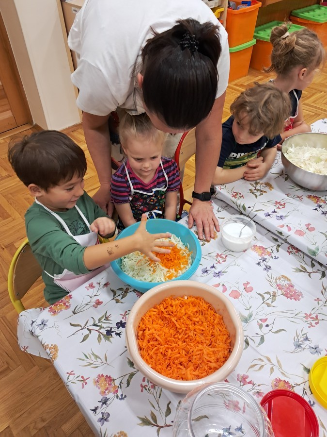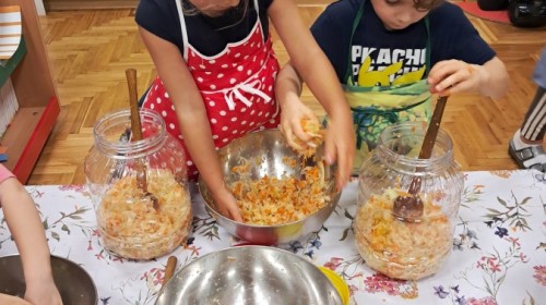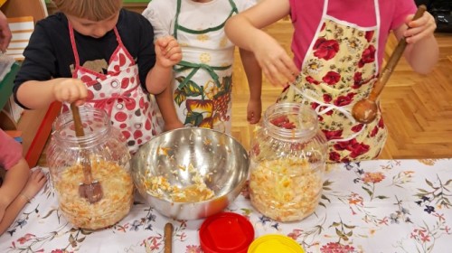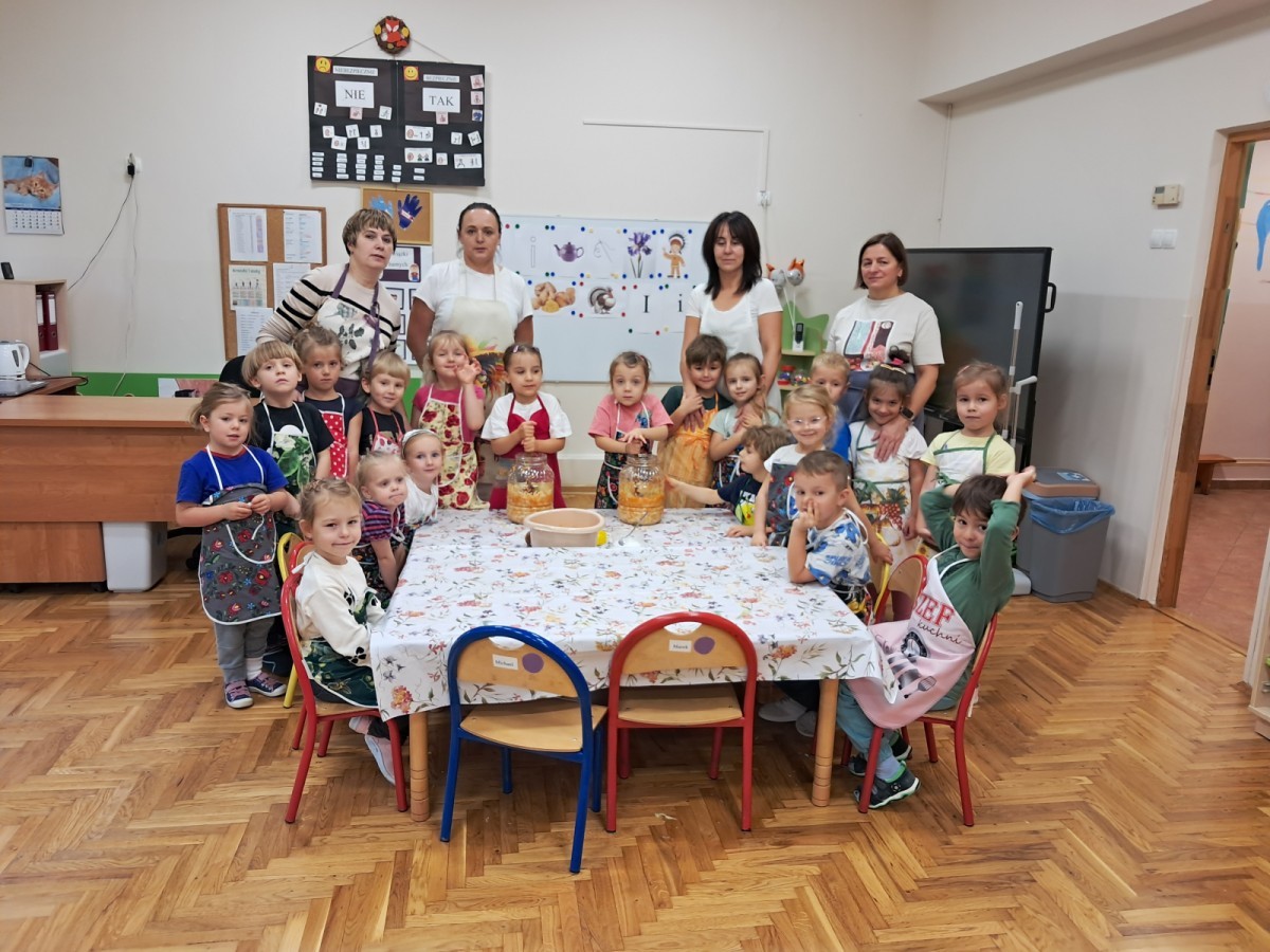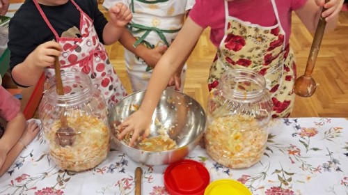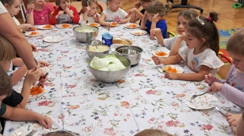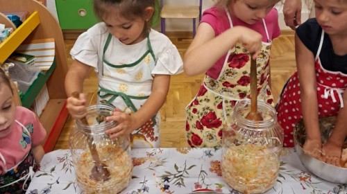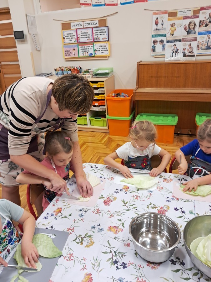 Liski zrealizowały pierwsze zadanie z Ogólnopolskiego Projektu ,,Eko przedszkolaki" pt: ,,Kiszonki-co to takiego?". Dowiedziały się co to są kiszonki, jak smakują, po co kisimy warzywa i pod czujnym okiem Pani Kasi i Iwonki zakisiły kapustę. Dodatkowo zwiedziły kuchnię, gdzie przygotowuje się pyszne przedszkolne posiłki.