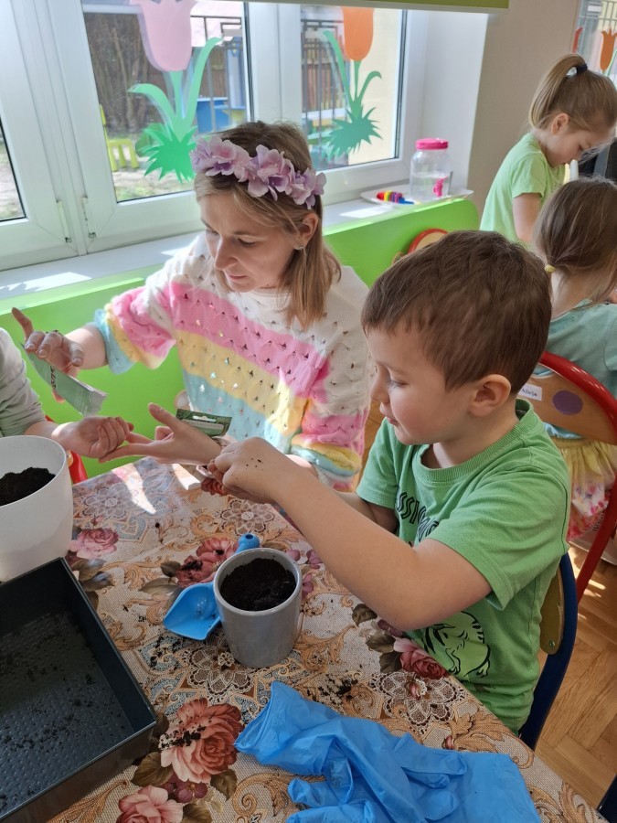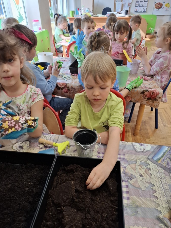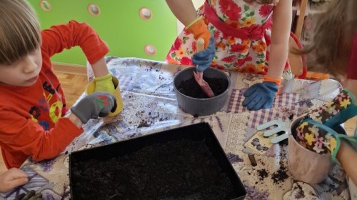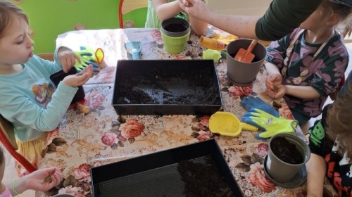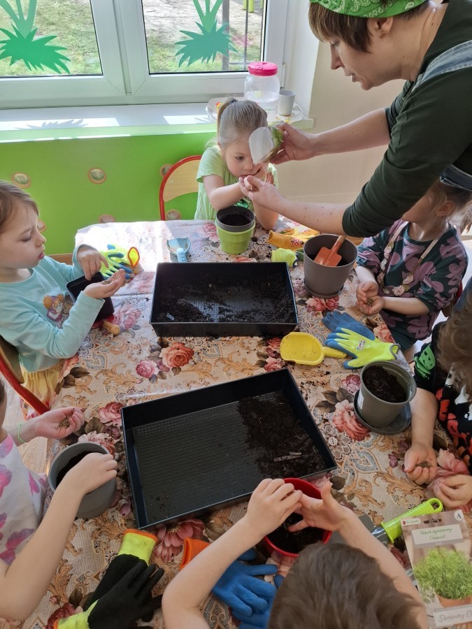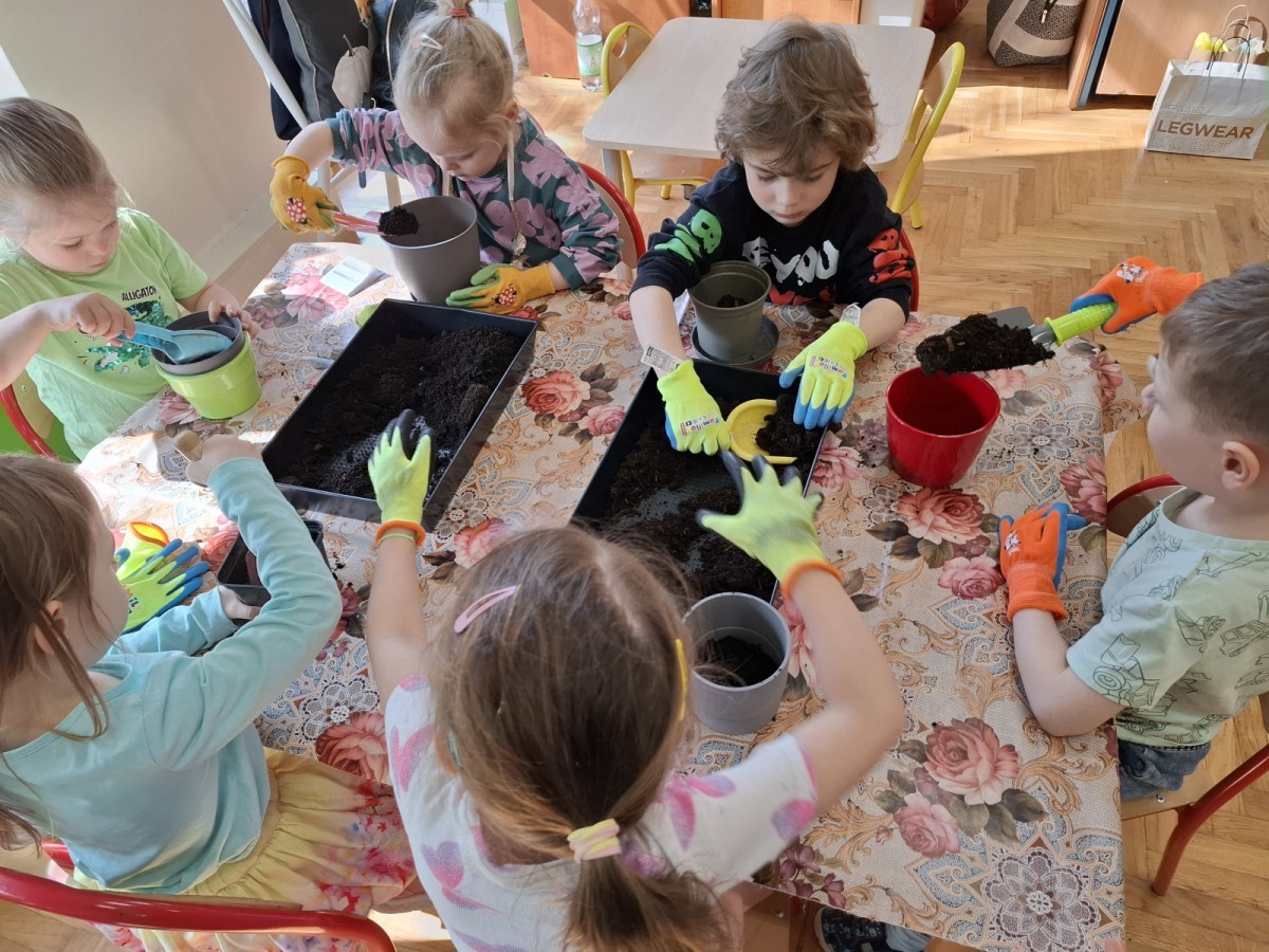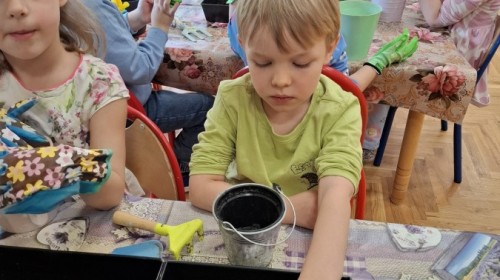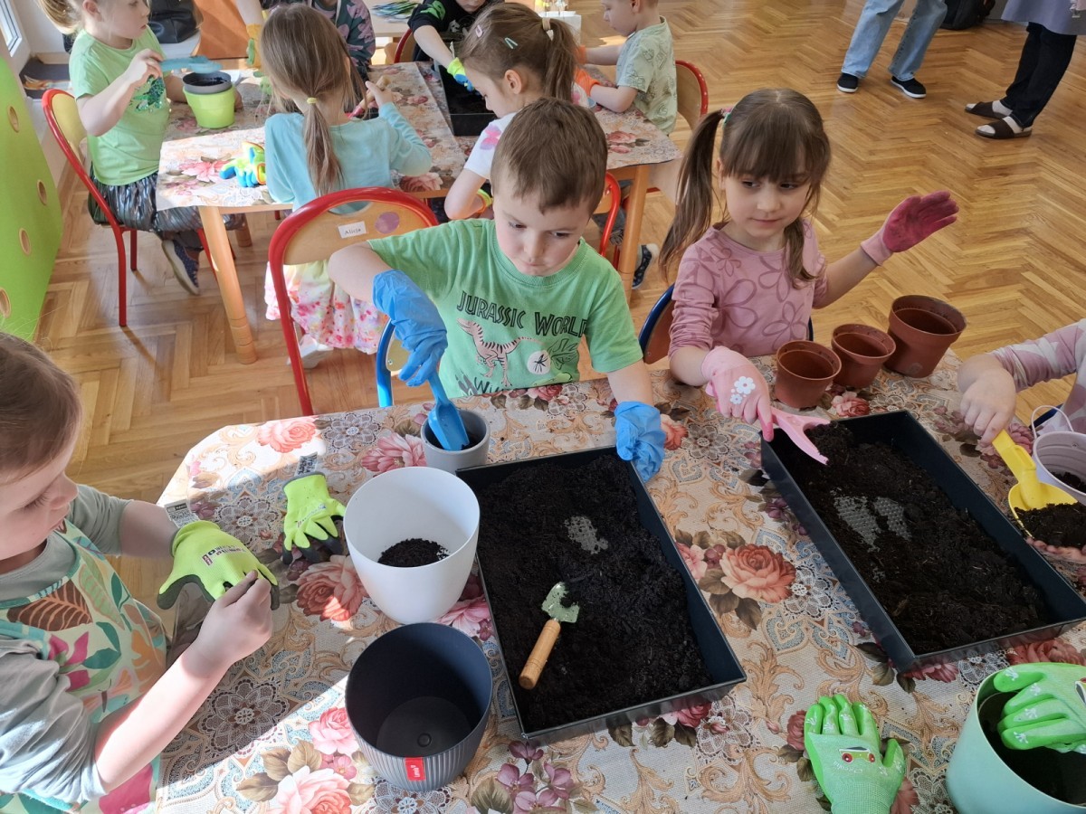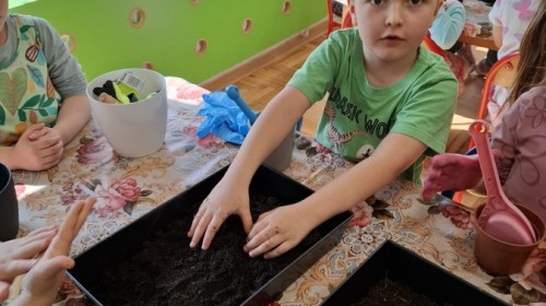 Na zakończenie zajęć każdy mógł poczuć się jak prawdziwy ogrodnik. Liski samodzielnie wysiały w doniczkach szczypiorek, bazylię, miętę oraz koperek. Teraz z niecierpliwością będziemy czekać na pierwsze kiełki.