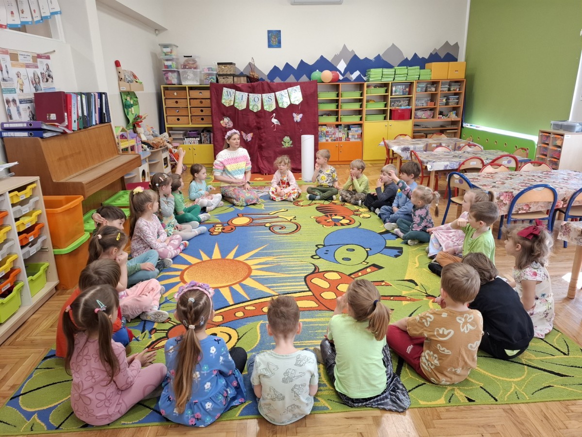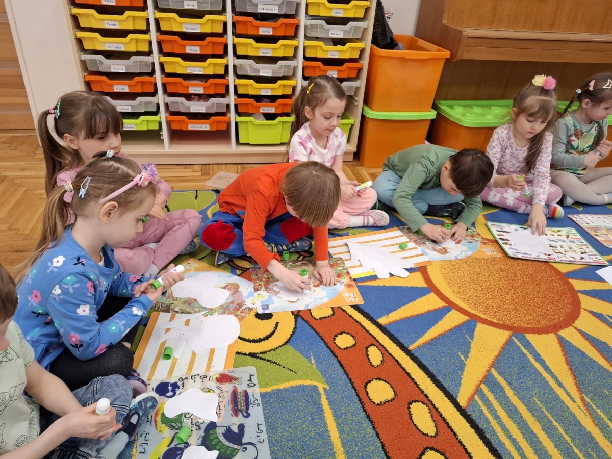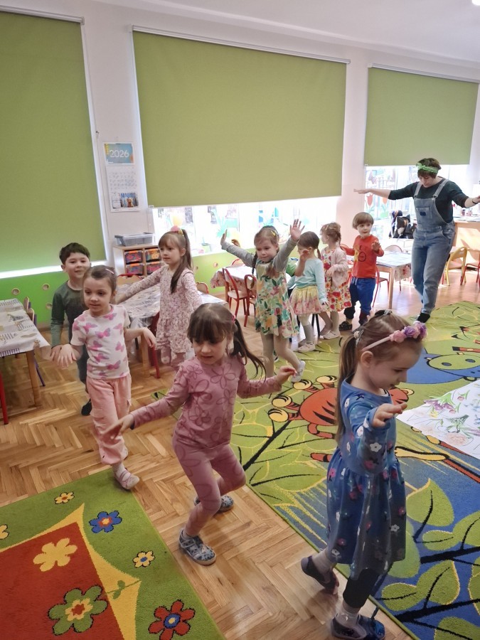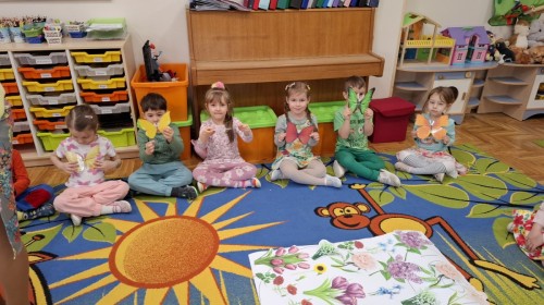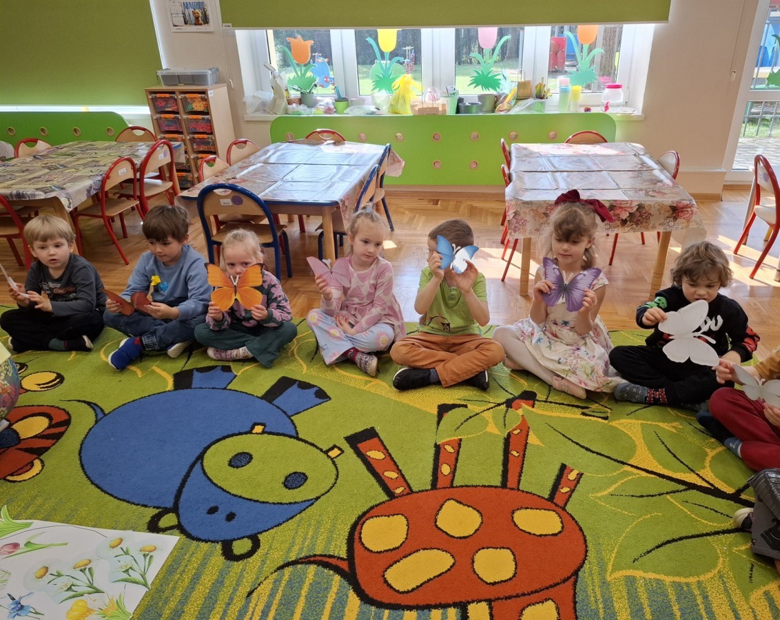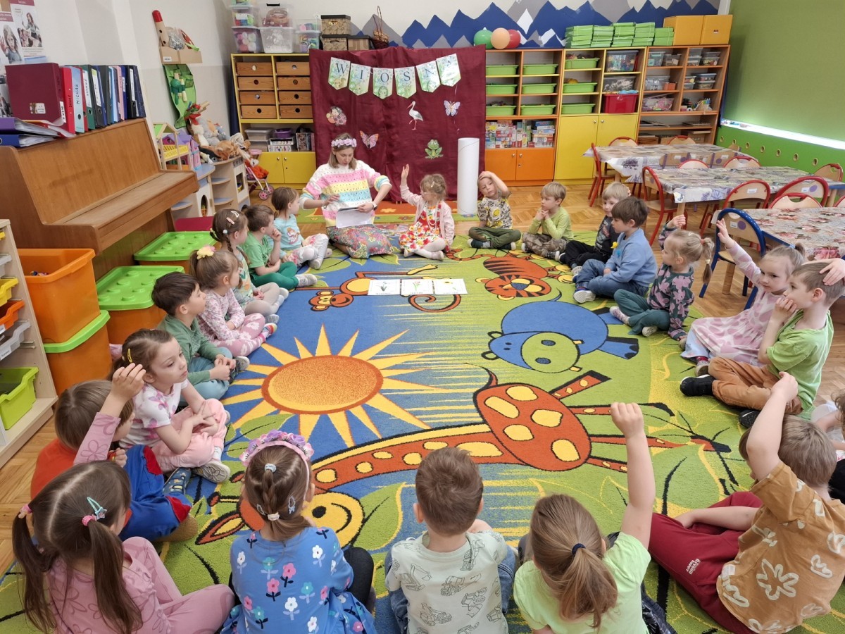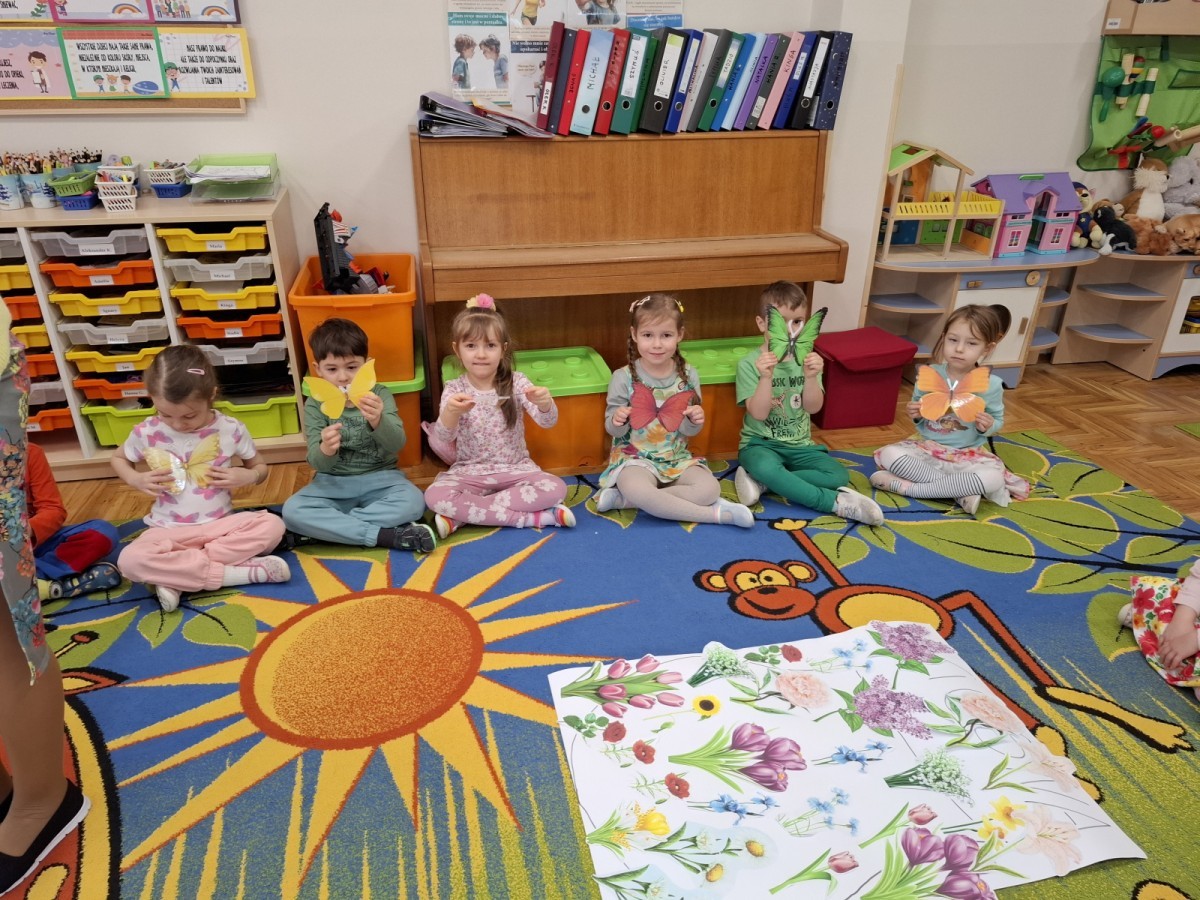 Nie zabrakło również radosnej zabawy! Dzieci bawiły się przy kolorowych motylach, rozwijając swoją wyobraźnię i koordynację ruchową. Wcieliły się w wiosenne ptaszki, które porządkowały swoje gniazda, skakały na skakance i piekły ciasto bananowe- było dużo śmiechu i pozytywnej energii.