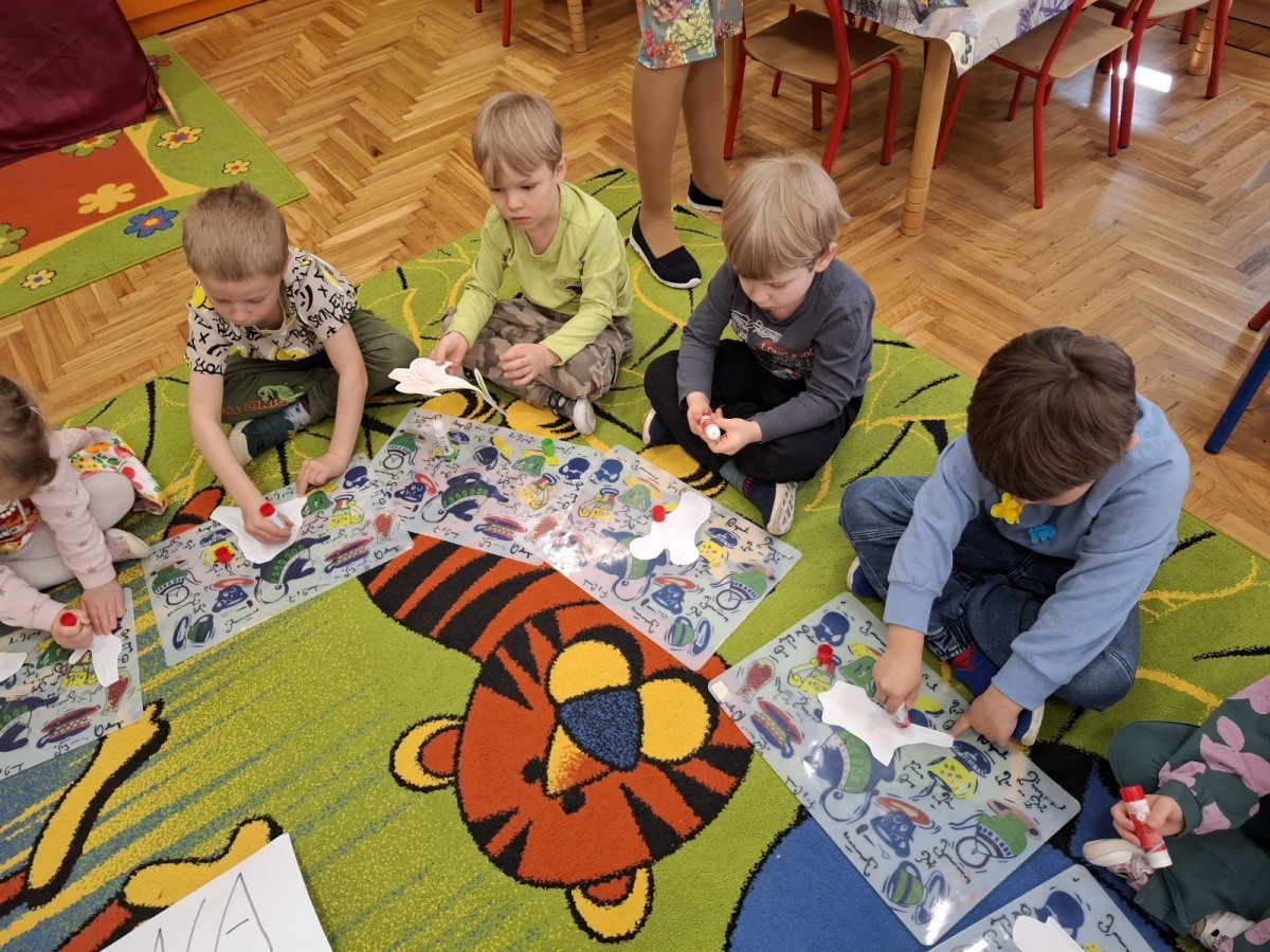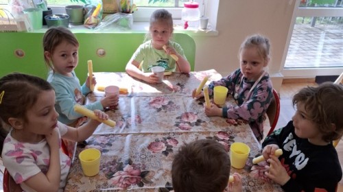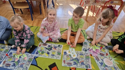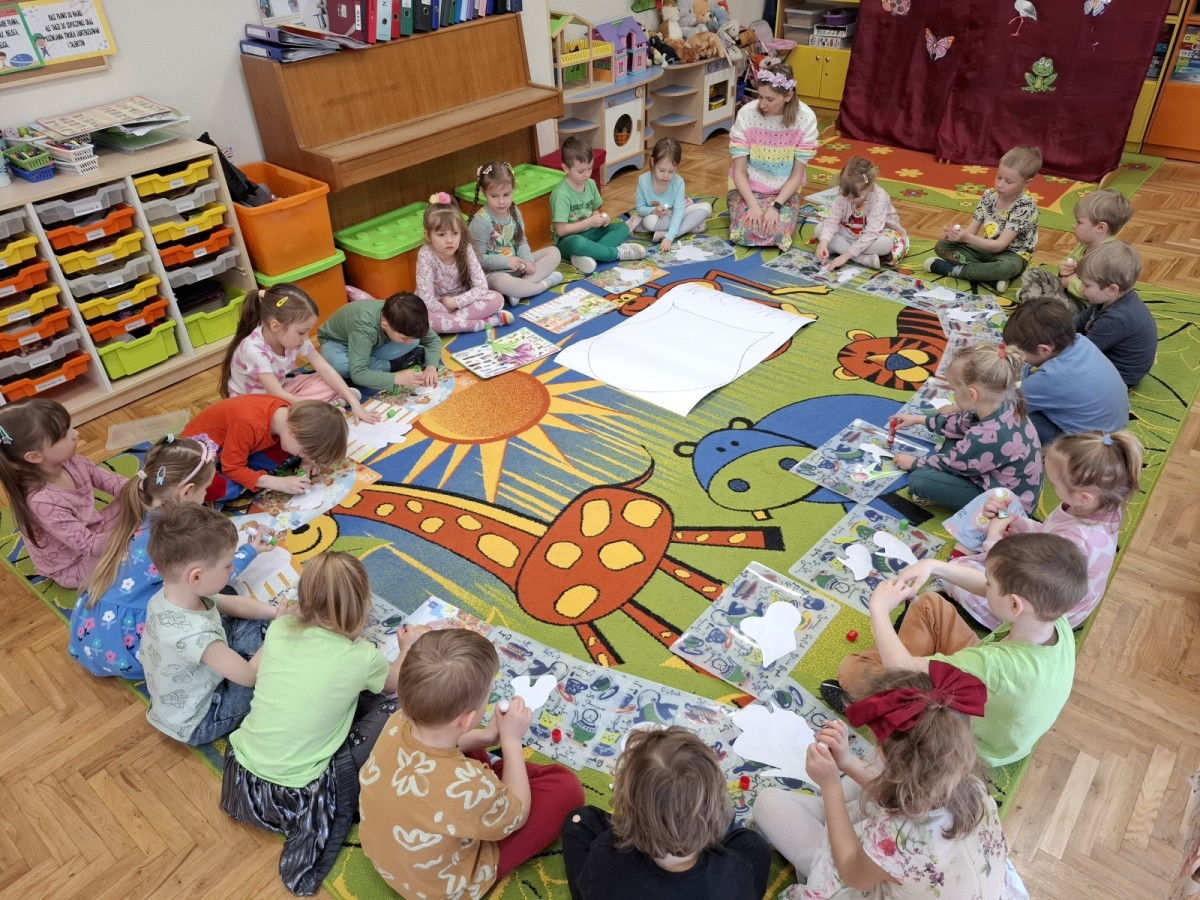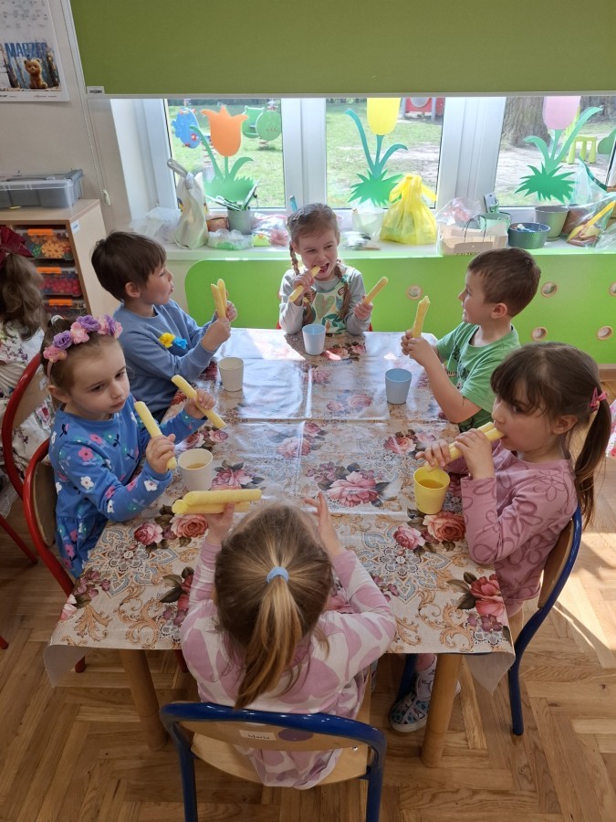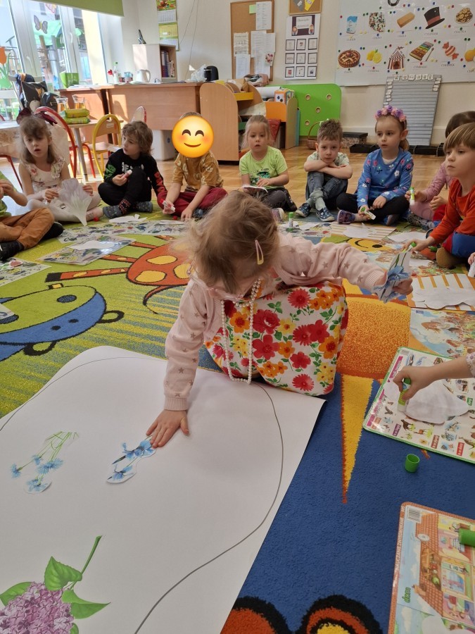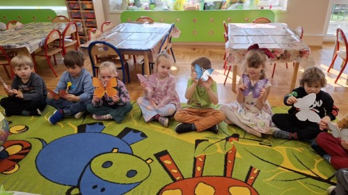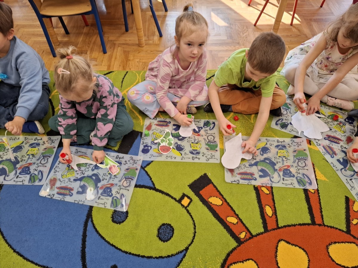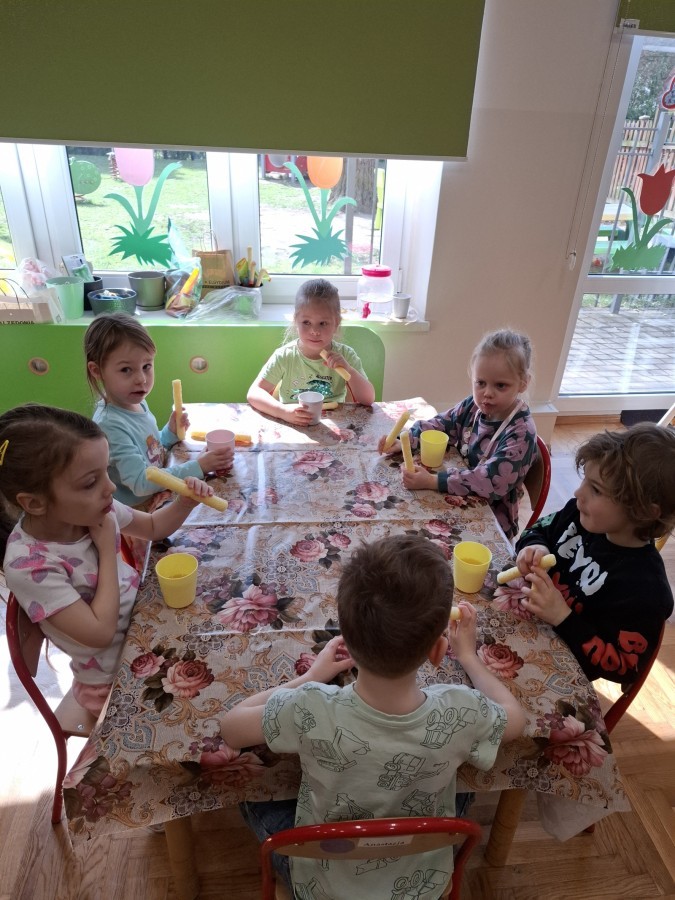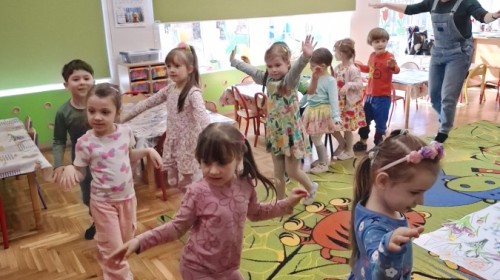Nie zabrakło również radosnej zabawy! Dzieci bawiły się przy kolorowych motylach, rozwijając swoją wyobraźnię i koordynację ruchową. Wcieliły się w wiosenne ptaszki, które porządkowały swoje gniazda, skakały na skakance i piekły ciasto bananowe- było dużo śmiechu i pozytywnej energii.