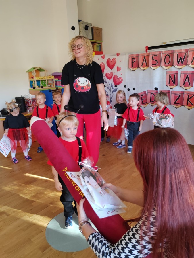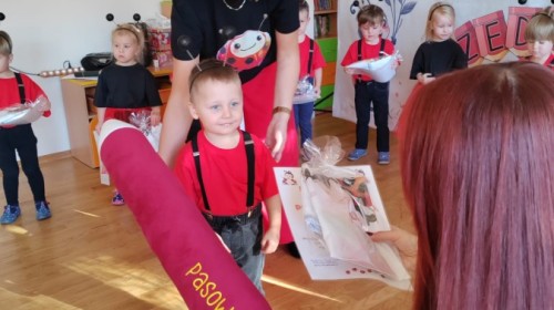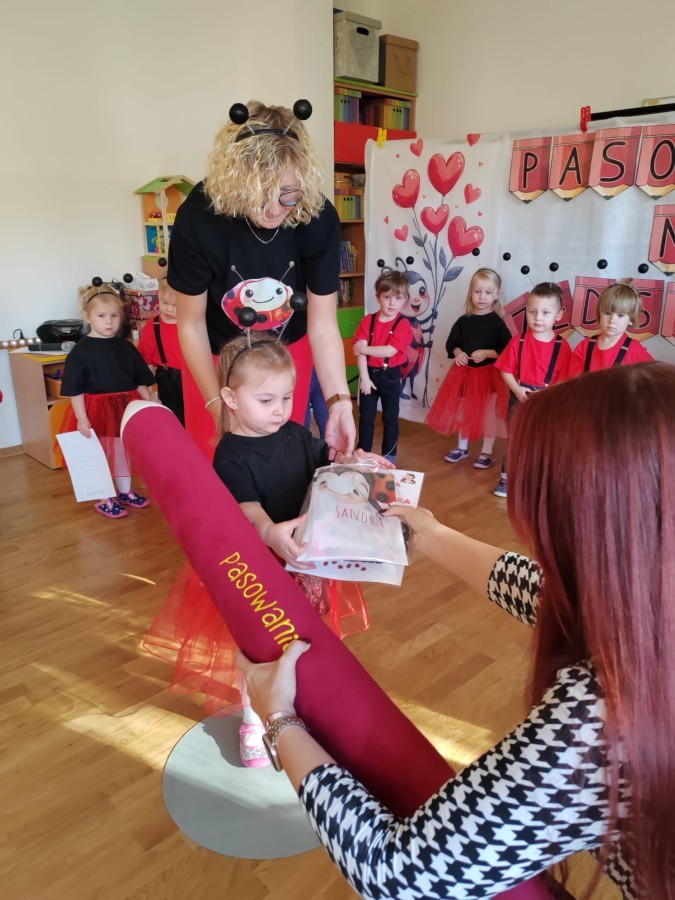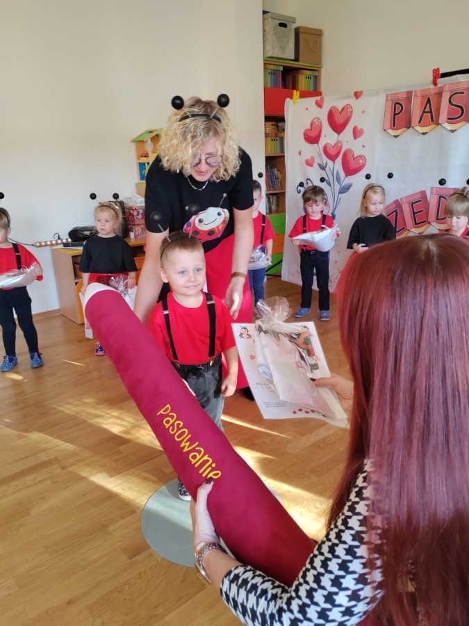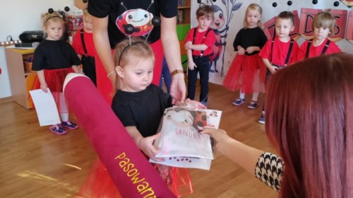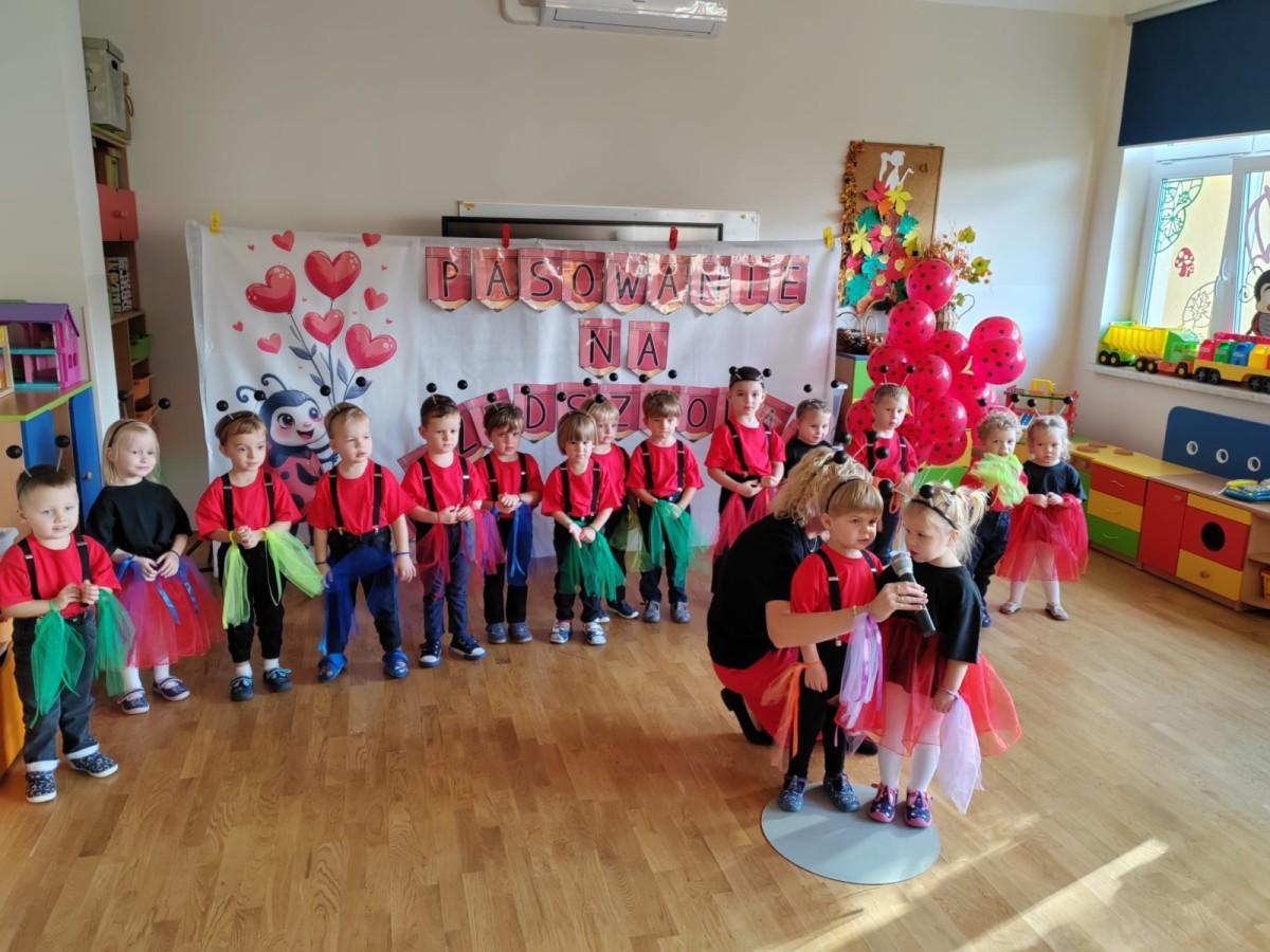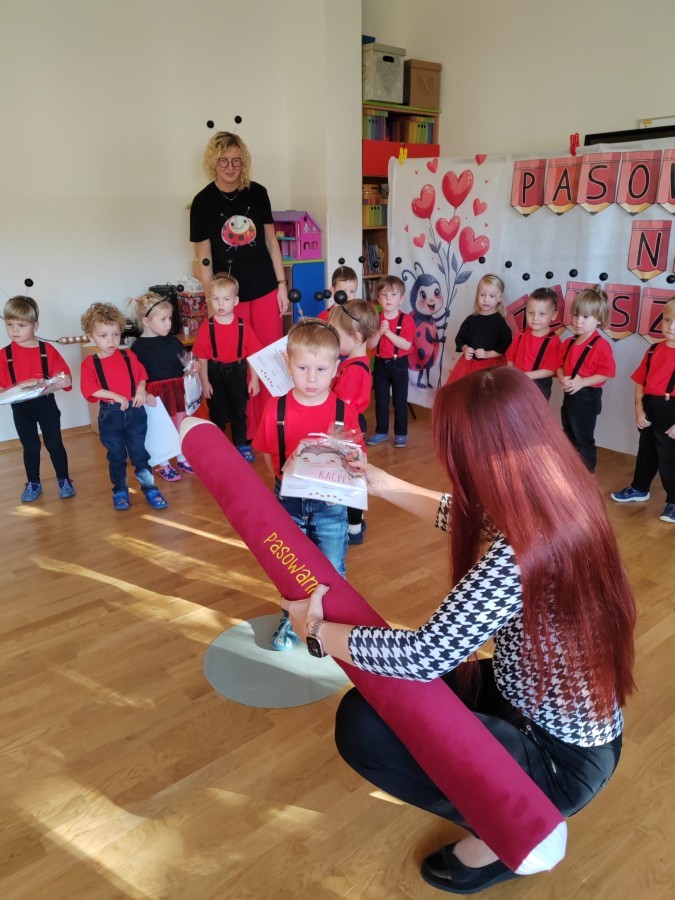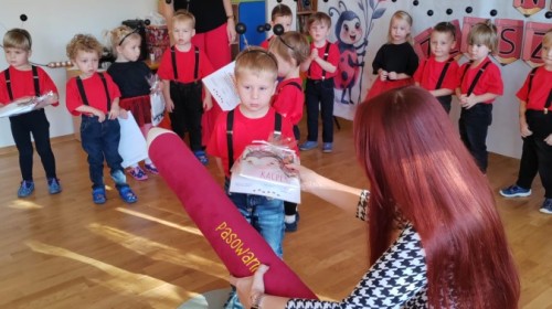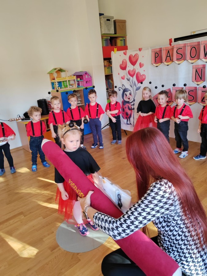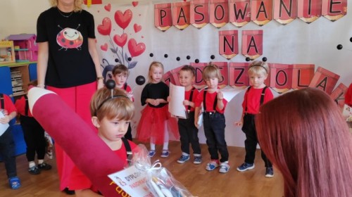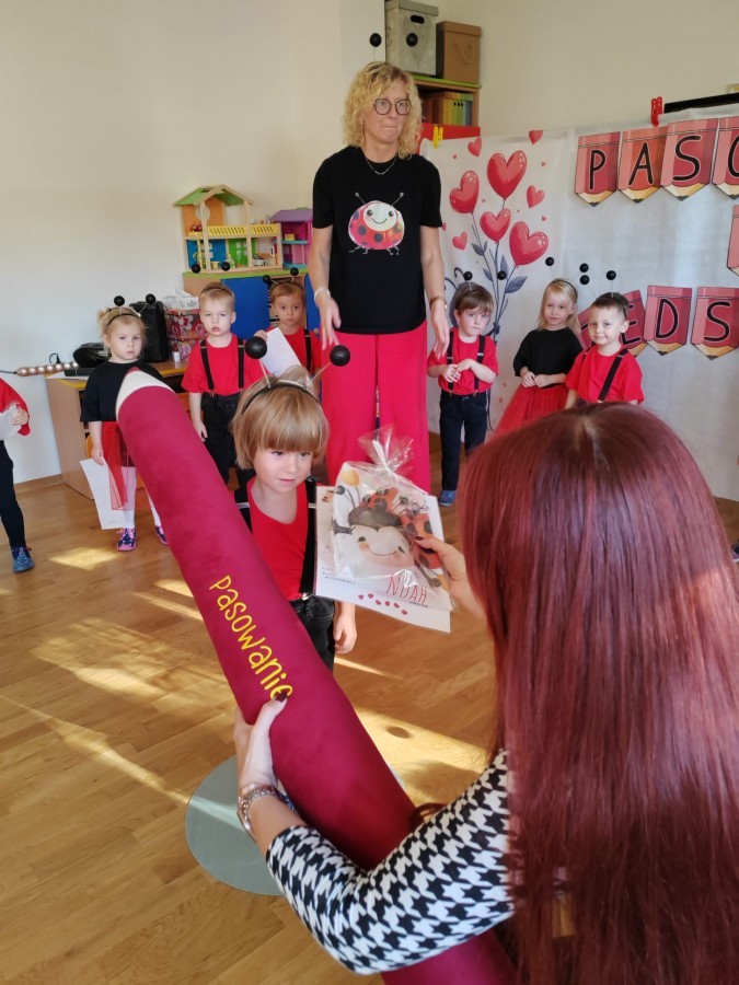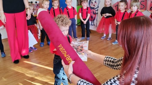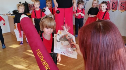 Na zakończenie uroczystości pani Dyrektor dokonała pasowania, a każde dziecko zostało oficjalnie przyjęte do grona dzielnych przedszkolaków.