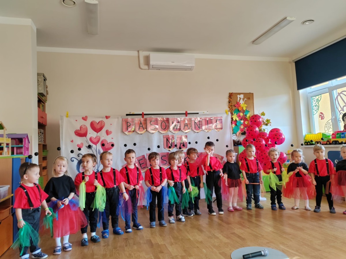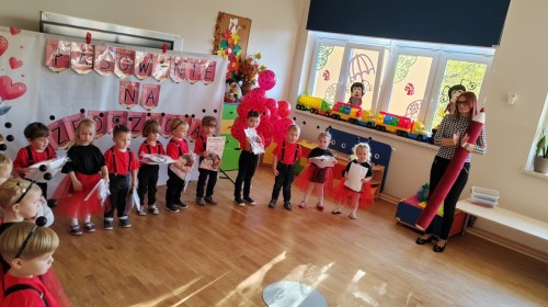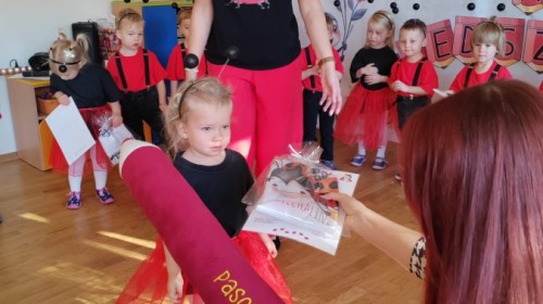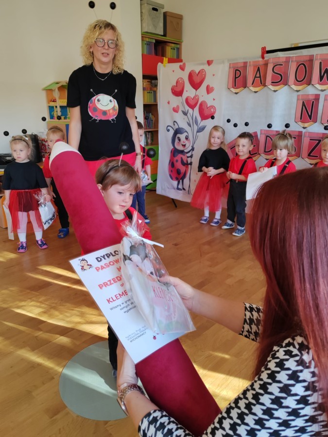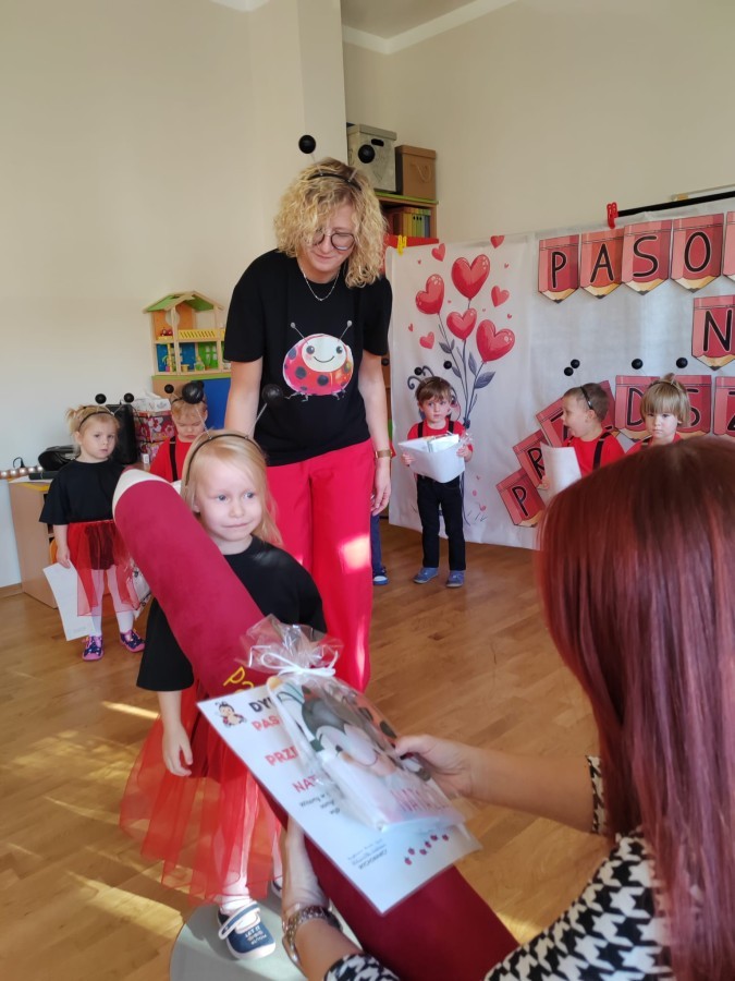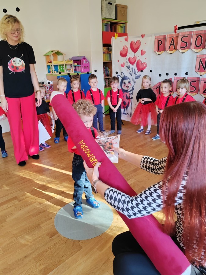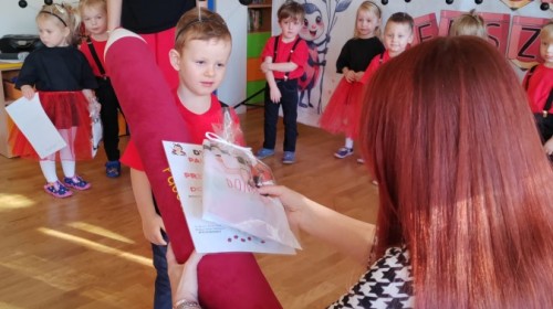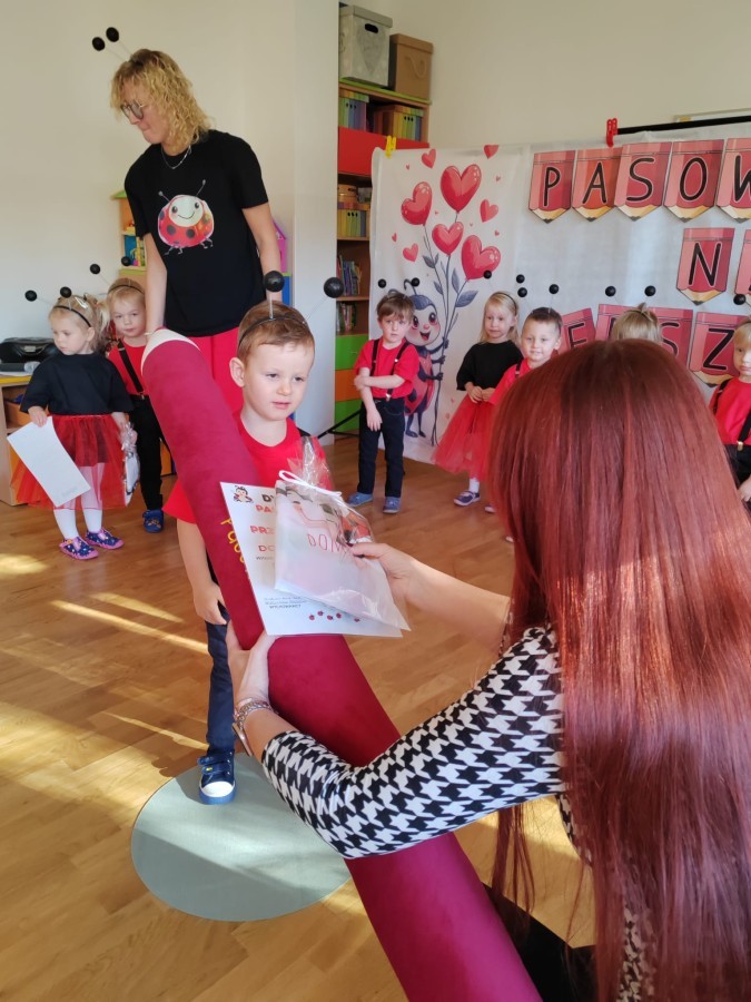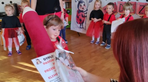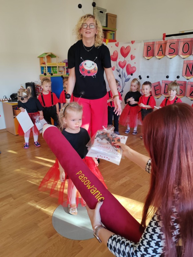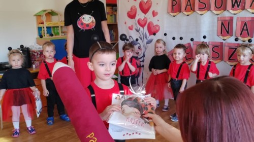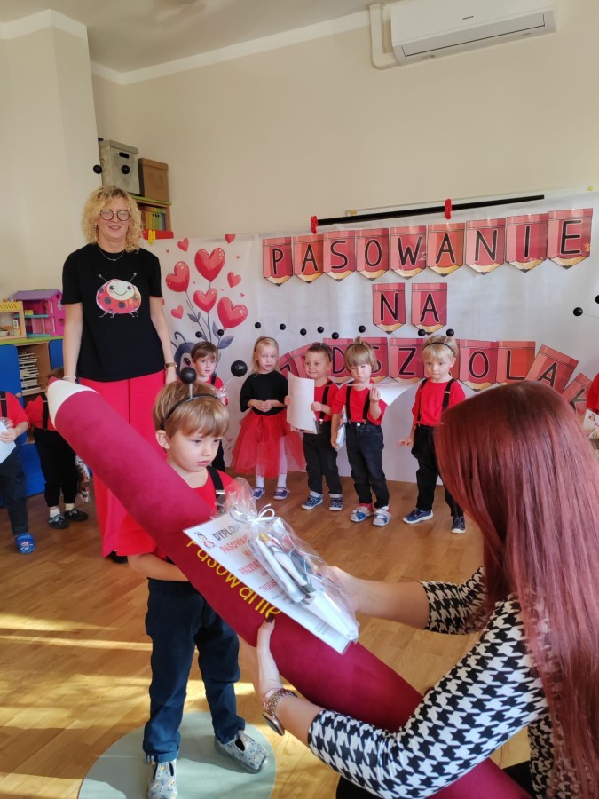 Na zakończenie uroczystości pani Dyrektor dokonała pasowania, a każde dziecko zostało oficjalnie przyjęte do grona dzielnych przedszkolaków.