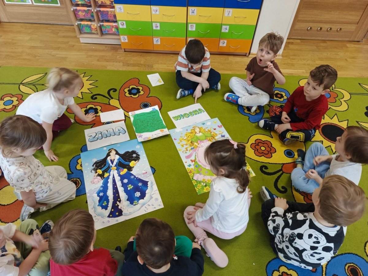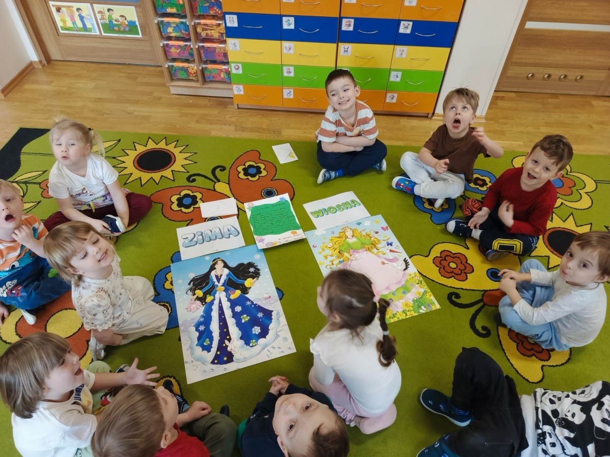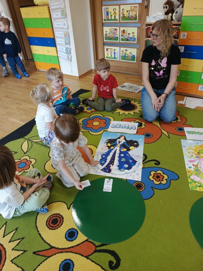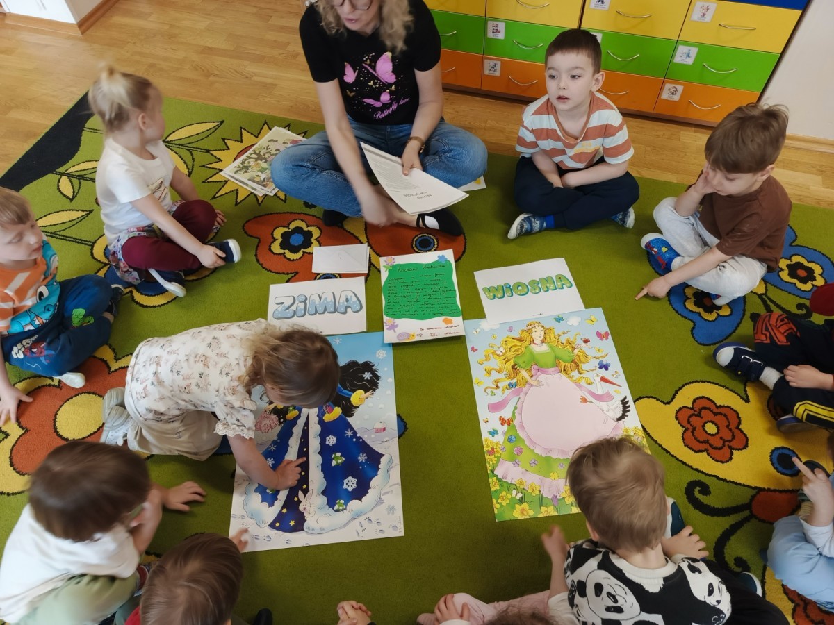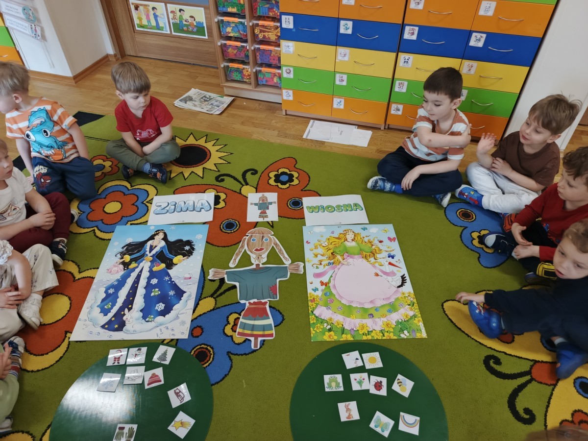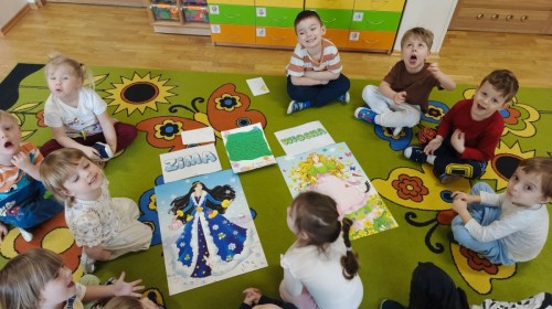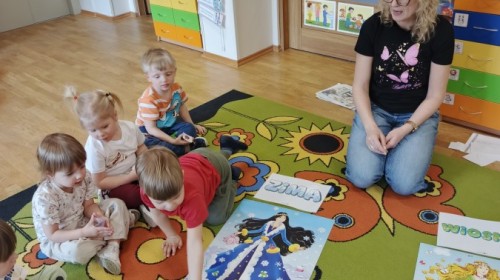 Następnie przedszkolaki sprawdzały swoją wiedzę, rozwiązując zagadki dotyczące charakterystycznych cech zimy i wiosny.
