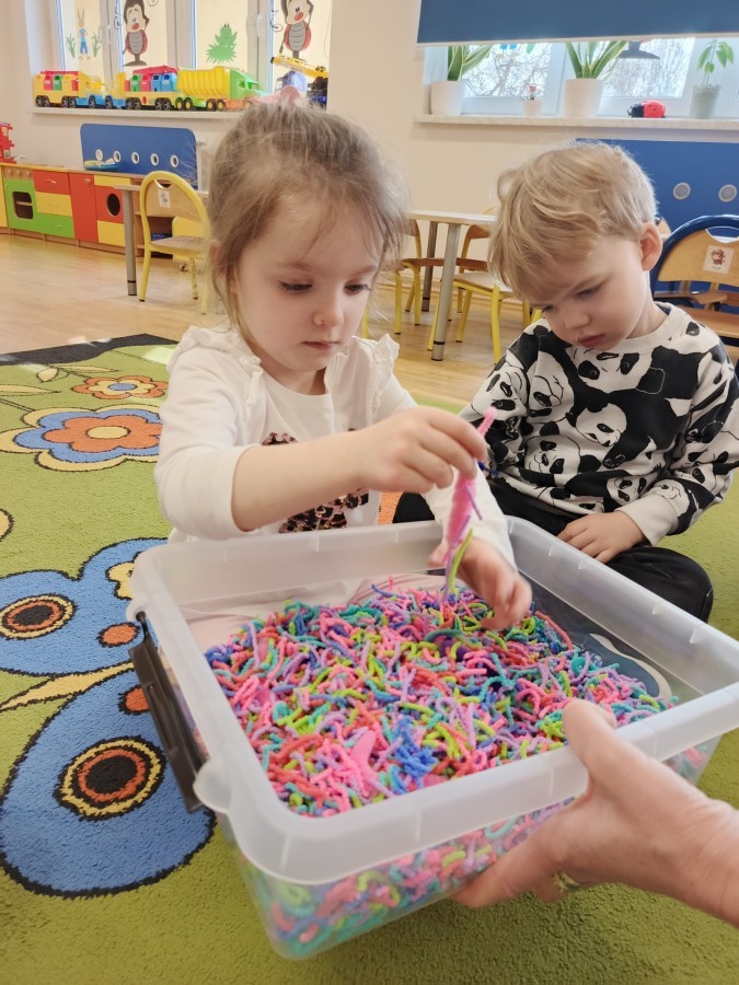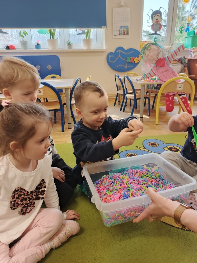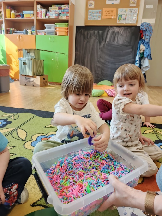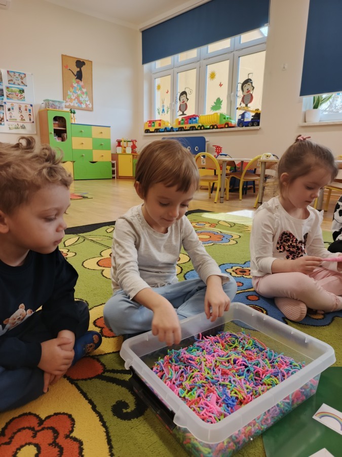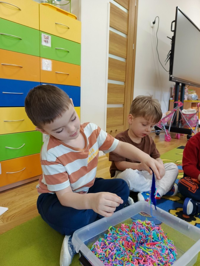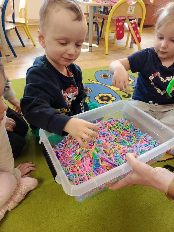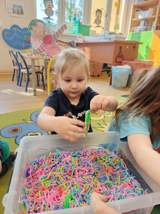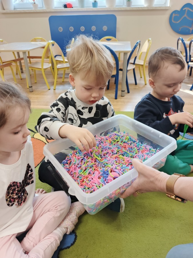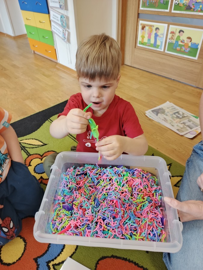 Kolejnym zadaniem było poszukiwanie kolorowych „robaczków”, które sprawiło dzieciom wiele radości i pozwoliło na świetną zabawę sensoryczną