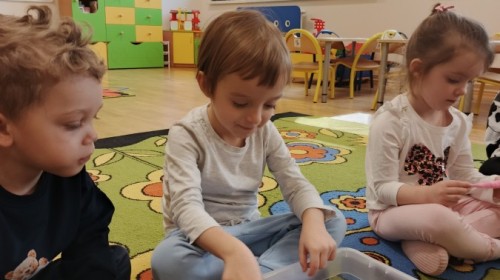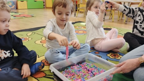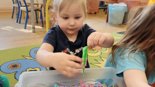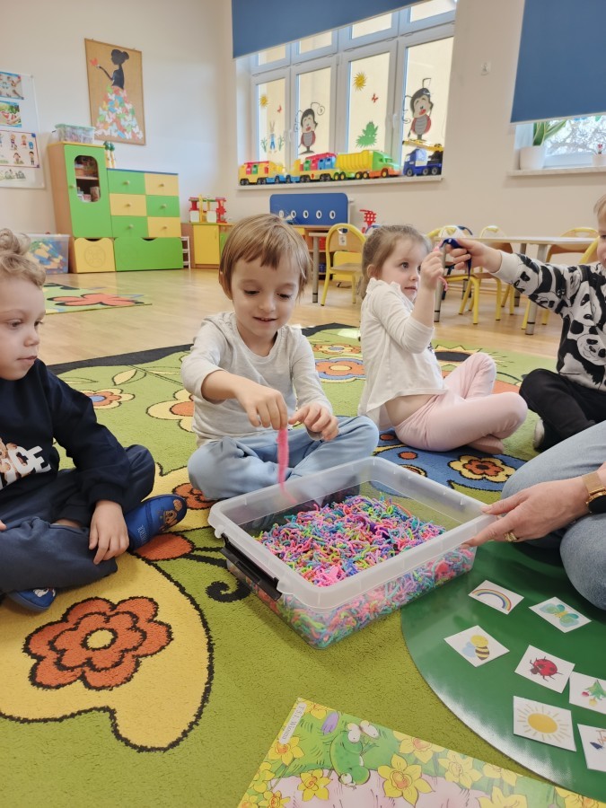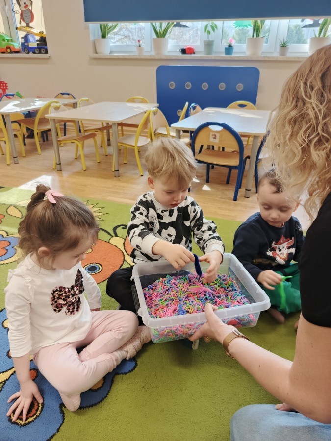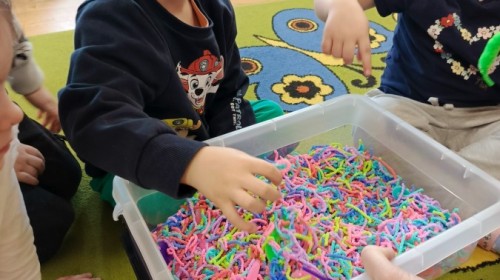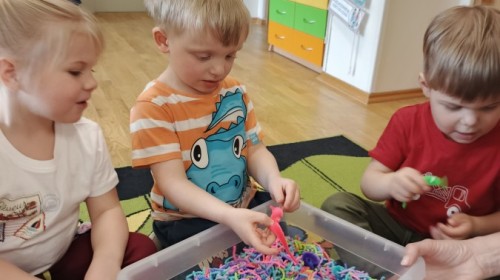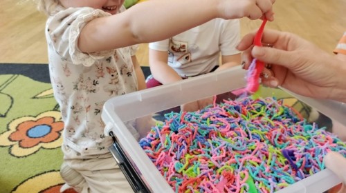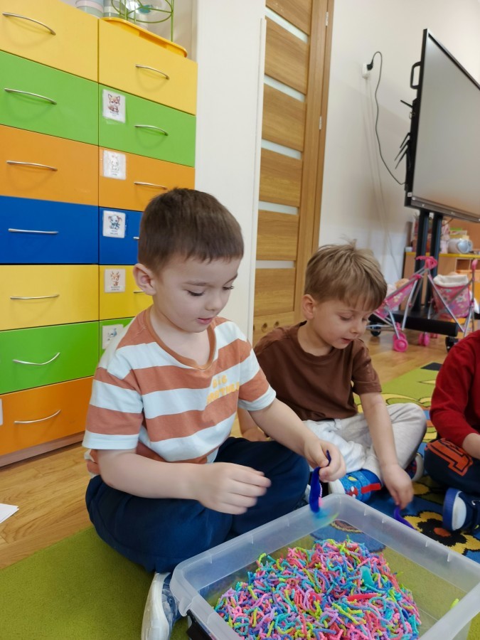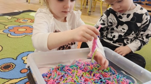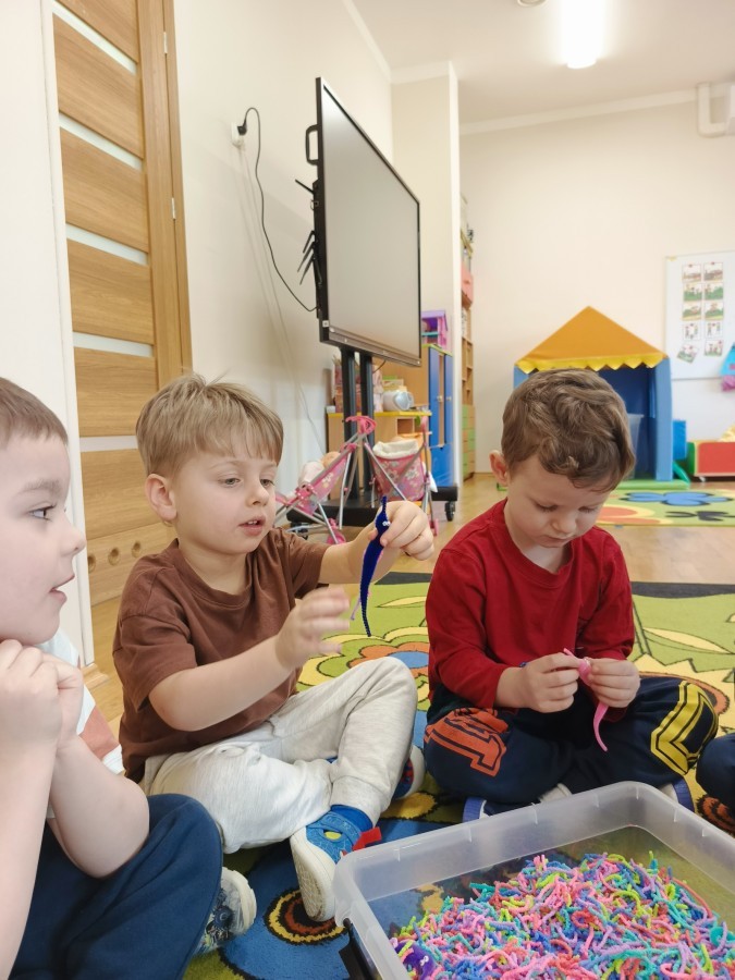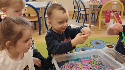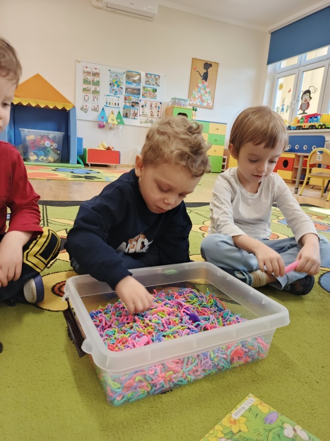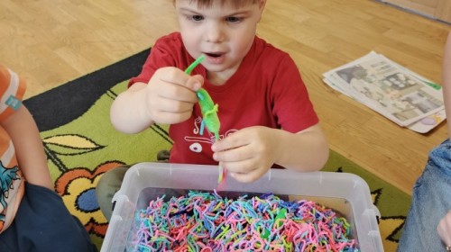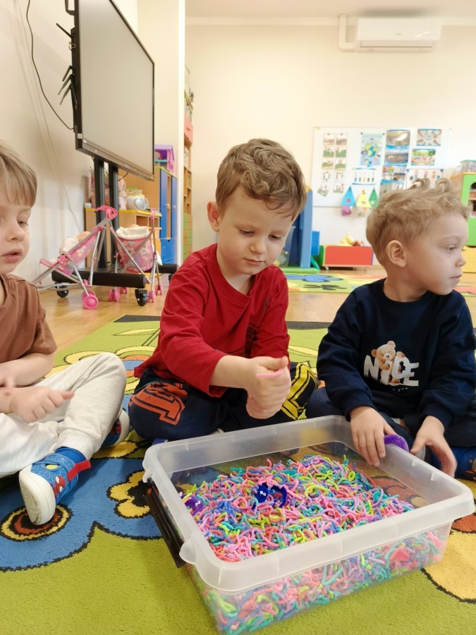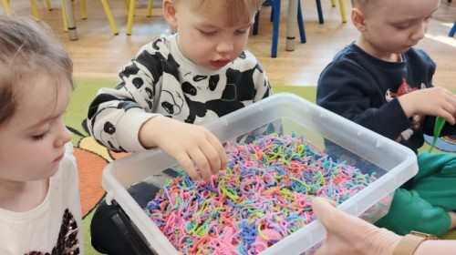 Kolejnym zadaniem było poszukiwanie kolorowych „robaczków”, które sprawiło dzieciom wiele radości i pozwoliło na świetną zabawę sensoryczną