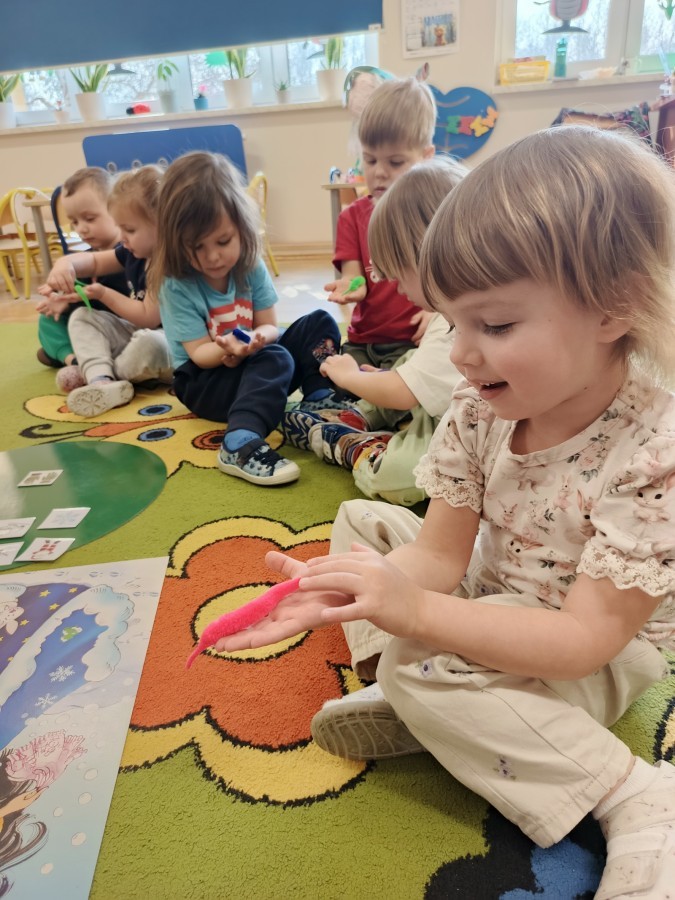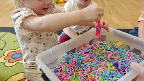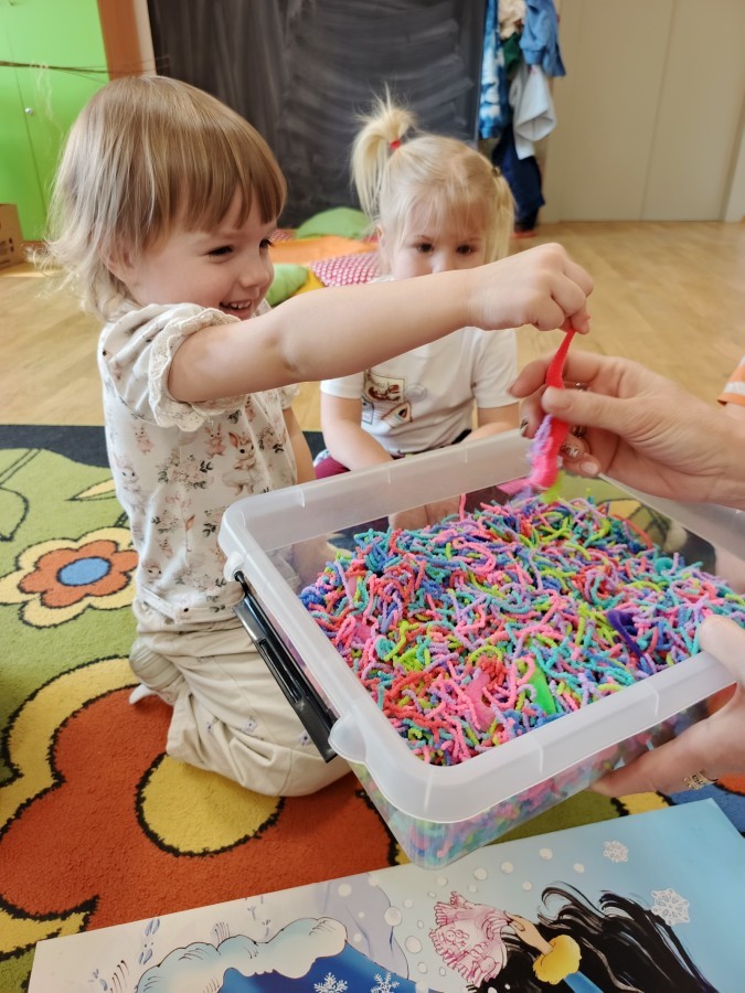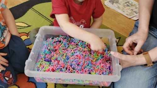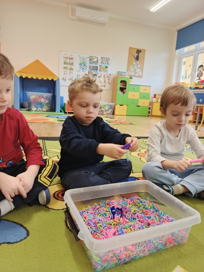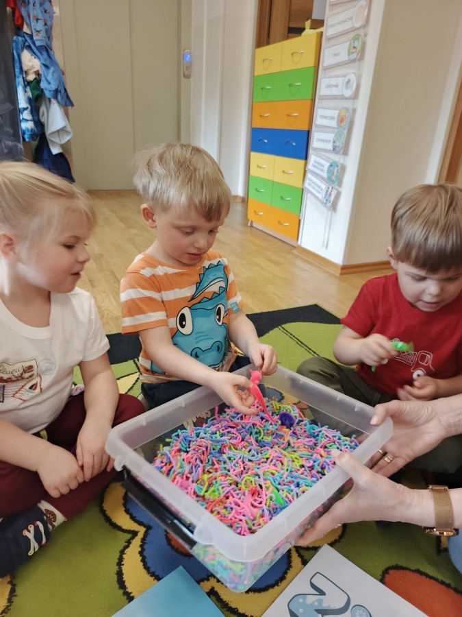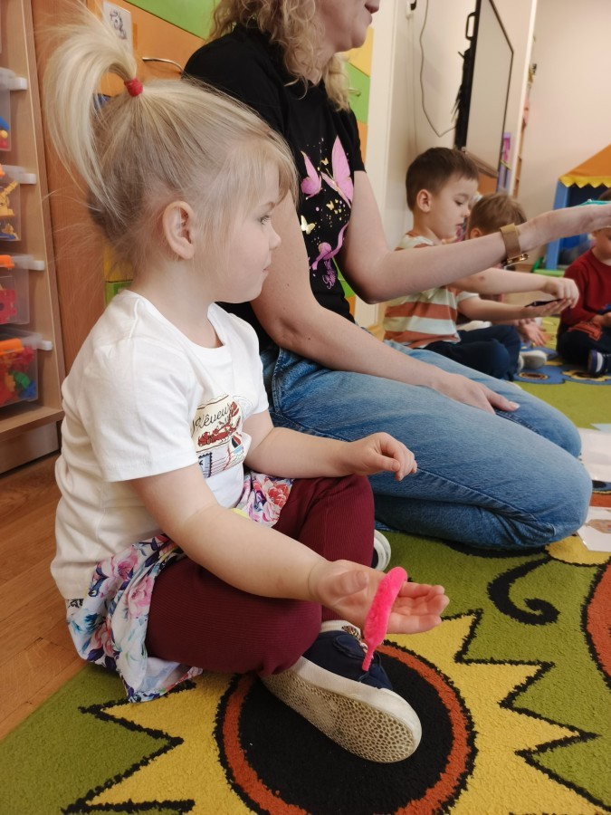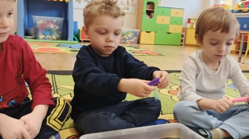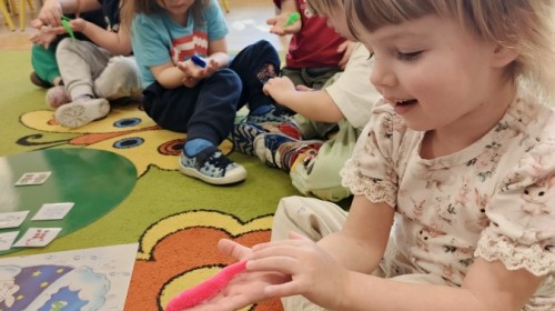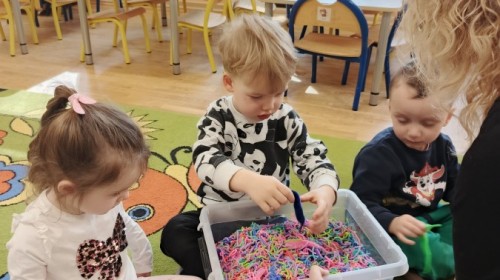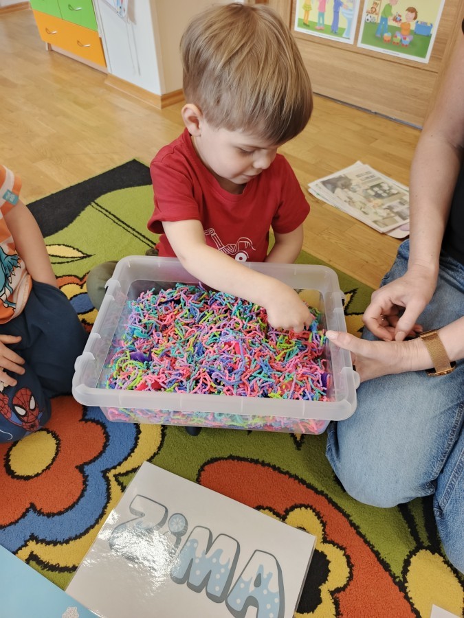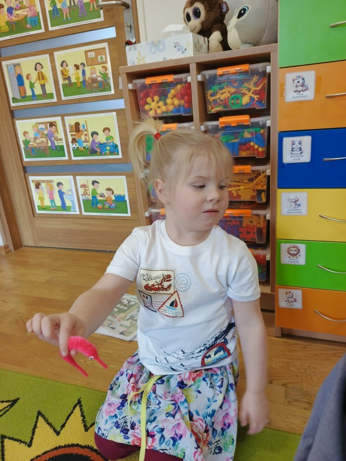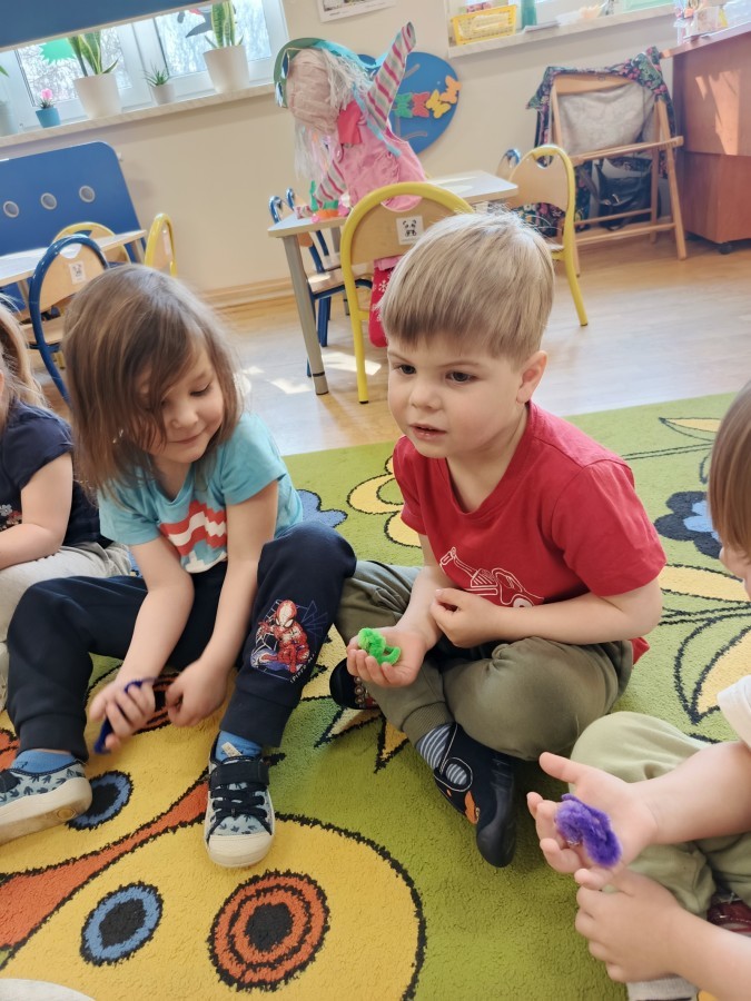 Kolejnym zadaniem było poszukiwanie kolorowych „robaczków”, które sprawiło dzieciom wiele radości i pozwoliło na świetną zabawę sensoryczną