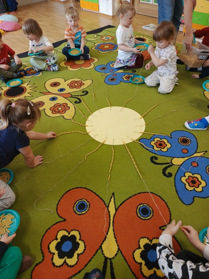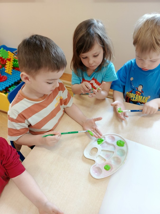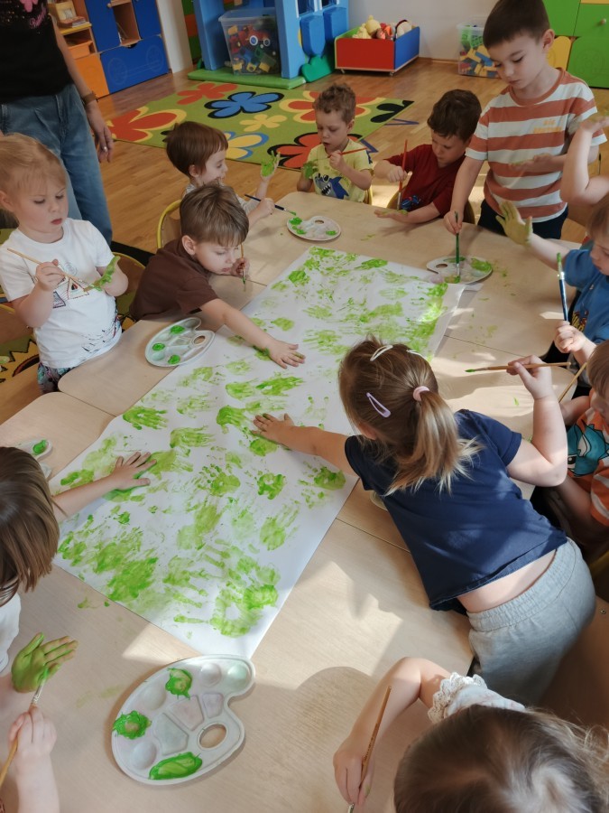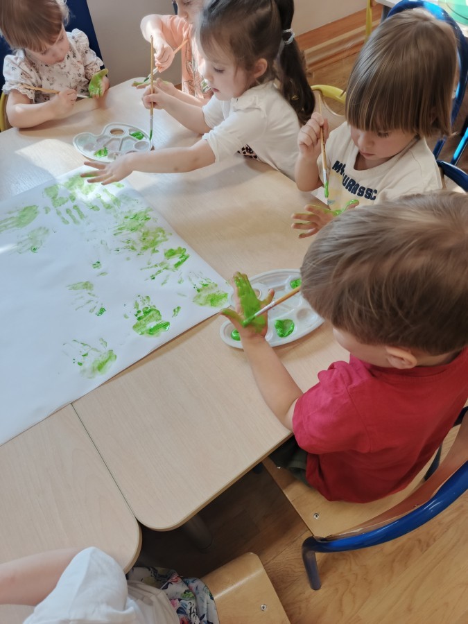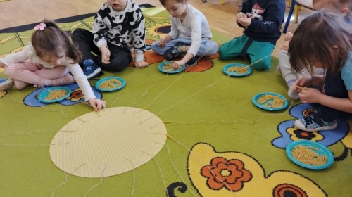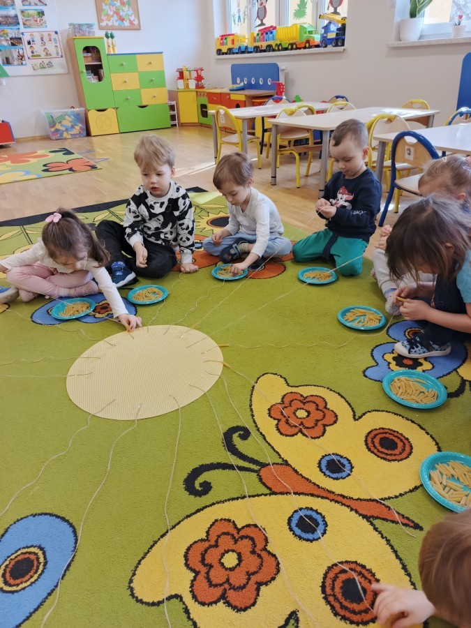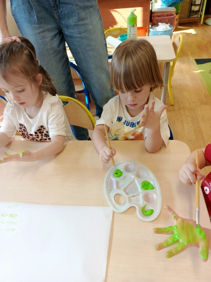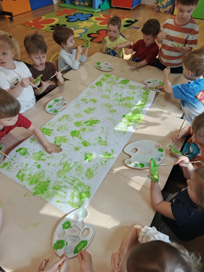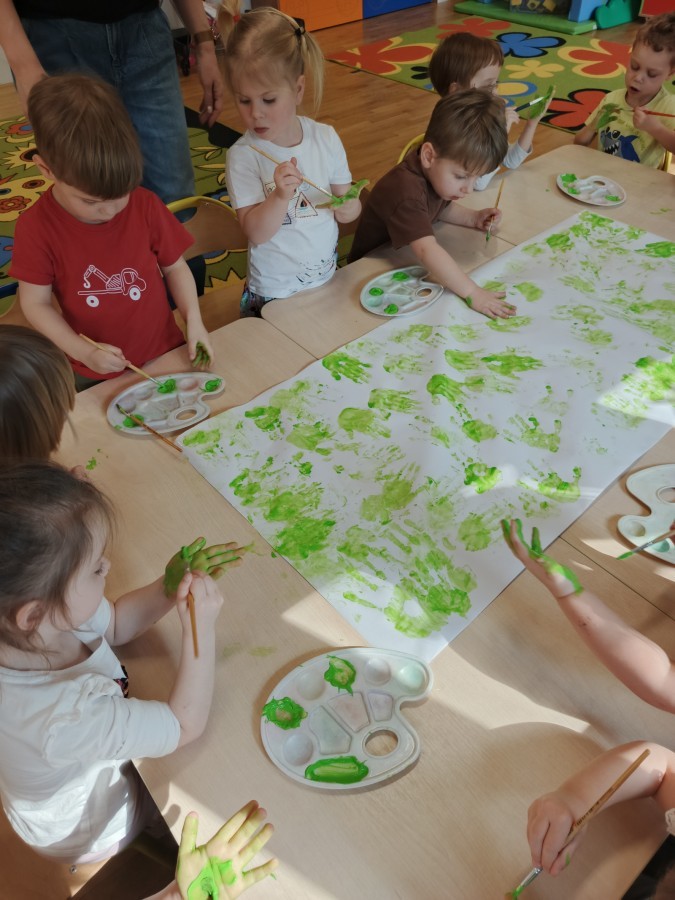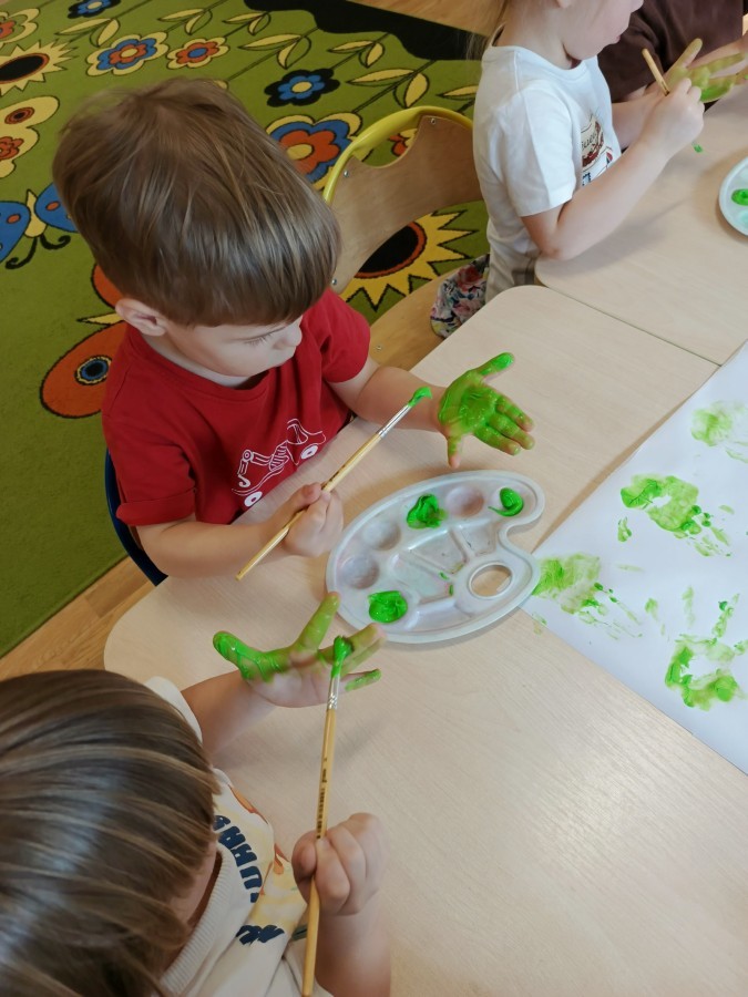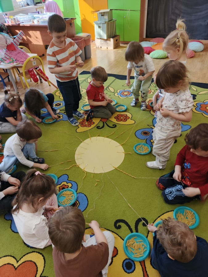 Nie zabrakło również kreatywnych działań – dzieci nawlekały makaron, tworząc słoneczne promienie, a na zakończenie wykonały pracę plastyczną „Wiosenna łąka”. Maluchy malowały swoje dłonie, które po odbiciu zamieniały się w zieloną trawę – bazę dla pięknej, kwitnącej łąki.