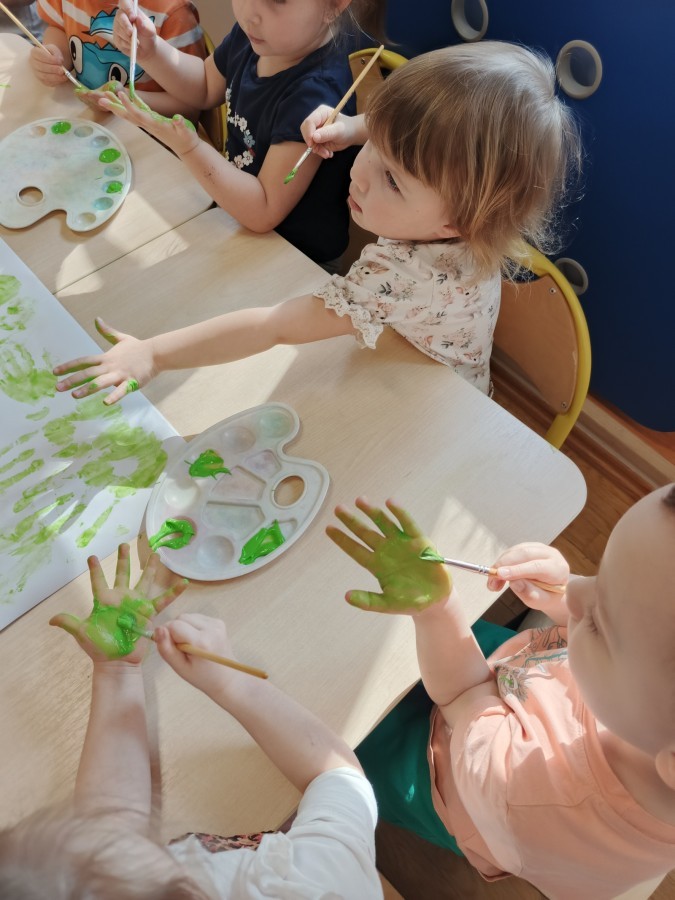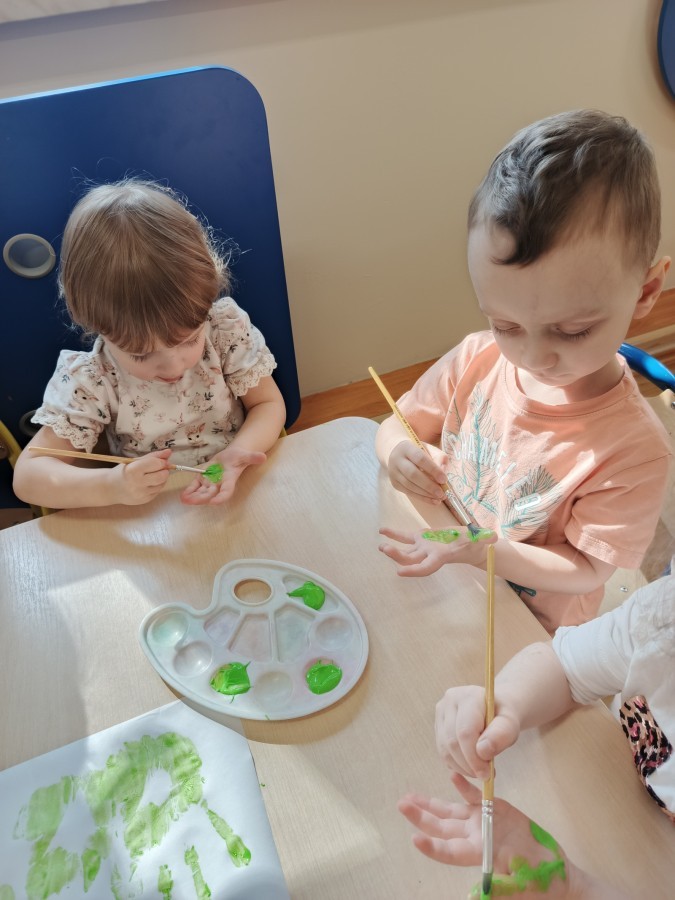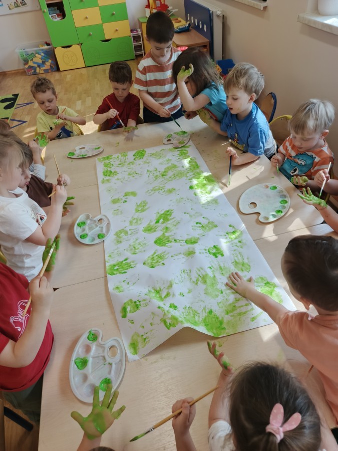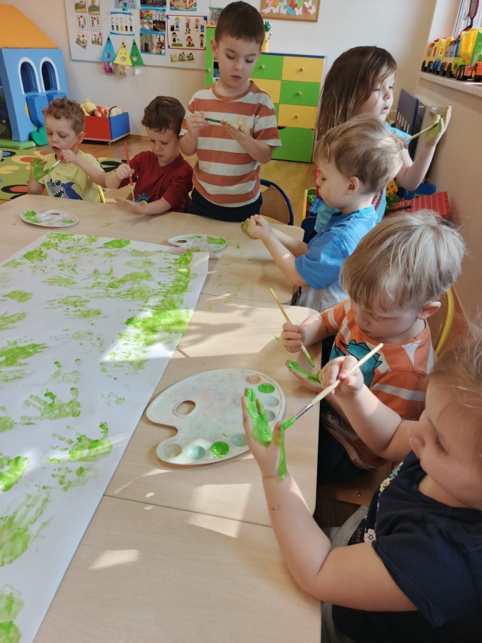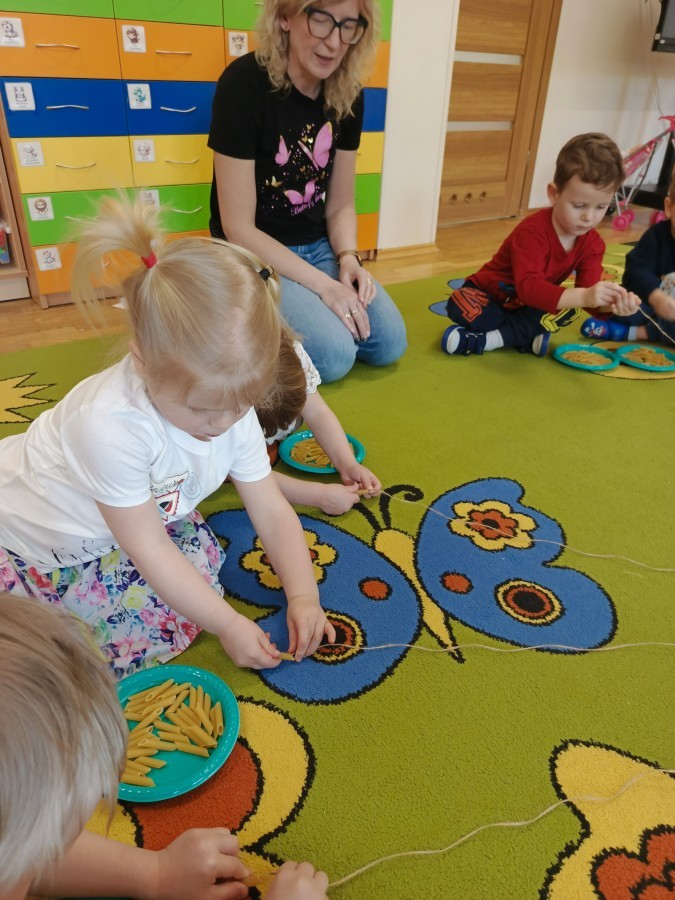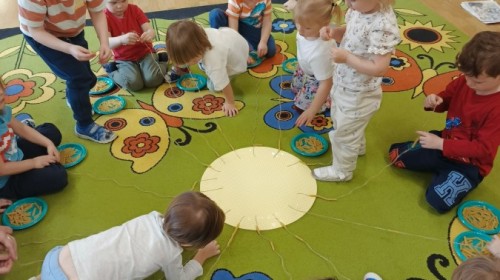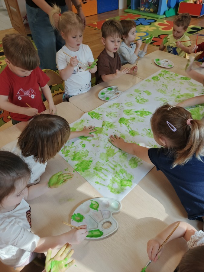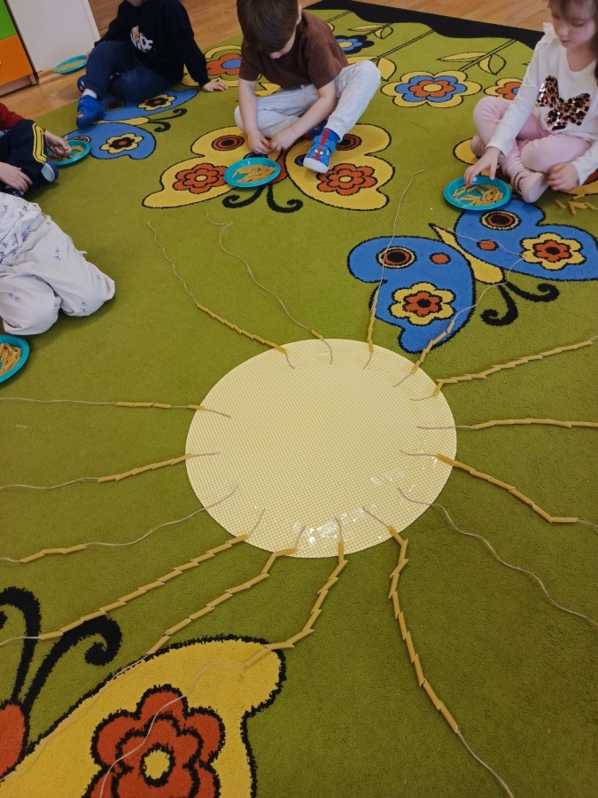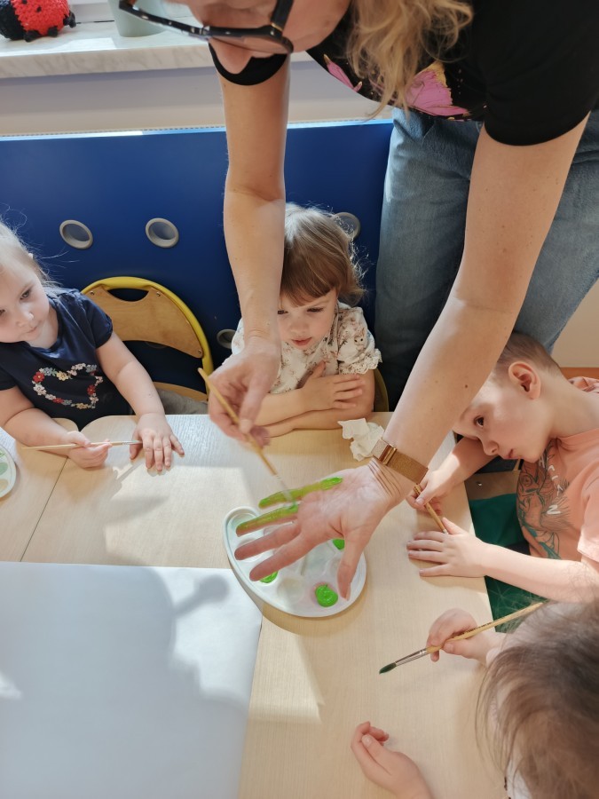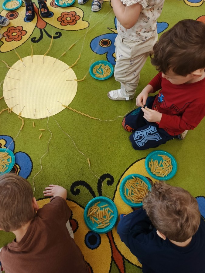 Nie zabrakło również kreatywnych działań – dzieci nawlekały makaron, tworząc słoneczne promienie, a na zakończenie wykonały pracę plastyczną „Wiosenna łąka”. Maluchy malowały swoje dłonie, które po odbiciu zamieniały się w zieloną trawę – bazę dla pięknej, kwitnącej łąki.