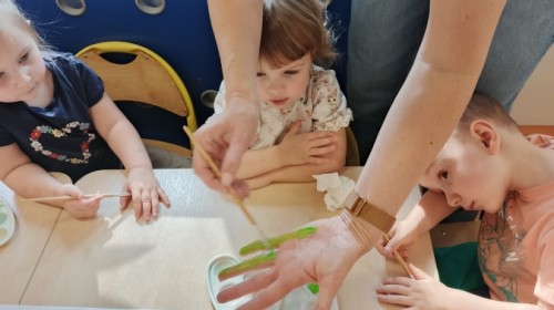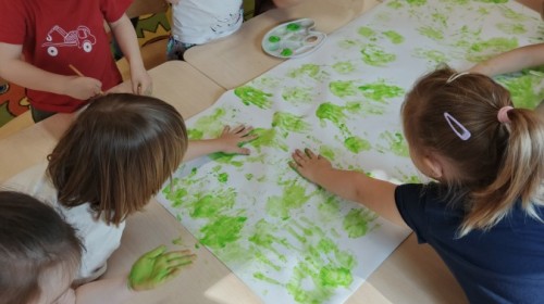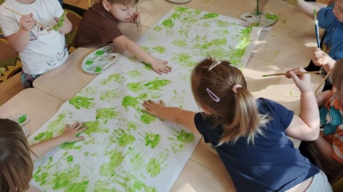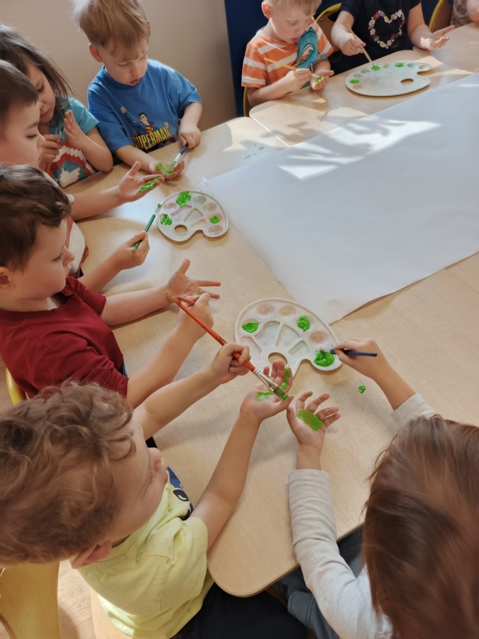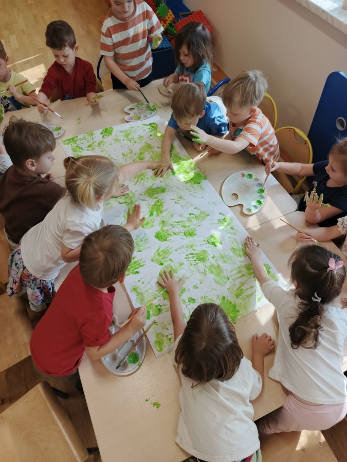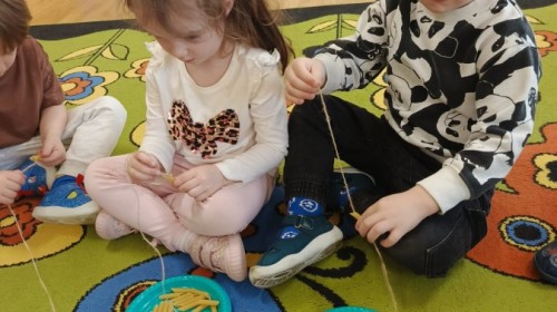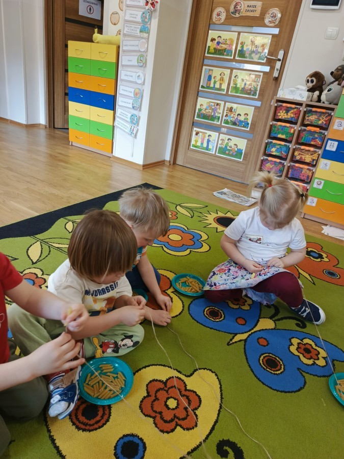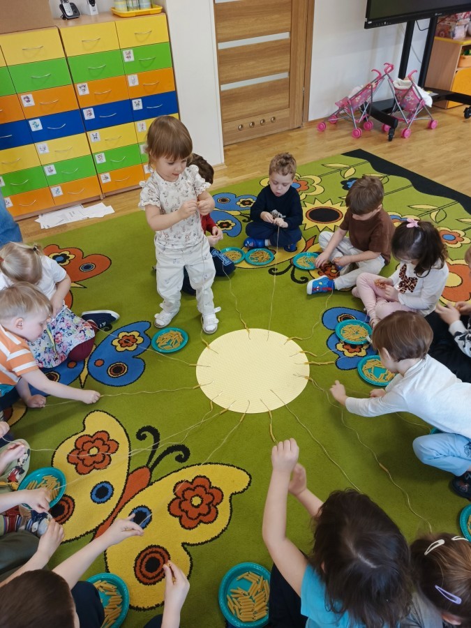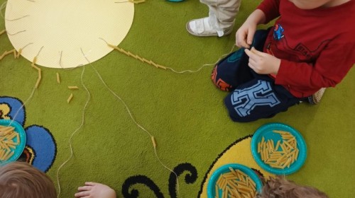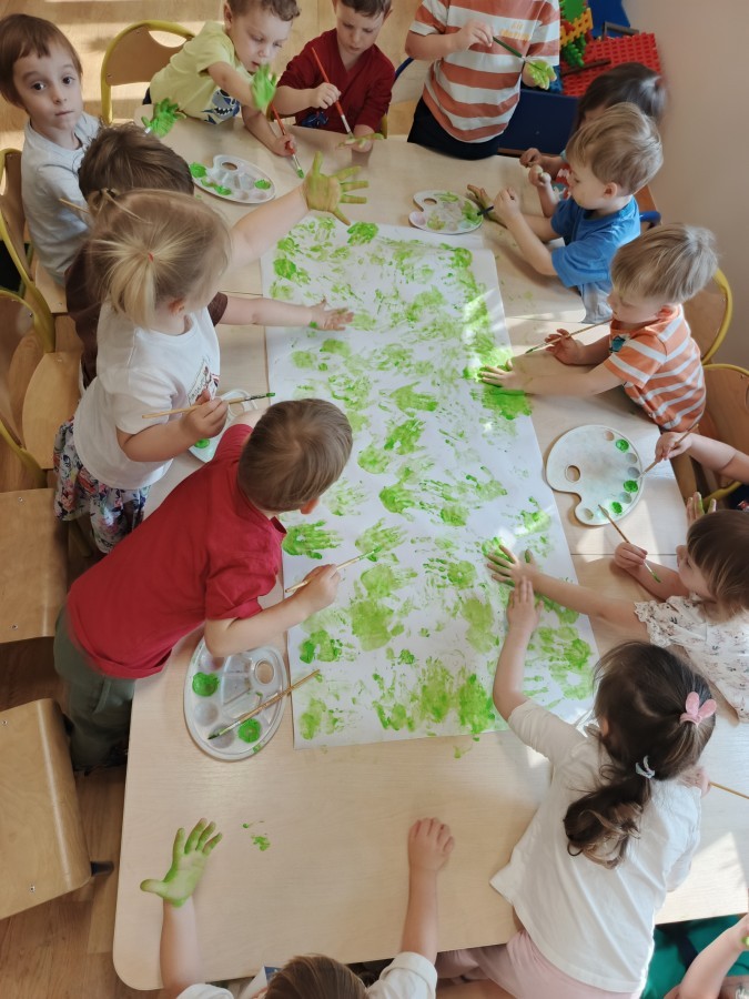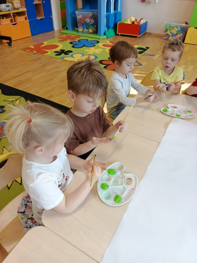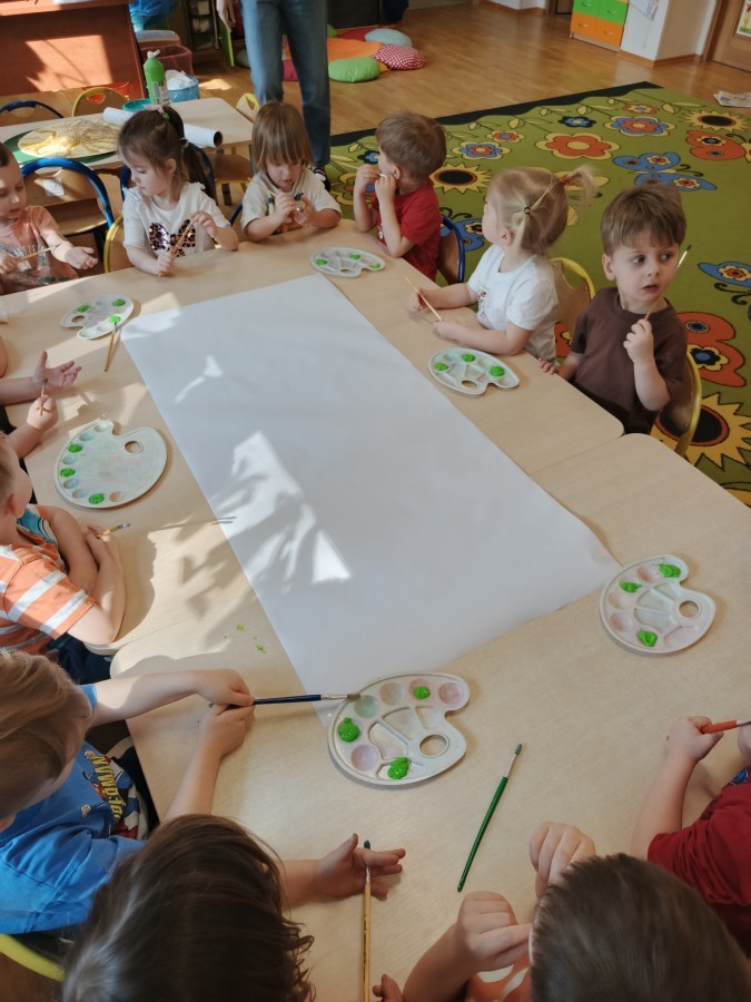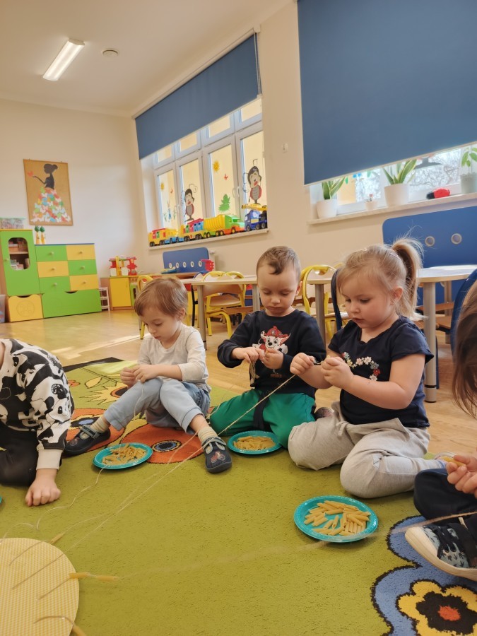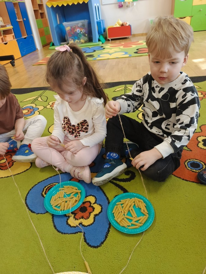Nie zabrakło również kreatywnych działań – dzieci nawlekały makaron, tworząc słoneczne promienie, a na zakończenie wykonały pracę plastyczną „Wiosenna łąka”. Maluchy malowały swoje dłonie, które po odbiciu zamieniały się w zieloną trawę – bazę dla pięknej, kwitnącej łąki.