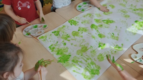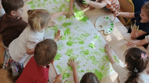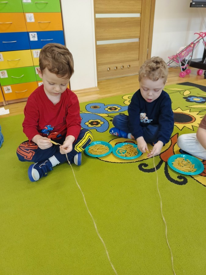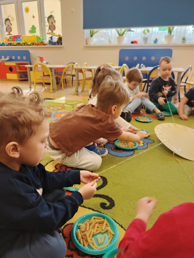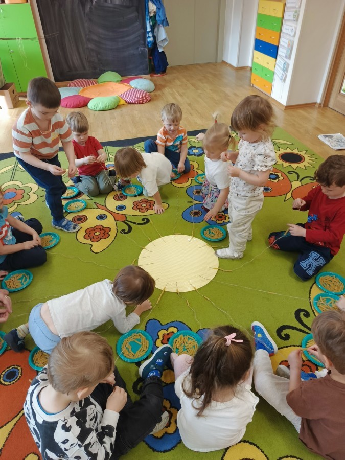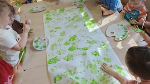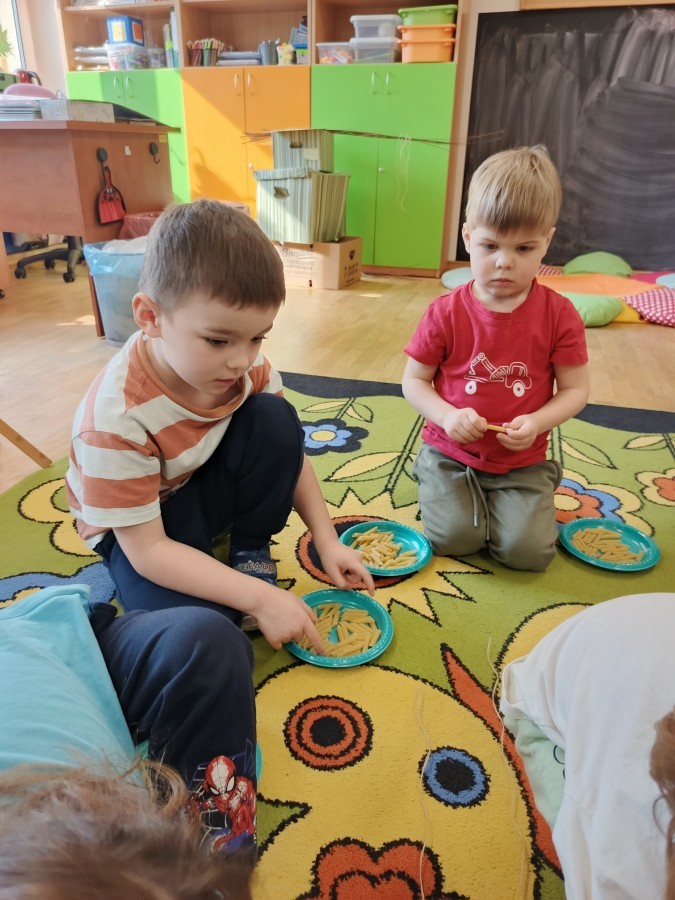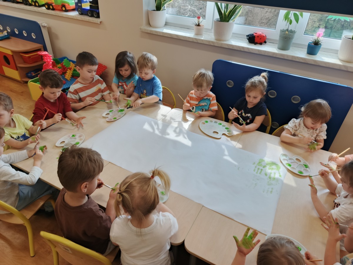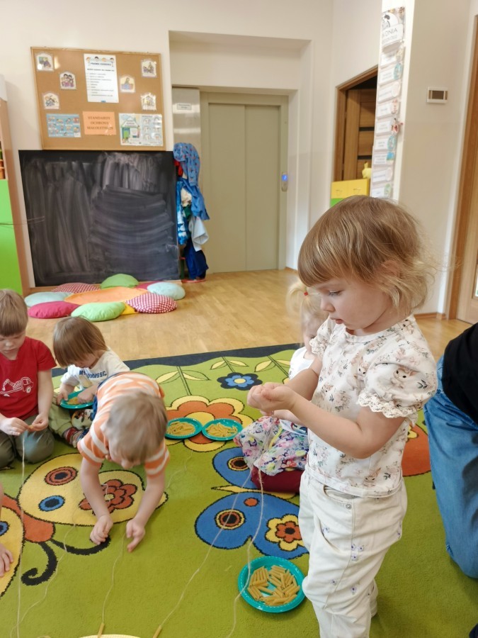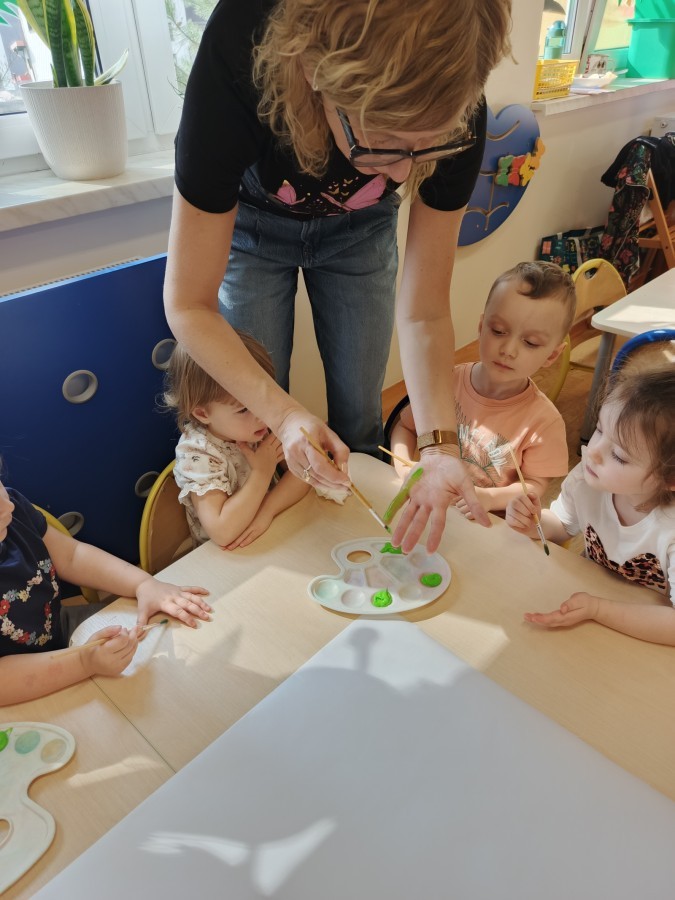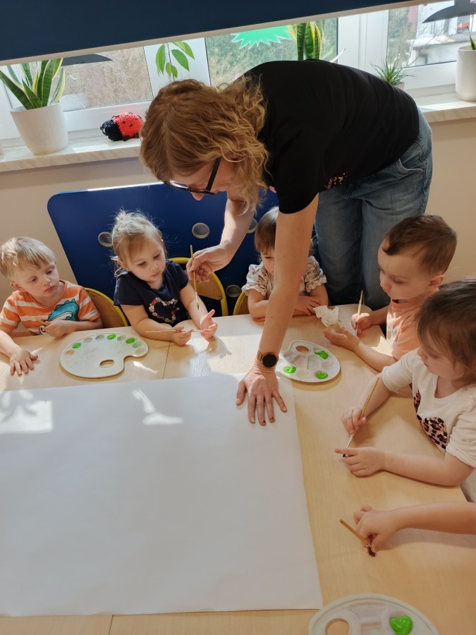 Nie zabrakło również kreatywnych działań – dzieci nawlekały makaron, tworząc słoneczne promienie, a na zakończenie wykonały pracę plastyczną „Wiosenna łąka”. Maluchy malowały swoje dłonie, które po odbiciu zamieniały się w zieloną trawę – bazę dla pięknej, kwitnącej łąki.