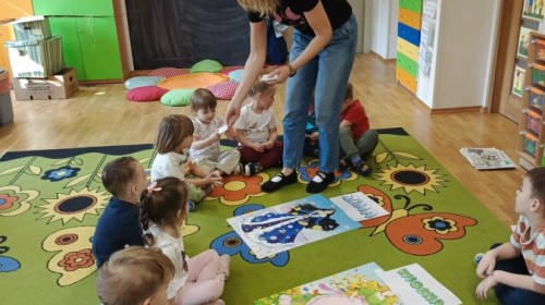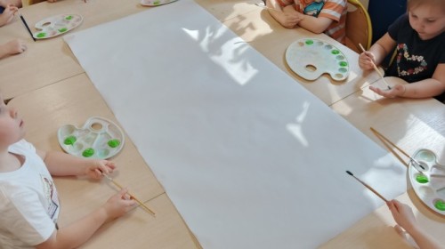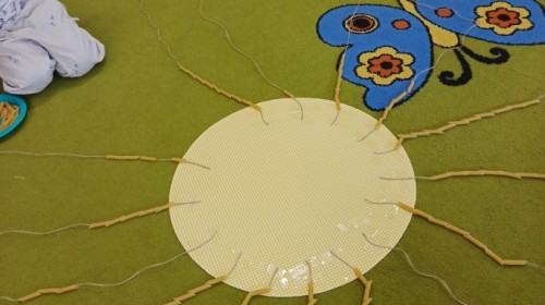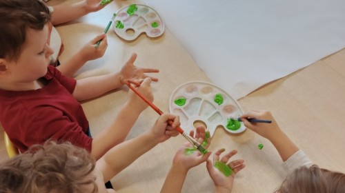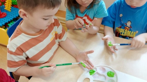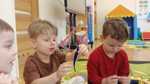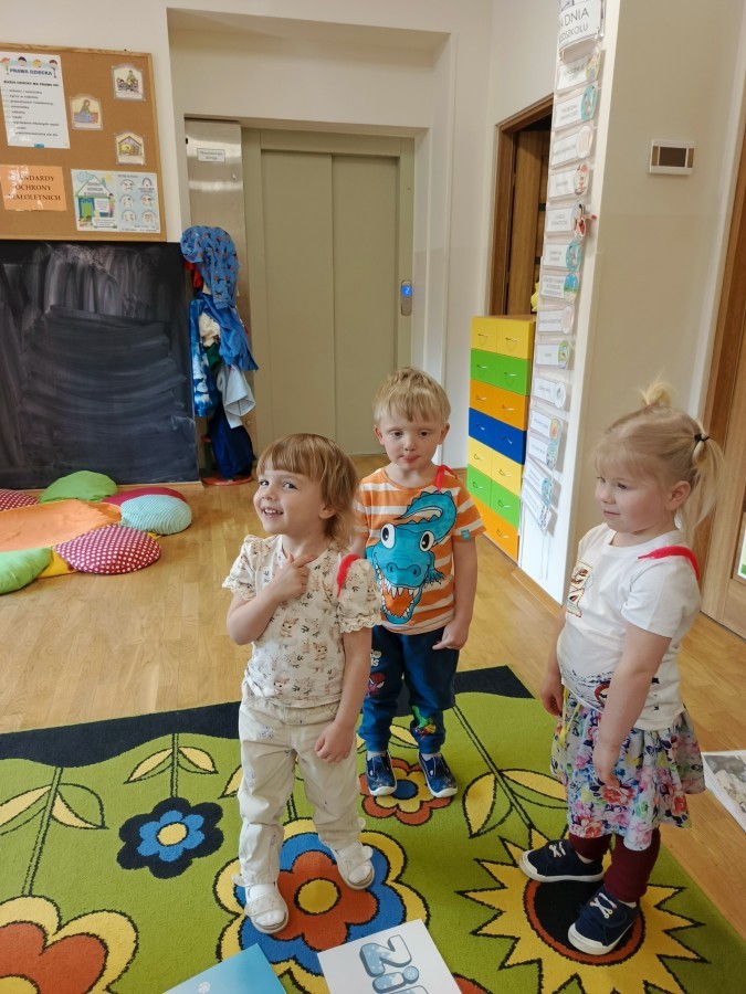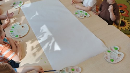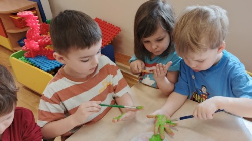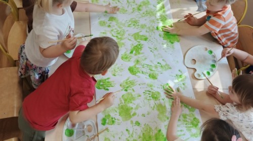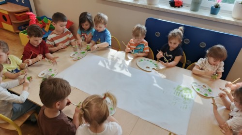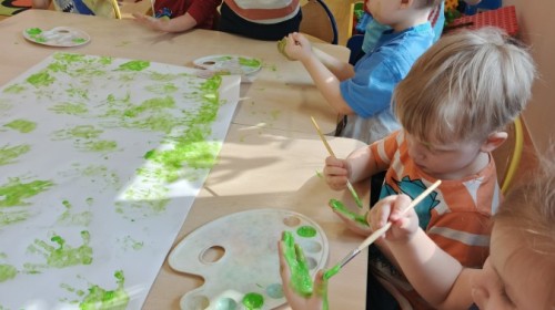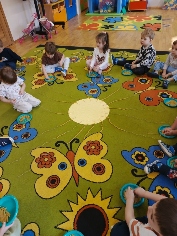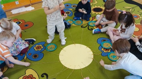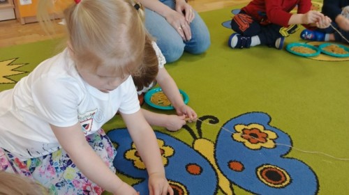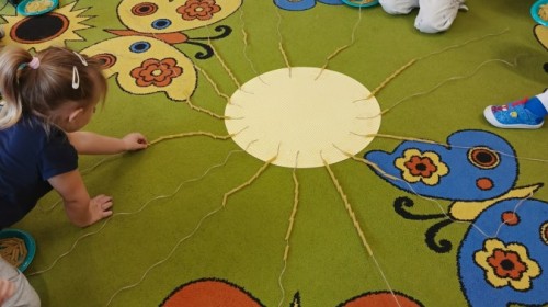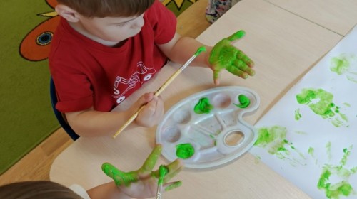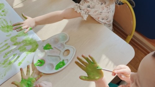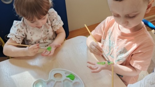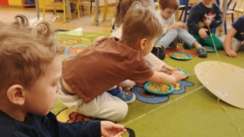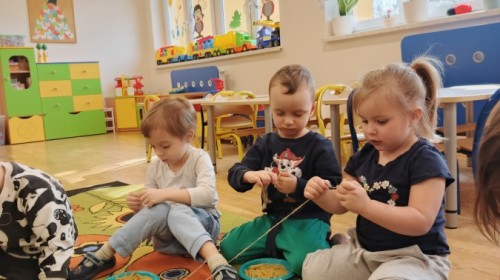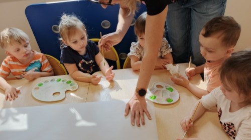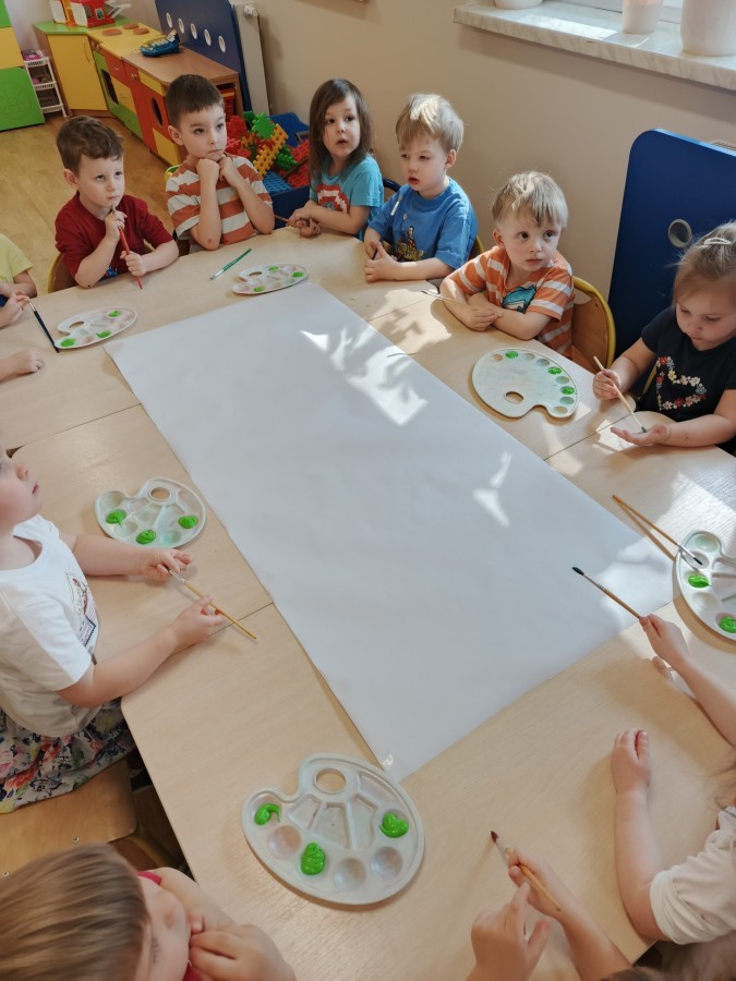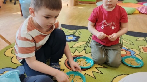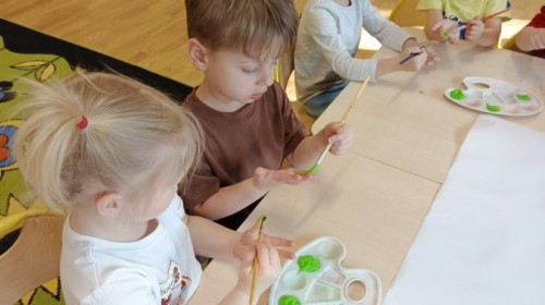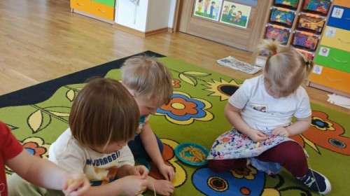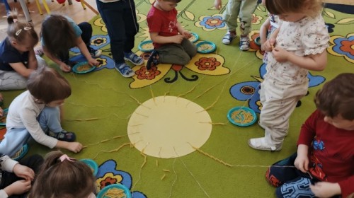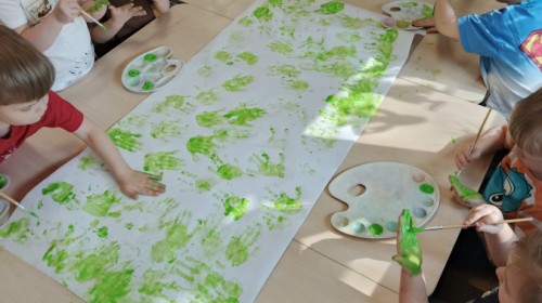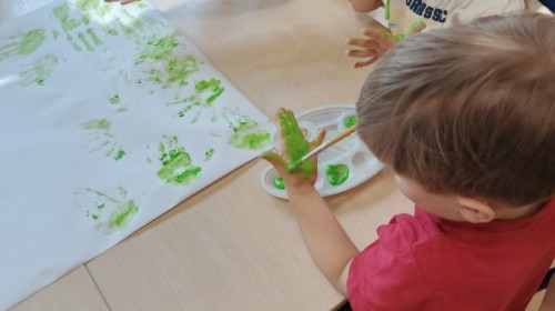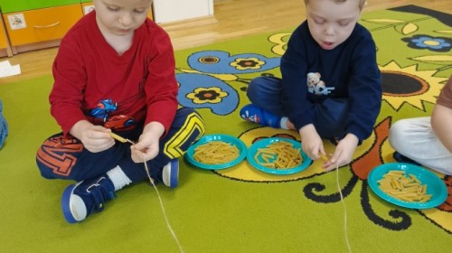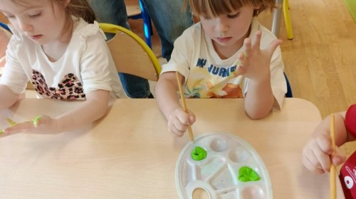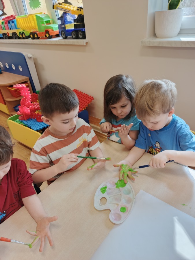 Nie zabrakło również kreatywnych działań – dzieci nawlekały makaron, tworząc słoneczne promienie, a na zakończenie wykonały pracę plastyczną „Wiosenna łąka”. Maluchy malowały swoje dłonie, które po odbiciu zamieniały się w zieloną trawę – bazę dla pięknej, kwitnącej łąki.