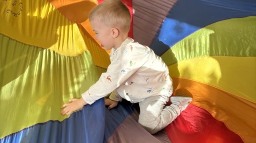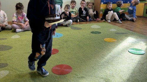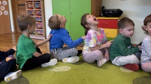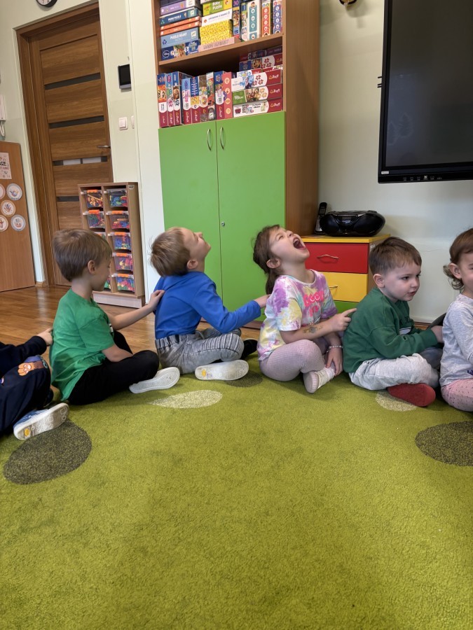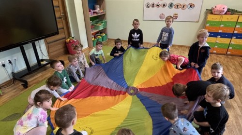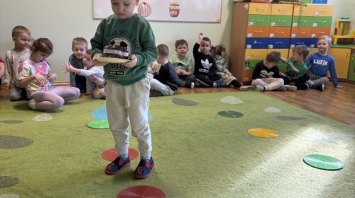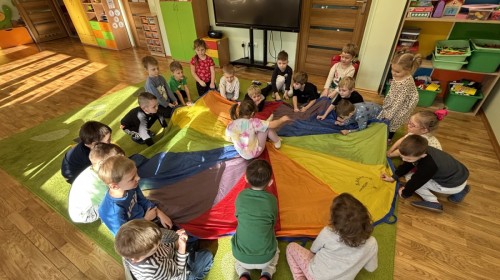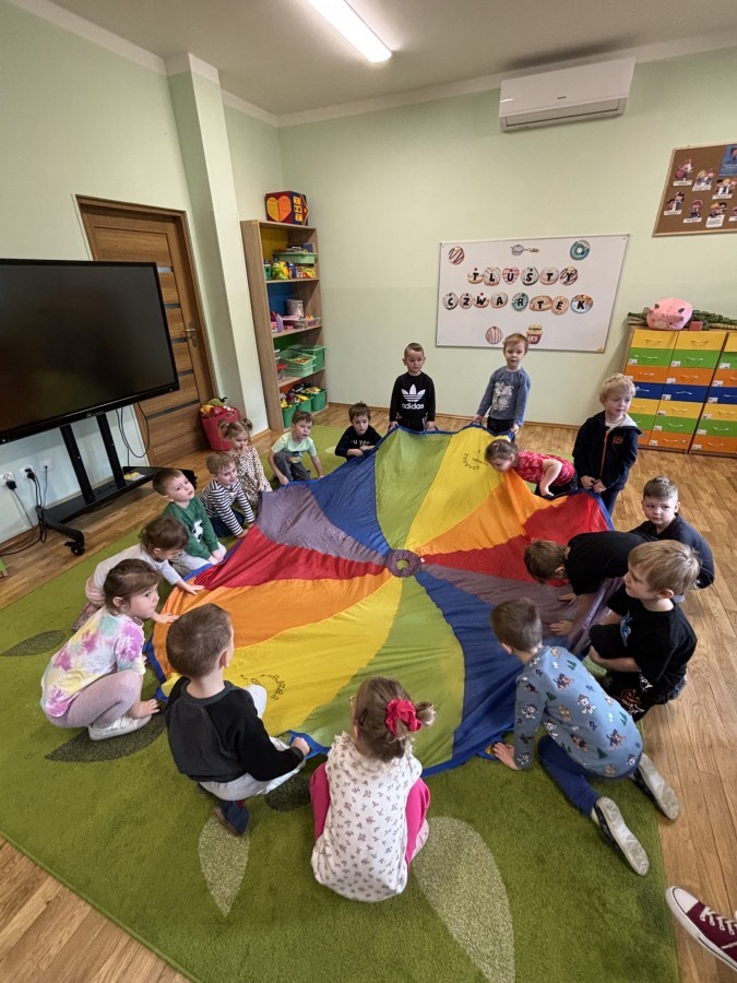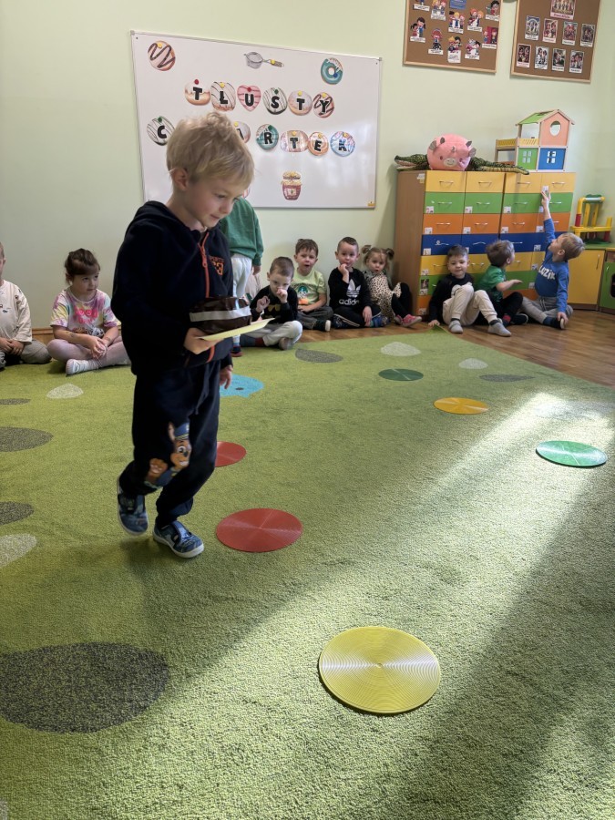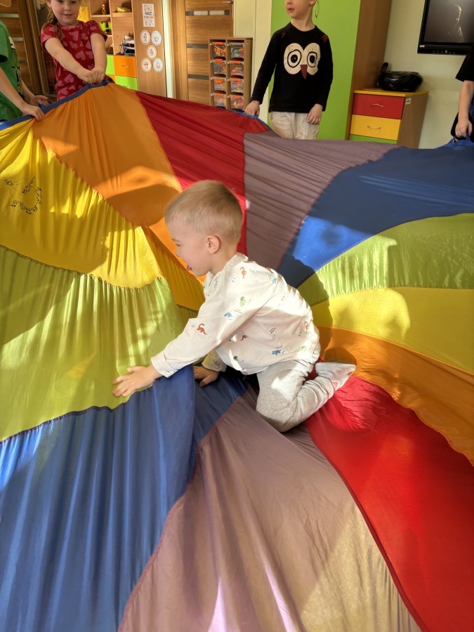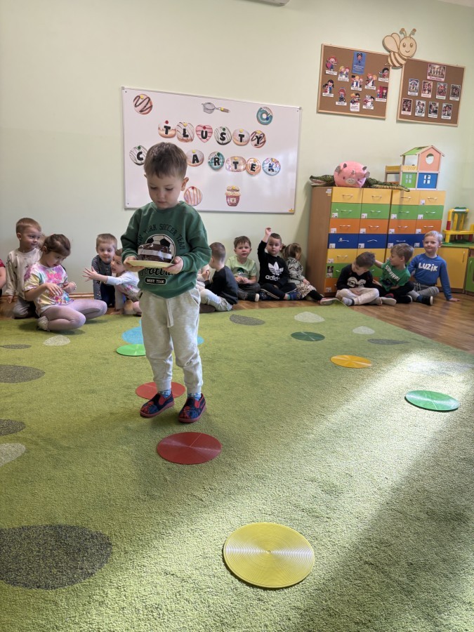 Nie zabrakło również aktywności ruchowych – dzieci dzielnie pokonały slalom z pączkiem, wykonały relaksacyjny masażyk „Mały pączek” oraz zagrały w „pączkowe memory”. Było dużo śmiechu i dobrej zabawy podczas zabaw z chustą animacyjną. Dzieci zamieniły się nawet w słodki krem do pączka przy piosence „Pączek z chusty”, co sprawiło im ogromną radość!