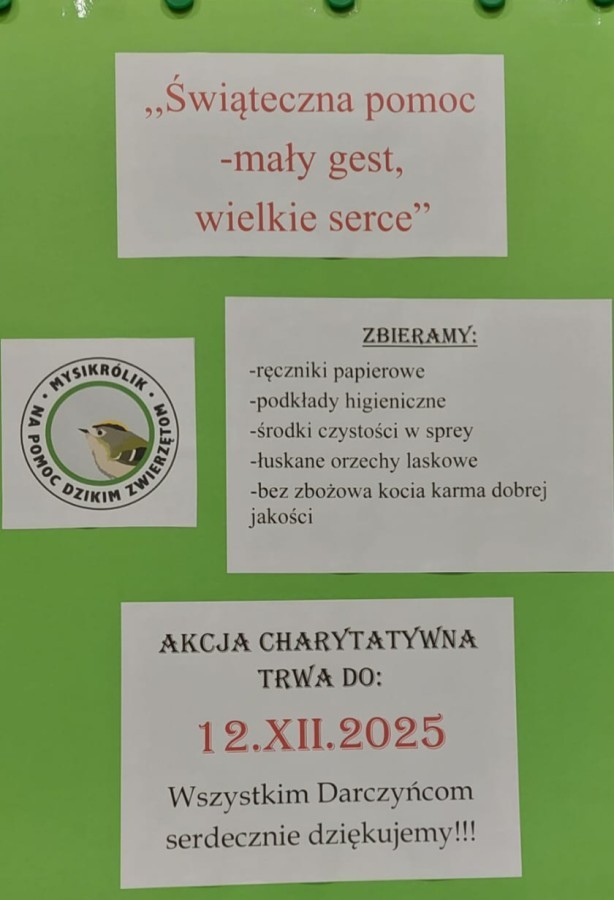 W naszym przedszkolu odbyła się akcja charytatywna ,,Świąteczna pomoc- mały gest, wielkie serce" dla Ośrodka Rehabilitacji Dzikich Zwierząt ,,Mysikrólik" w Bielsku-Białej. Dary zbieraliśmy w okresie 1-12. XII.