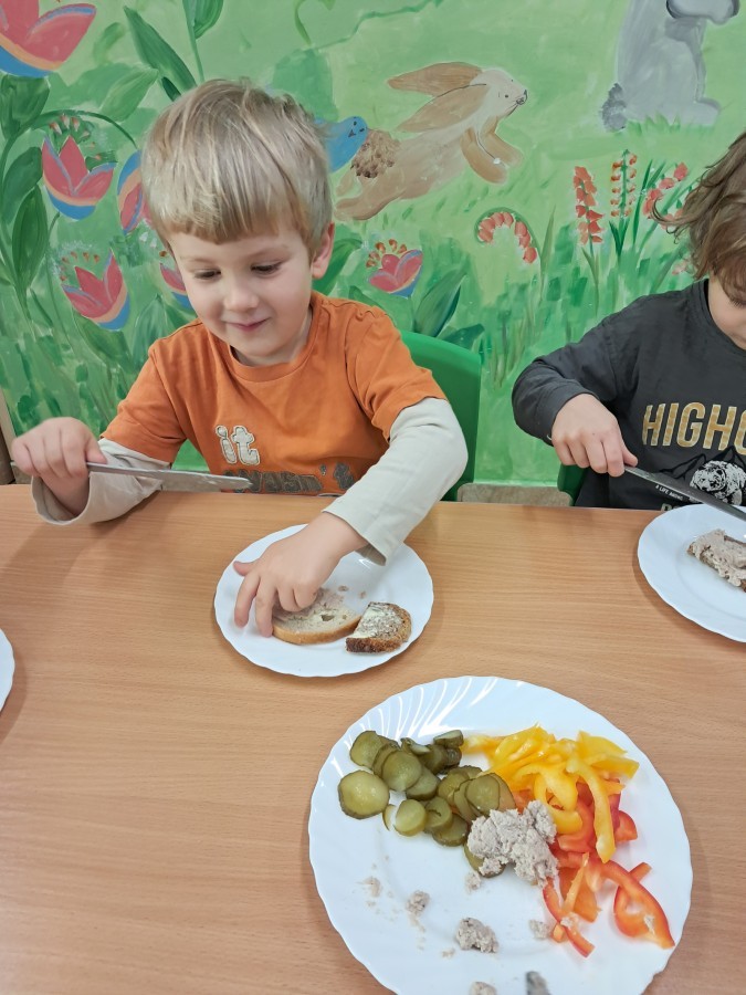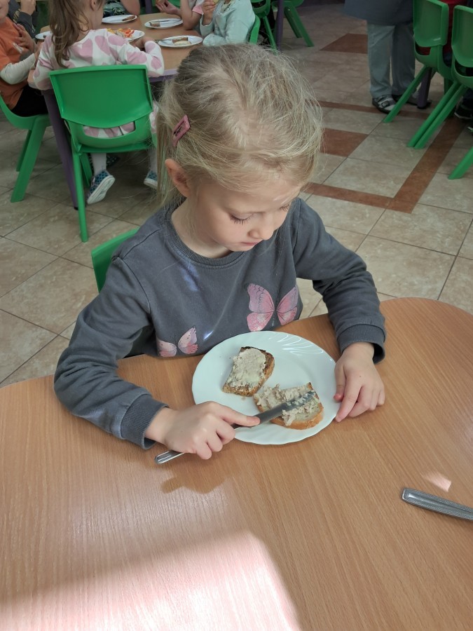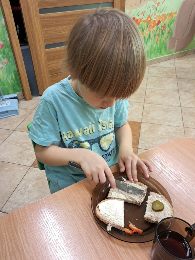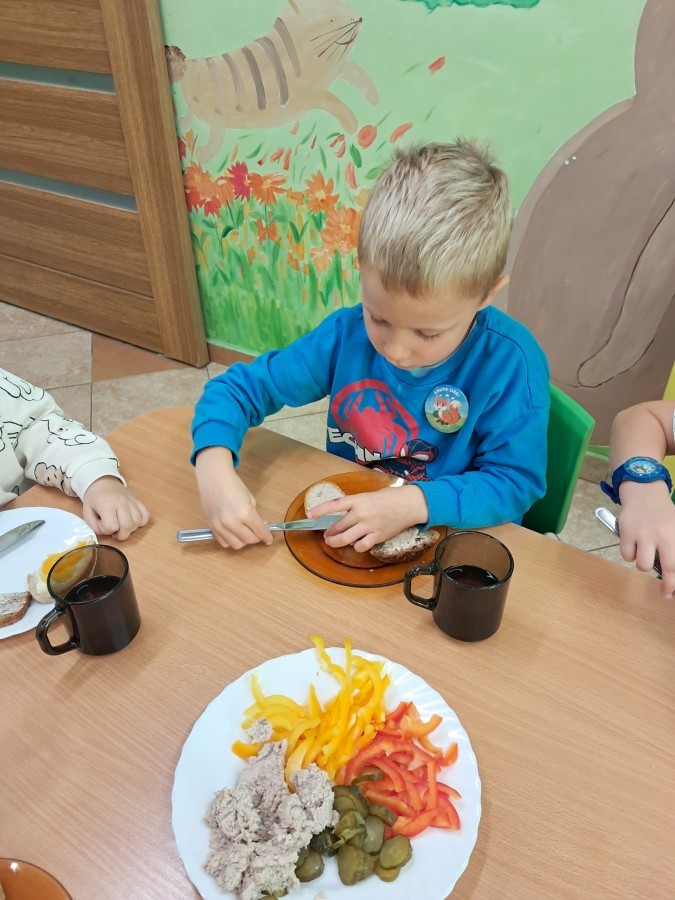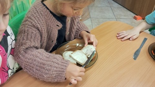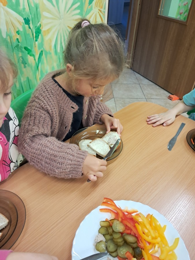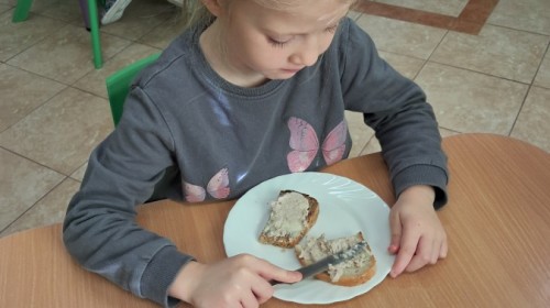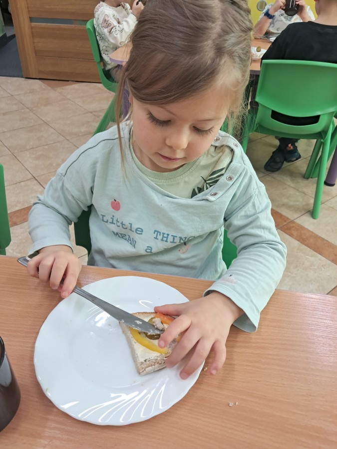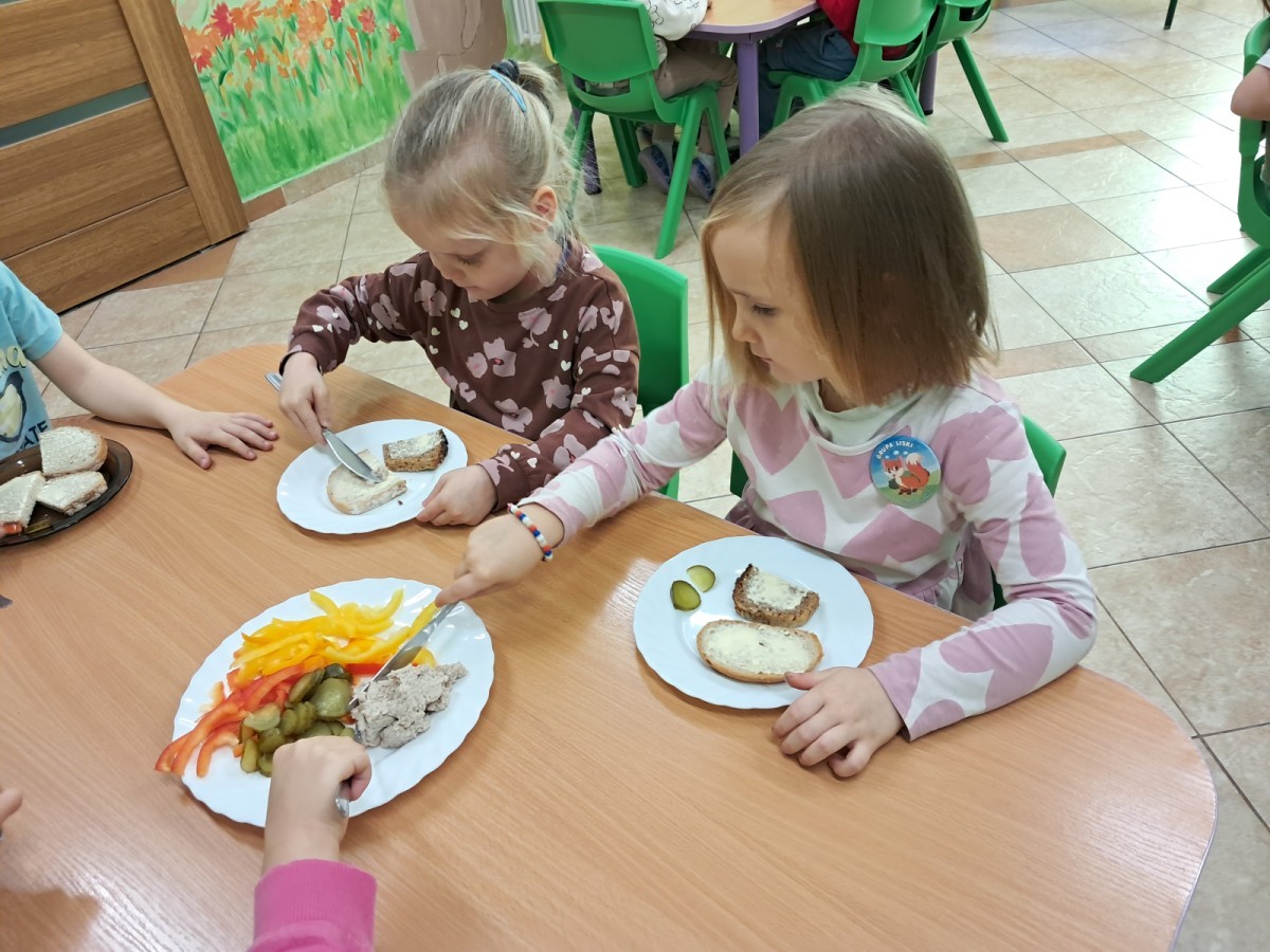 Podczas samodzielnego przygotowania śniadanka Liski estetycznie sporządziły sobie kanapki oraz ćwiczyły umiejętność posługiwania się nożem. Tak wykonany posiłek szybko znikał z talerza, a dzieci opuściły jadalnię z pełnymi brzuszkami i uśmiechami na twarzach.