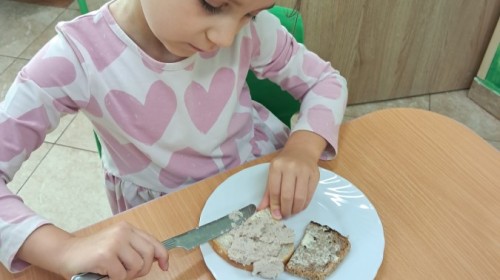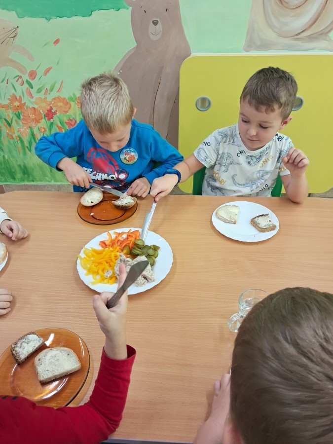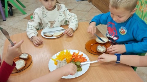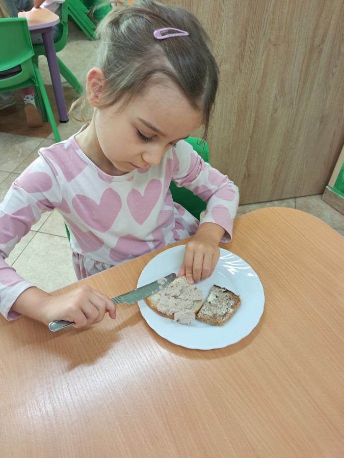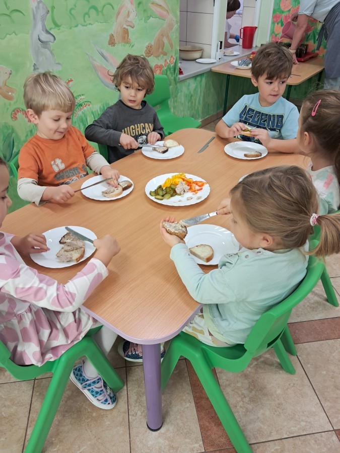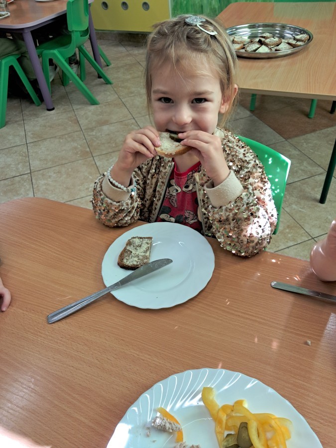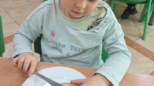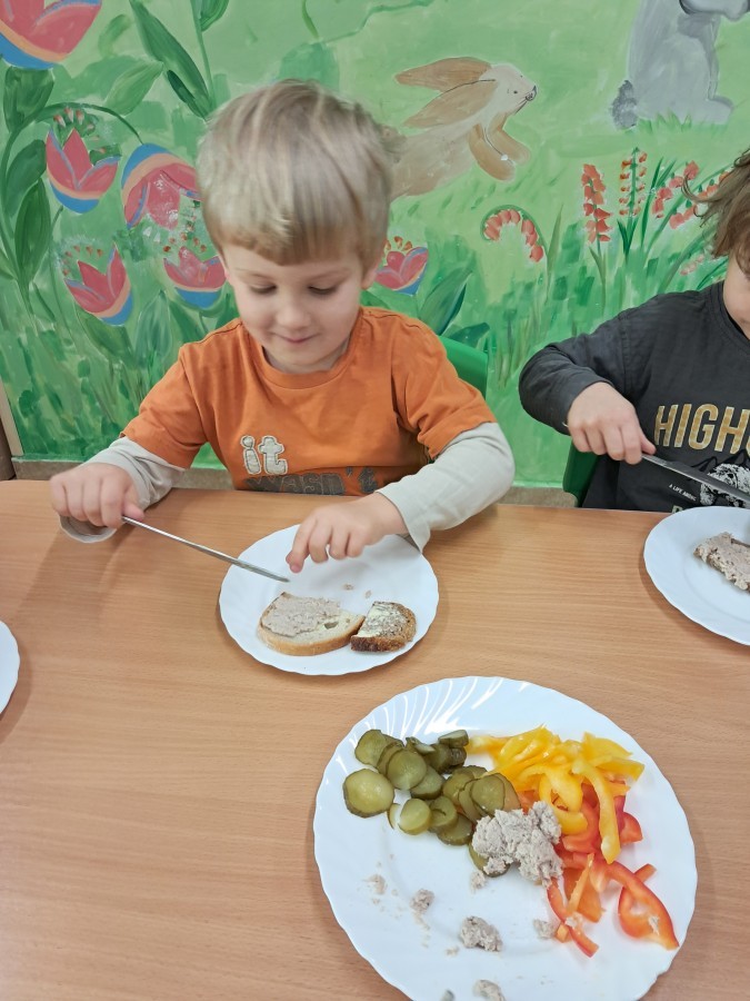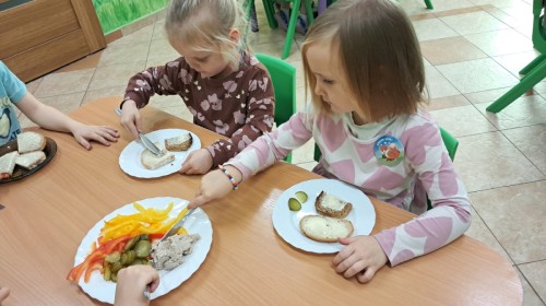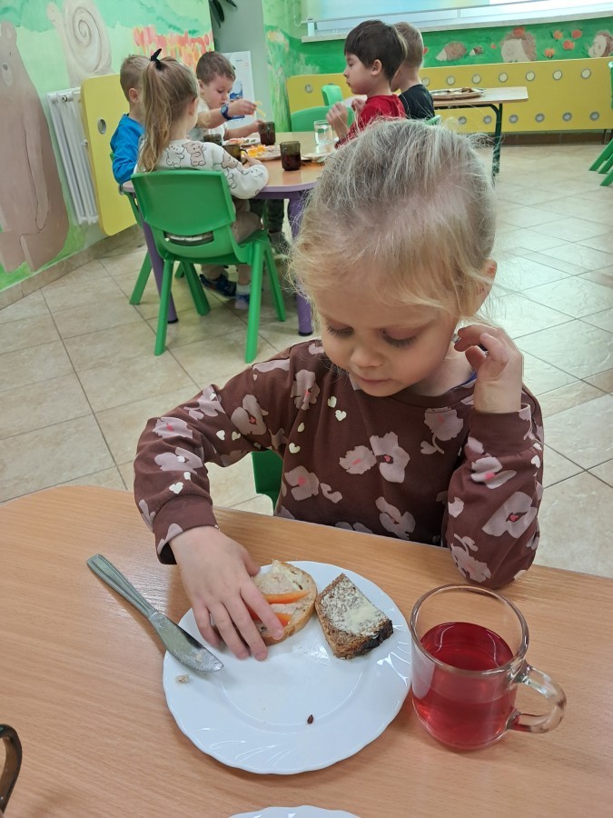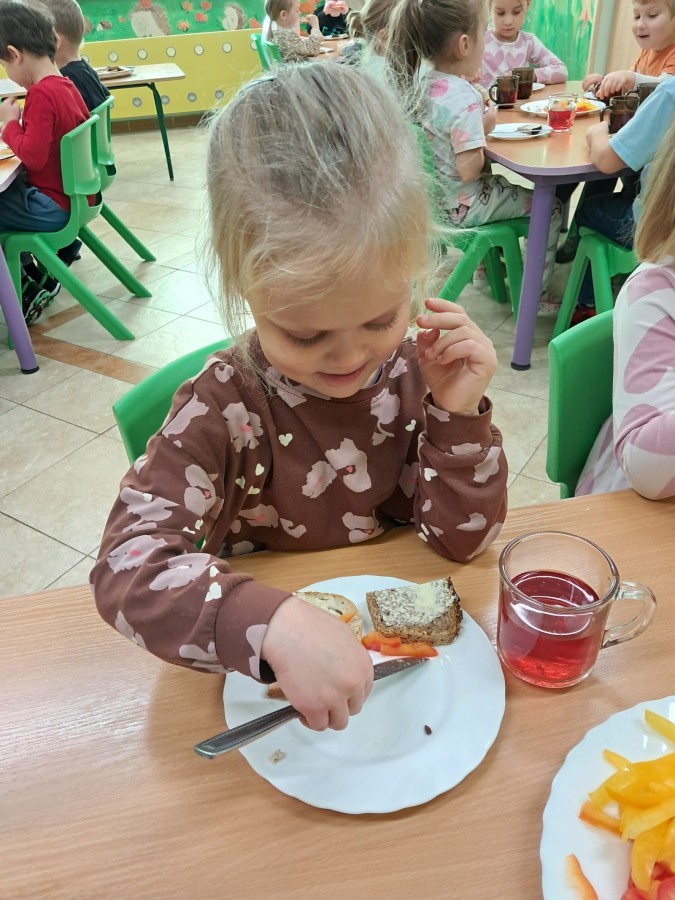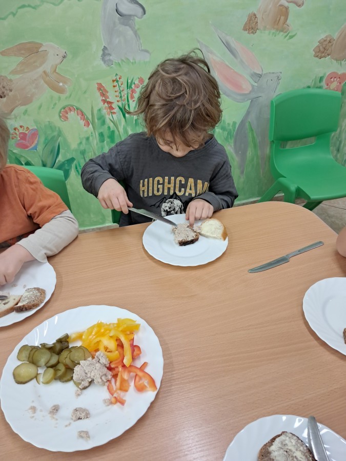 Podczas samodzielnego przygotowania śniadanka Liski estetycznie sporządziły sobie kanapki oraz ćwiczyły umiejętność posługiwania się nożem. Tak wykonany posiłek szybko znikał z talerza, a dzieci opuściły jadalnię z pełnymi brzuszkami i uśmiechami na twarzach.
