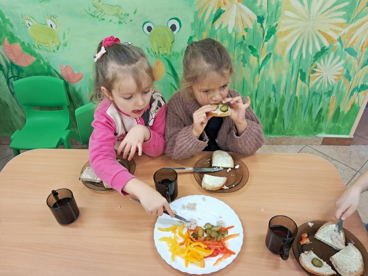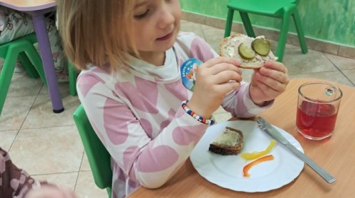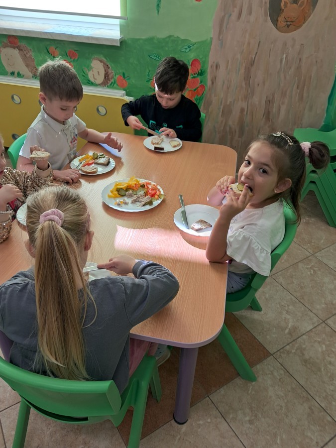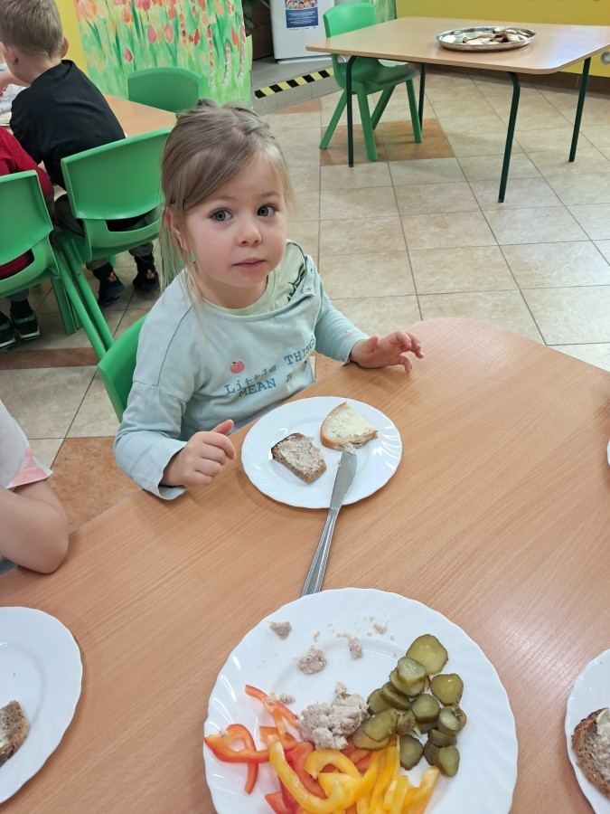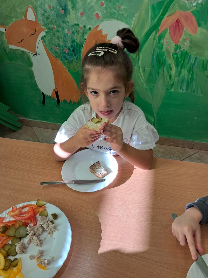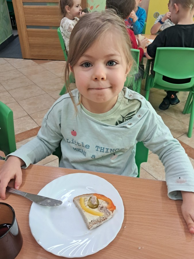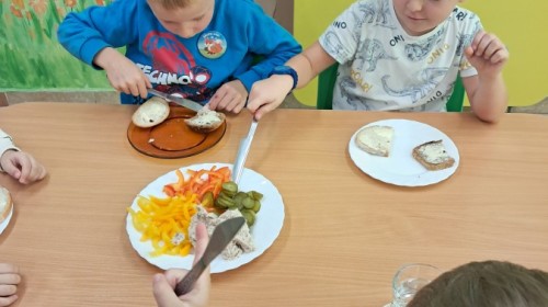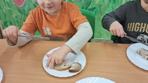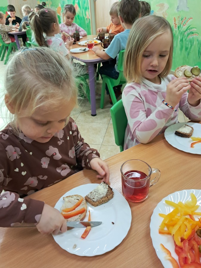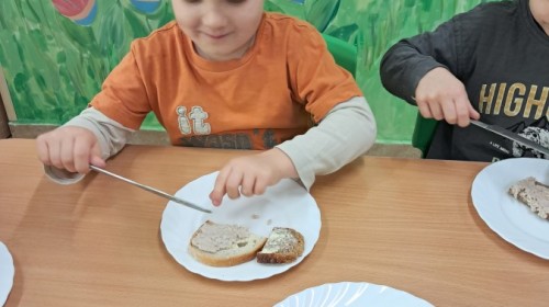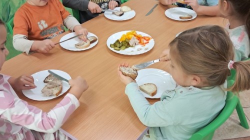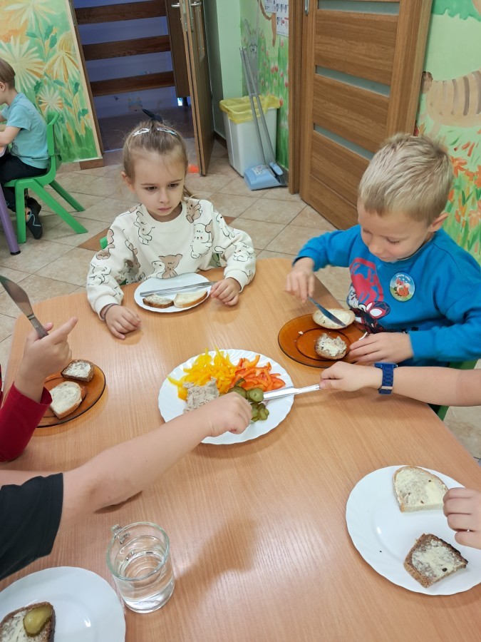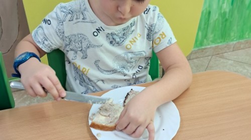 Podczas samodzielnego przygotowania śniadanka Liski estetycznie sporządziły sobie kanapki oraz ćwiczyły umiejętność posługiwania się nożem. Tak wykonany posiłek szybko znikał z talerza, a dzieci opuściły jadalnię z pełnymi brzuszkami i uśmiechami na twarzach.